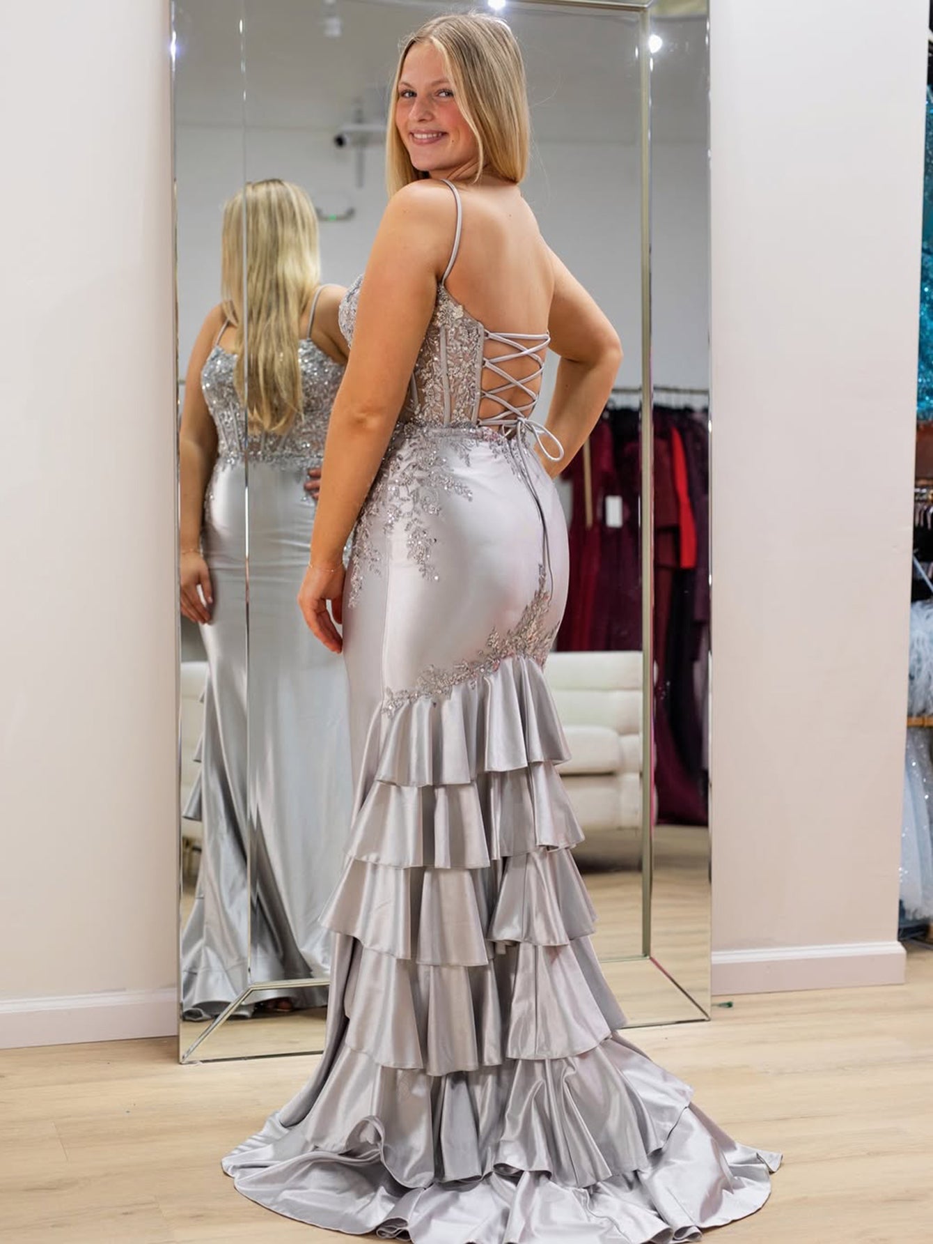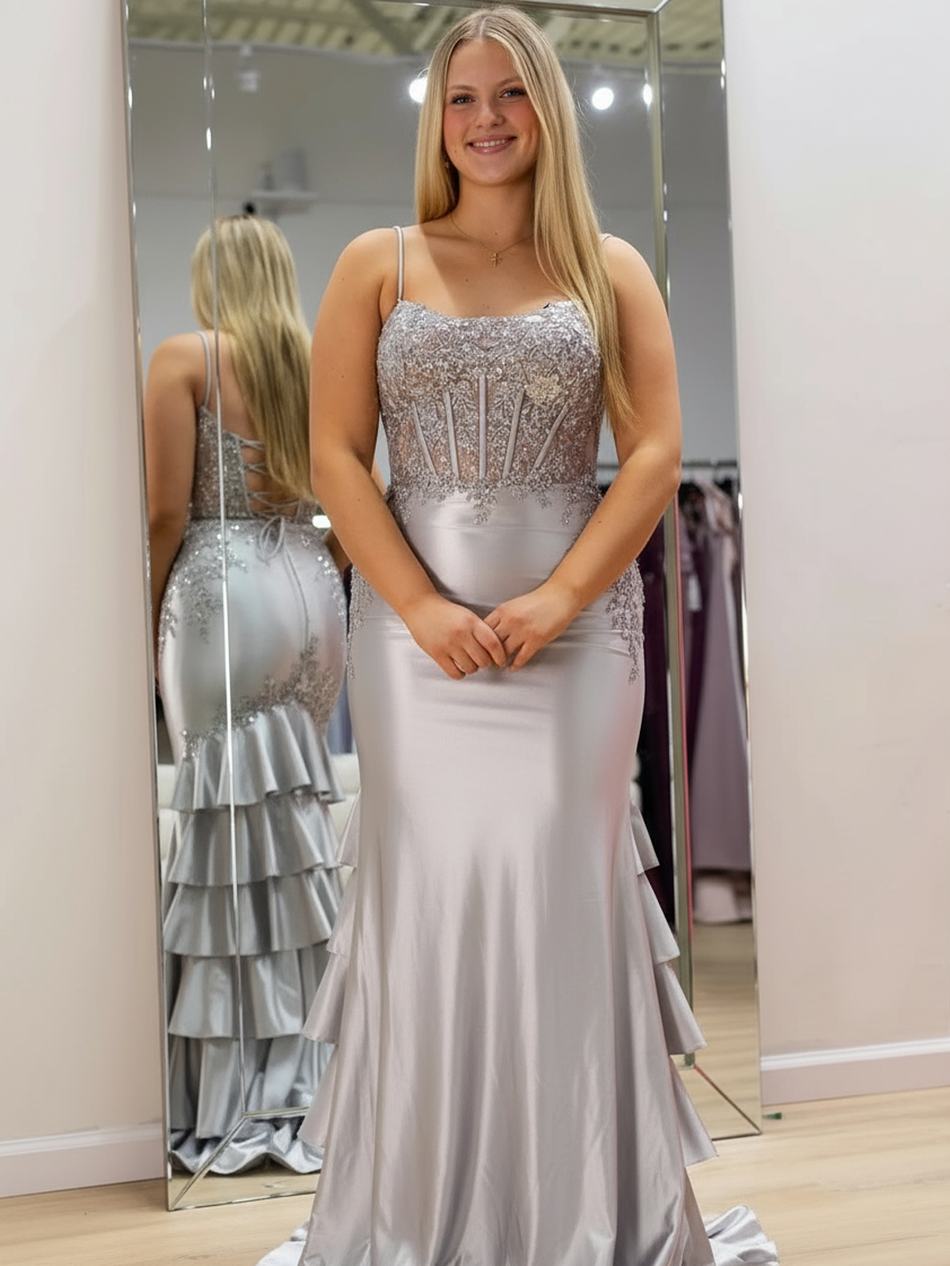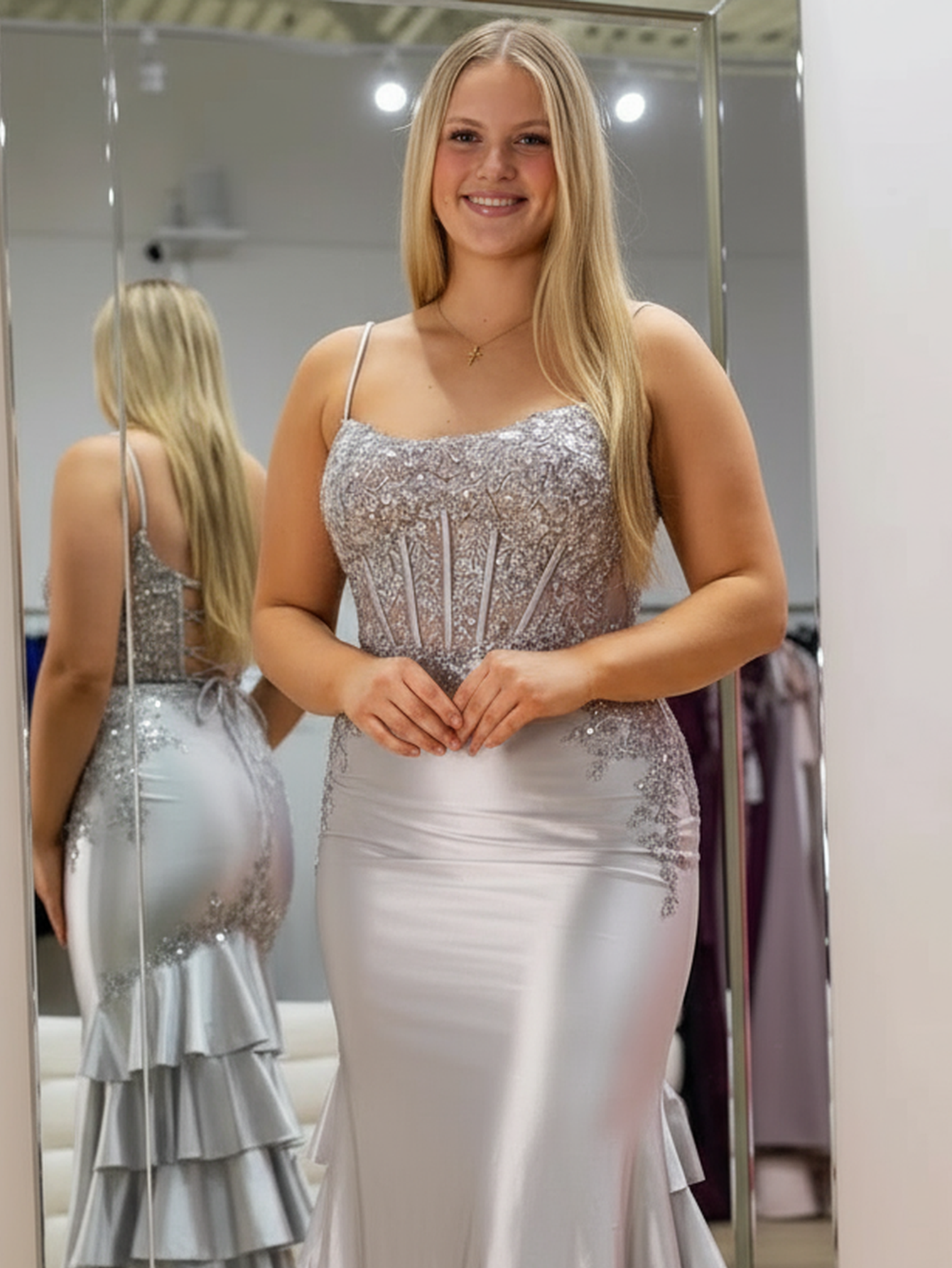 Spaghetti Strap Lace Up Beading Illusion Pleated Bodice Mermaid Prom Dress - Silver