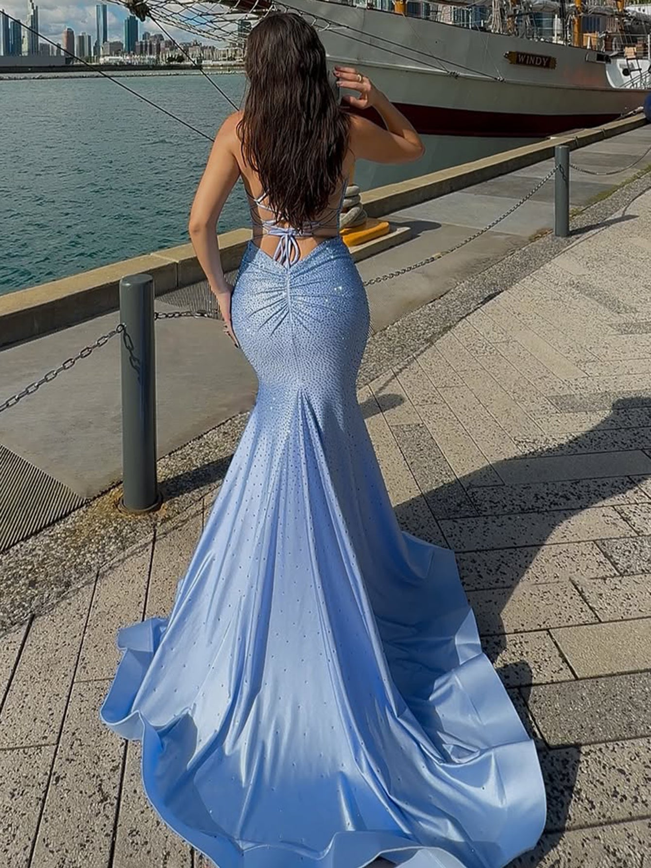 Sparkly Spaghetti Strap Beading Pleated Lace Up Bodice Mermaid Prom Dress - Sky Blue