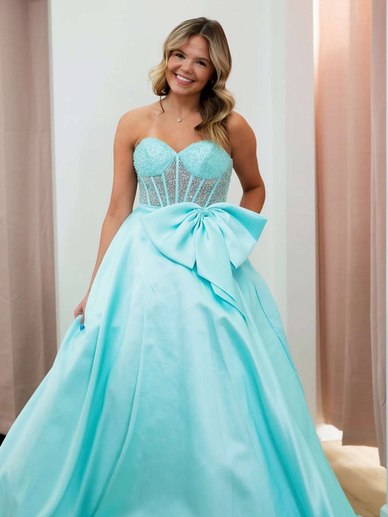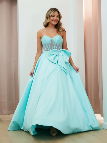 Strapless Big Bow Illusion Bodice Ball Gown Prom Dress - Sky Blue