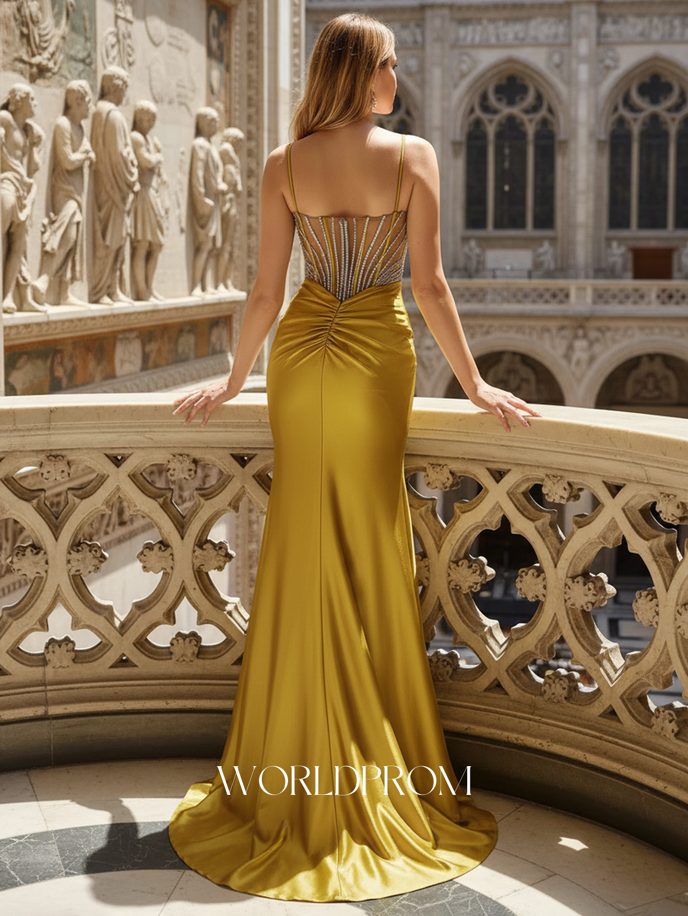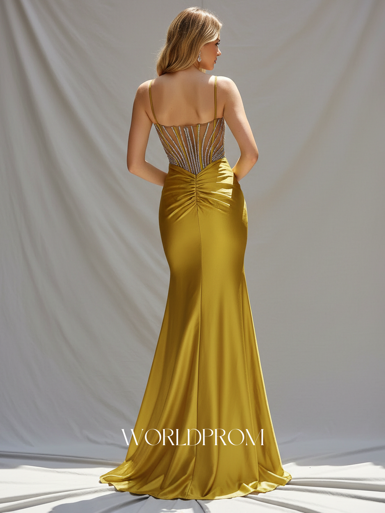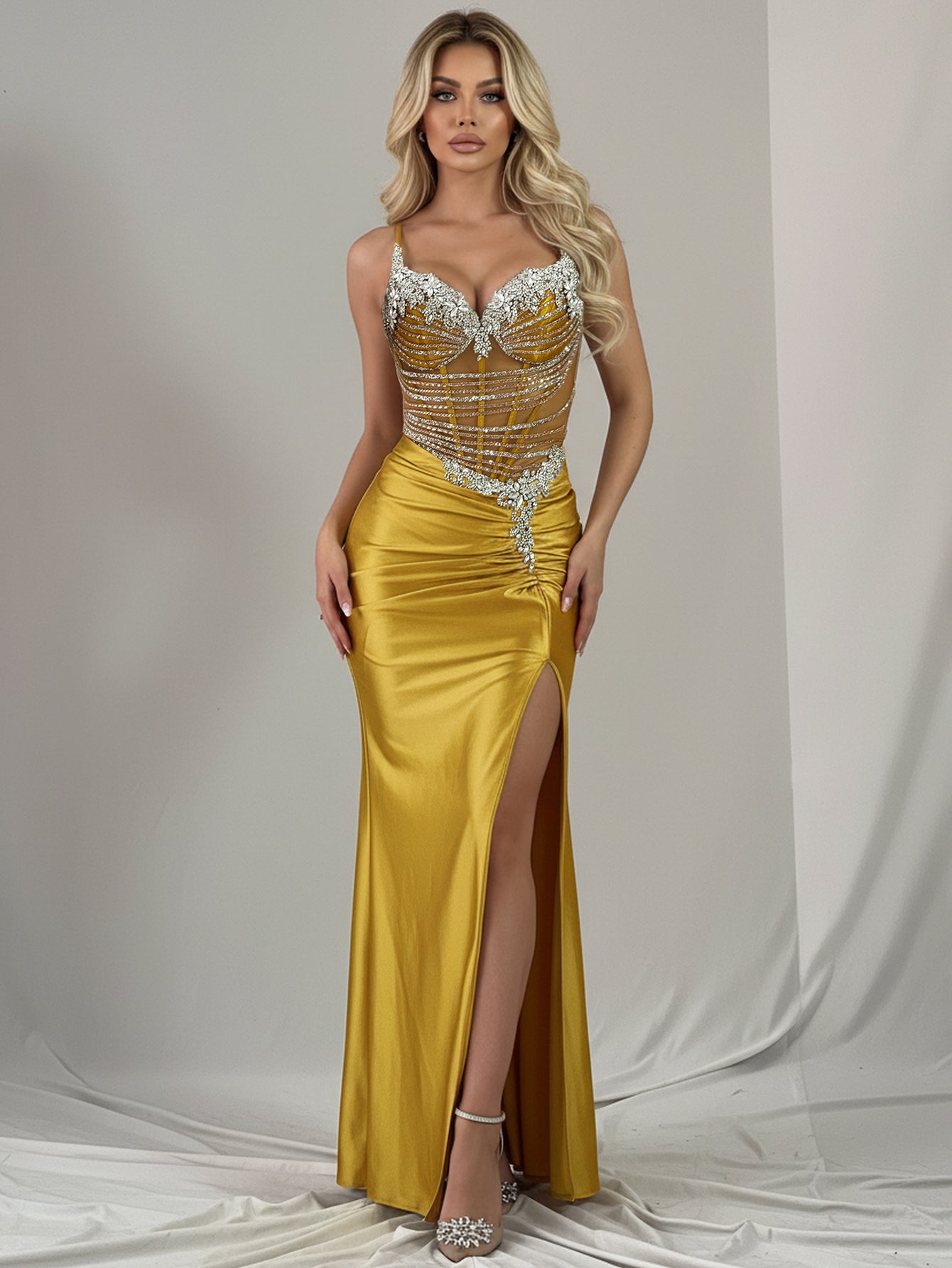 Luxury Crystal Dubai Sheer Bodice Mermaid Evening Dress - Mustard Yellow