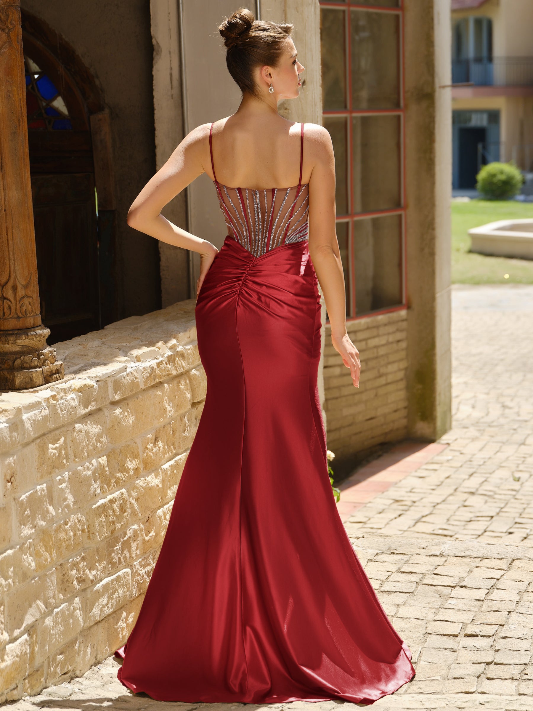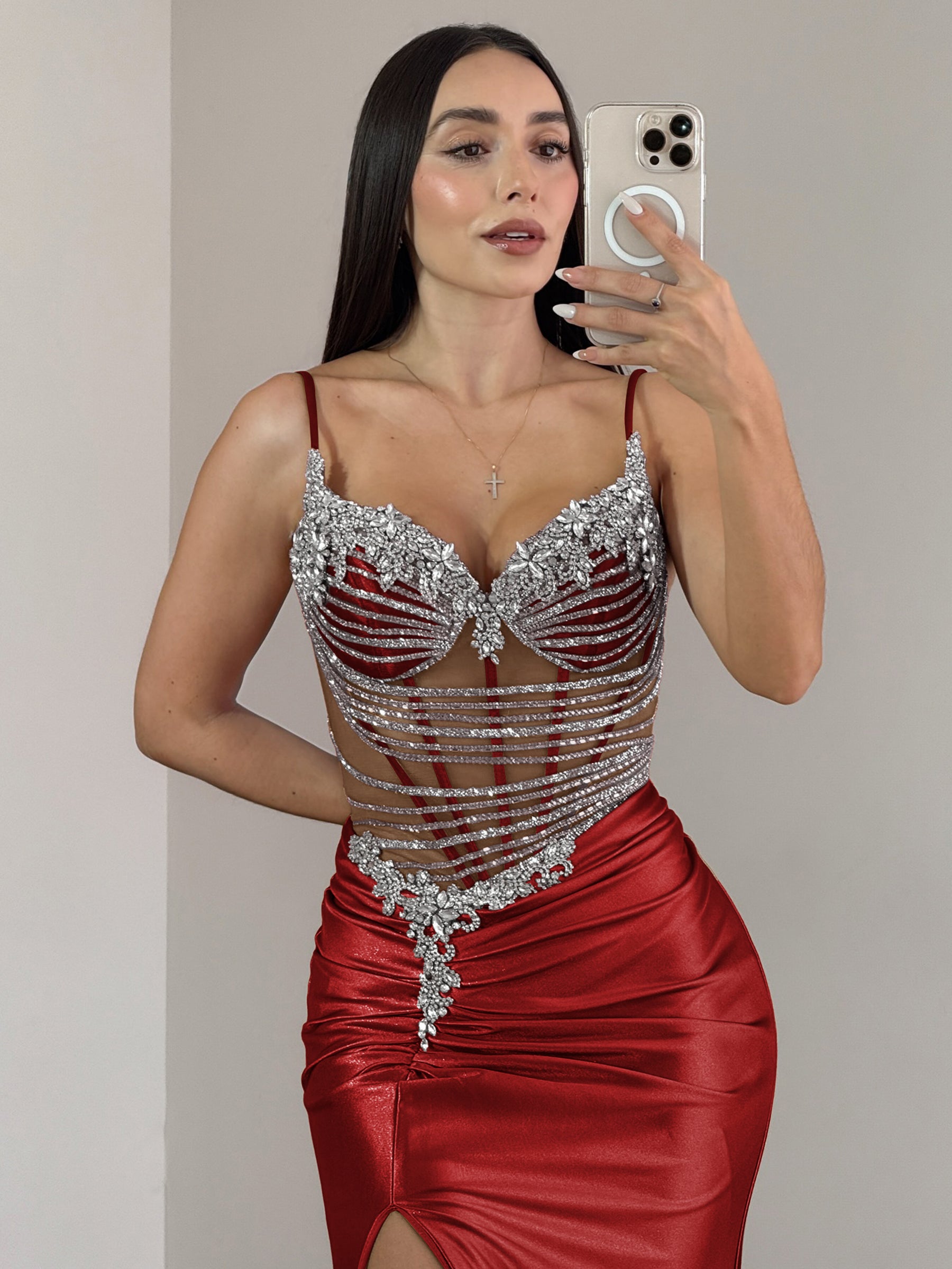 Luxury Crystal Dubai Sheer Bodice Mermaid Evening Dress - Red