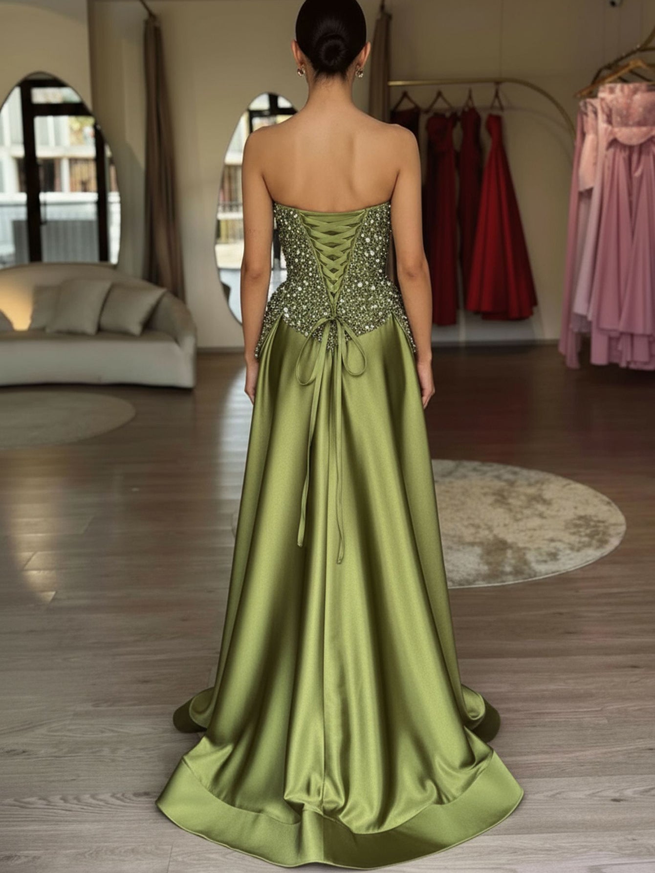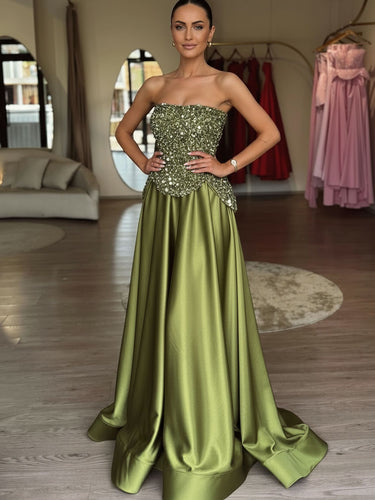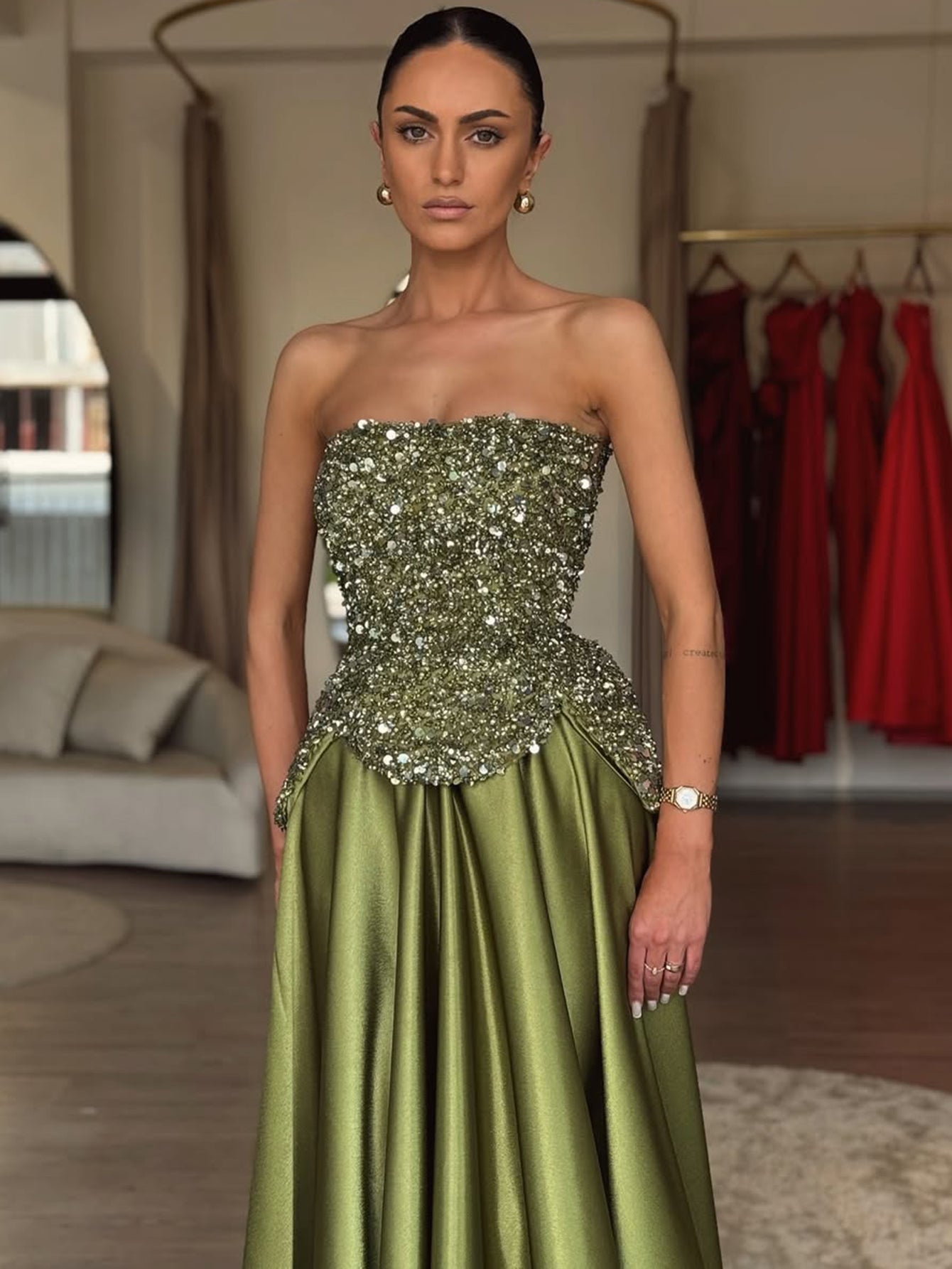 Luxury Two-Piece Sequin Top Satin Skirt Long Prom Dress - Green
