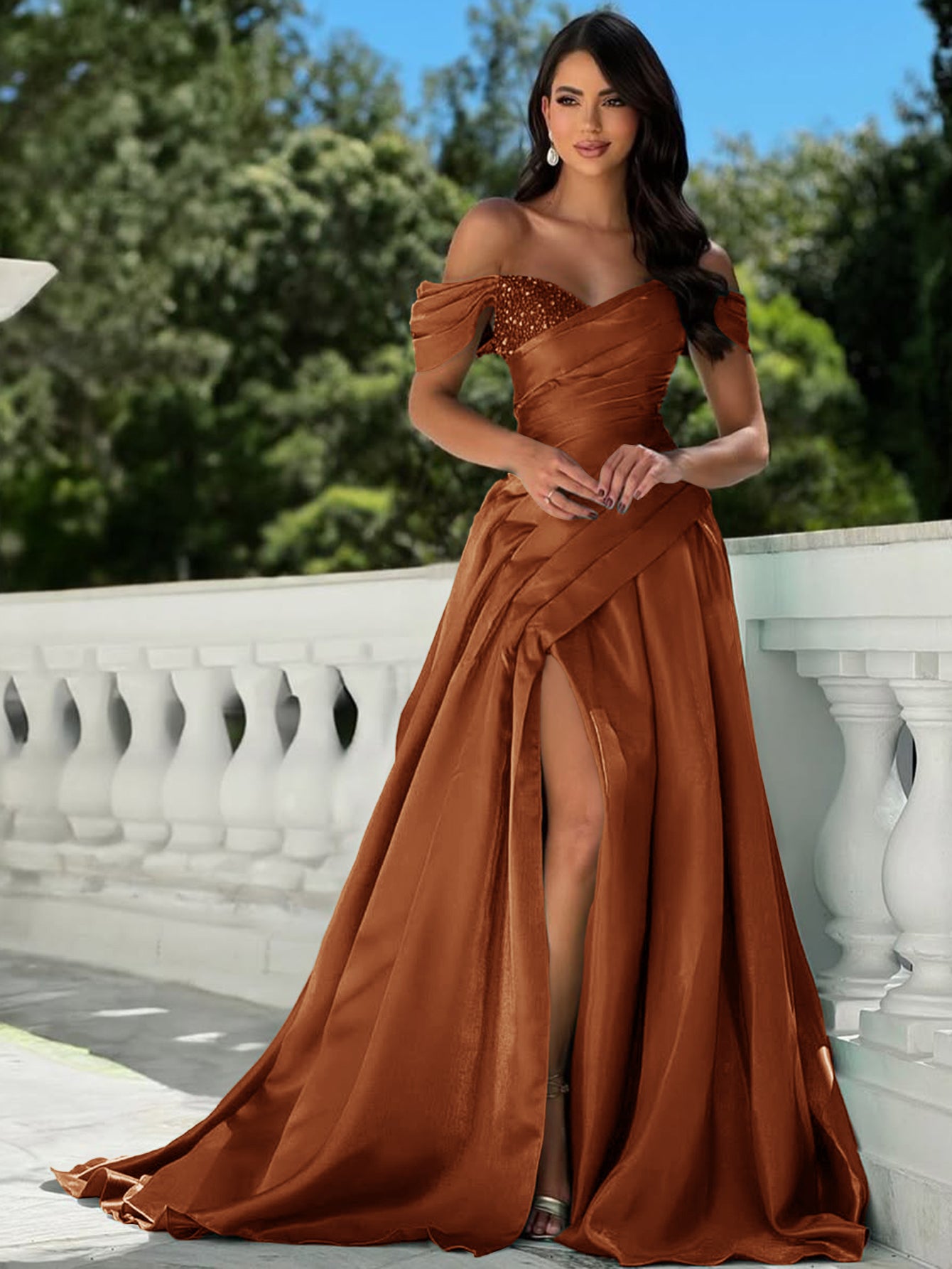 Off Shoulder Sequin Pleated Satin A-Line Prom Dress Long With Split - Burnt Orange
