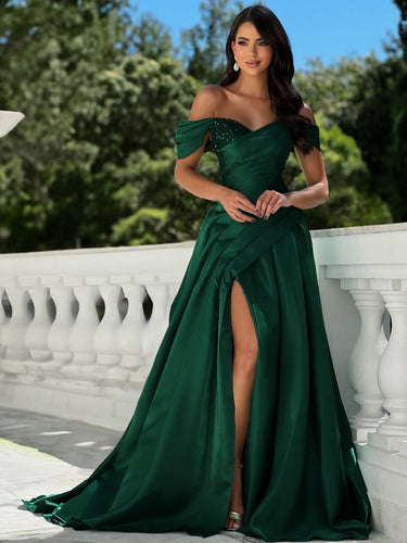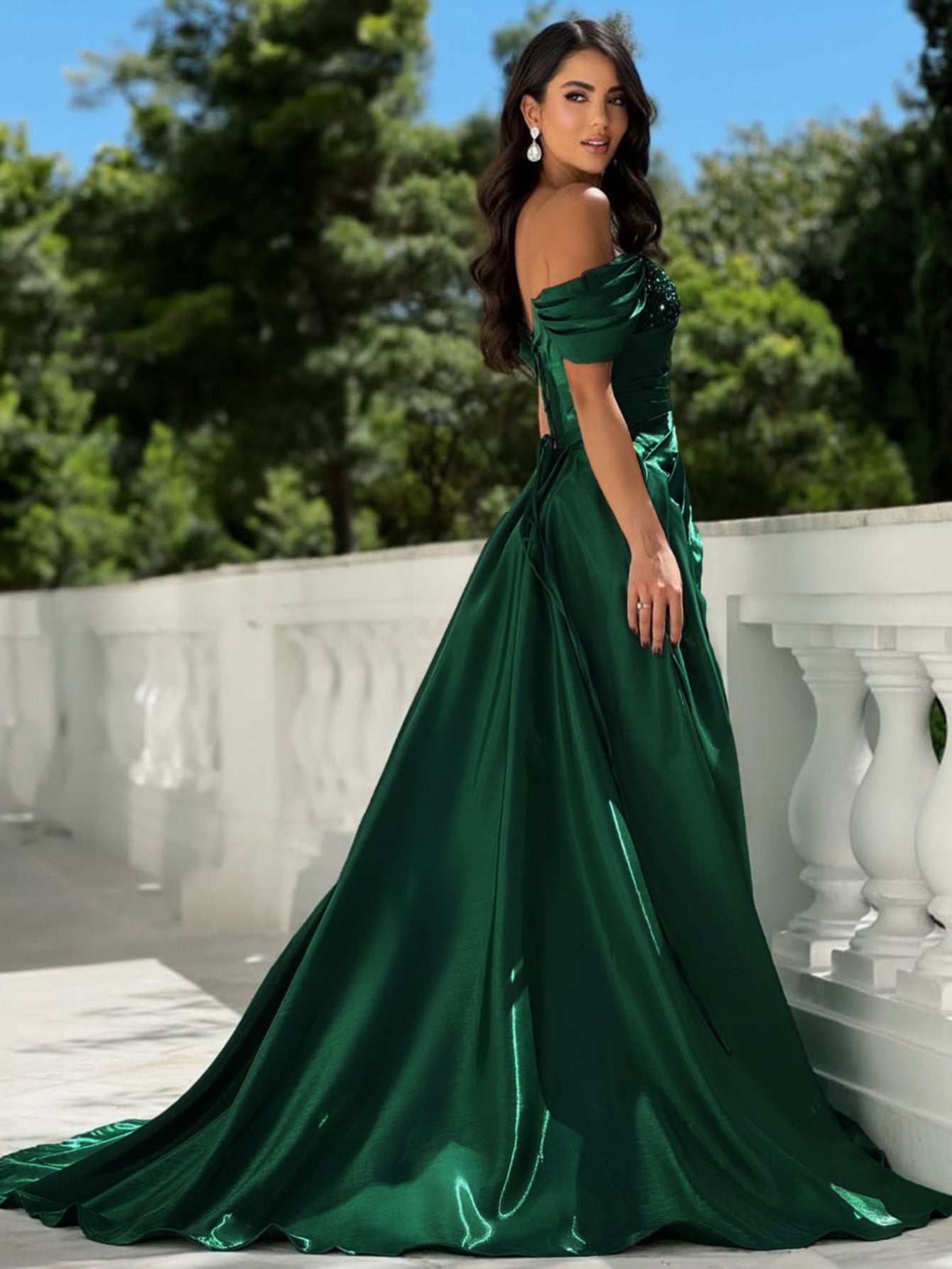 Off Shoulder Sequin Pleated Satin A-Line Prom Dress Long With Split - Emerald Green