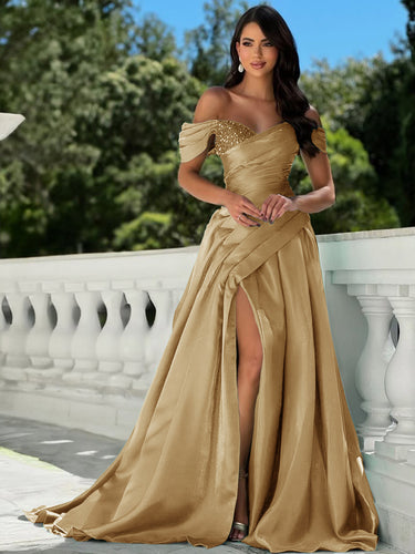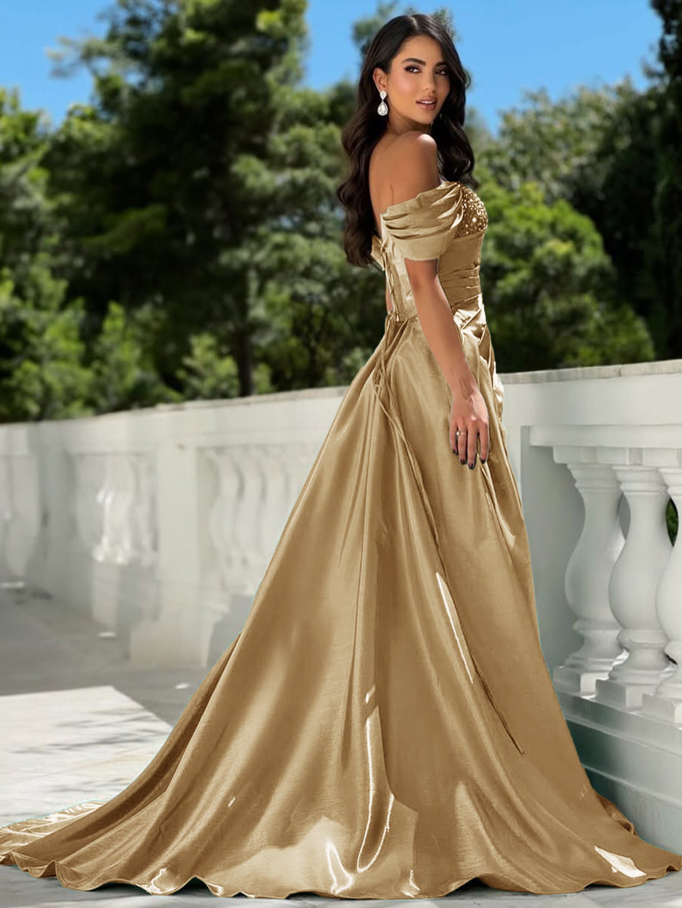 Off Shoulder Sequin Pleated Satin A-Line Prom Dress Long With Split - Gold