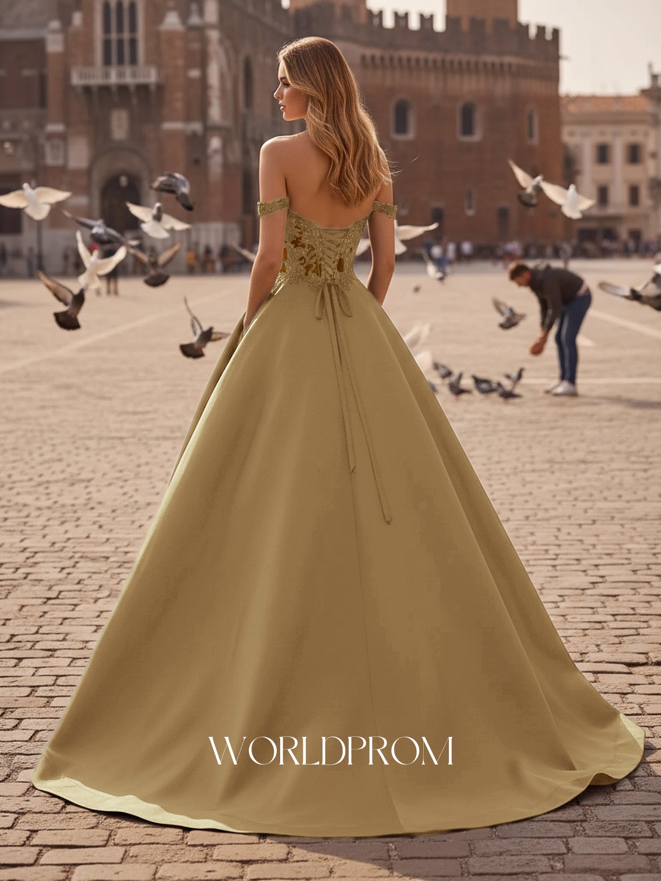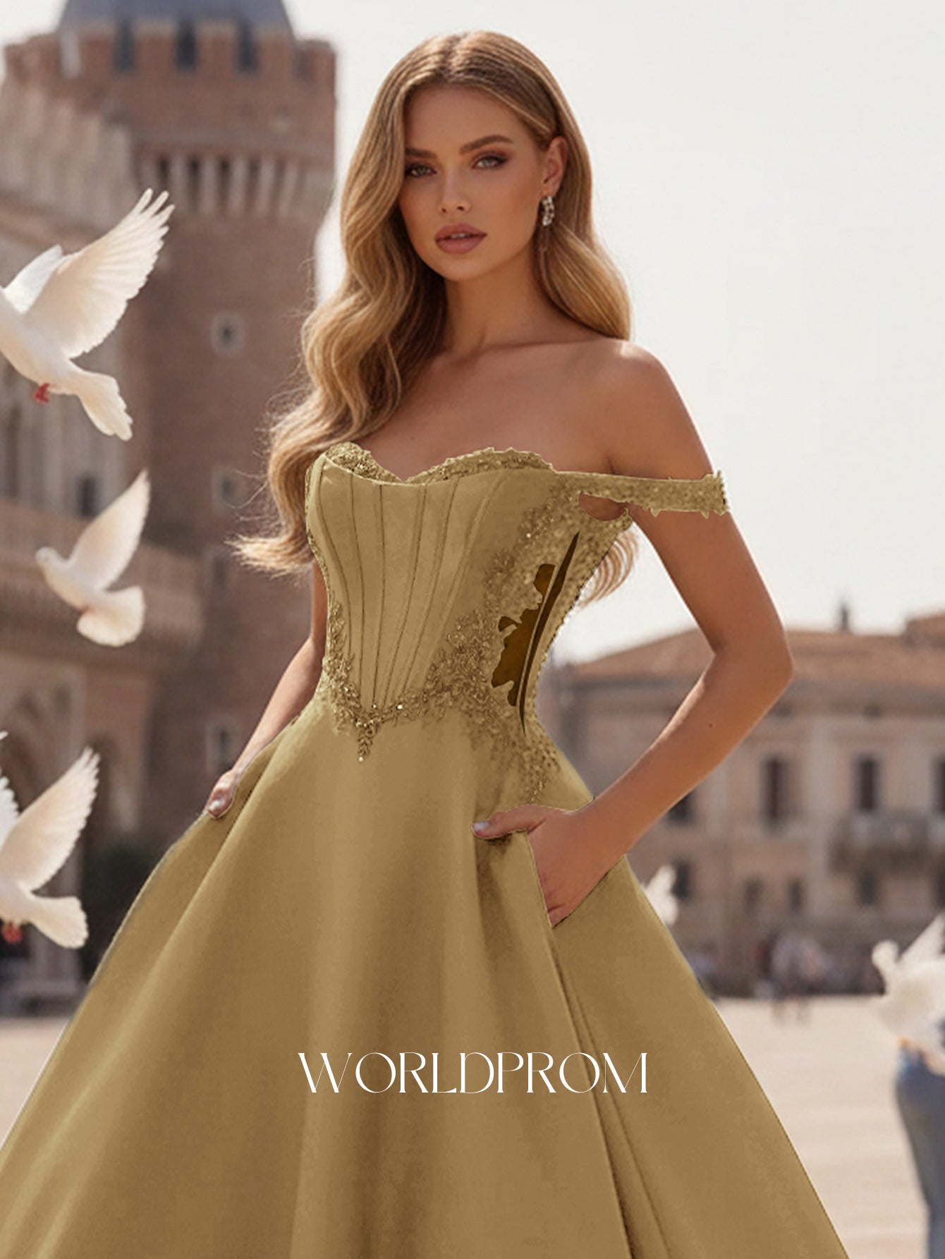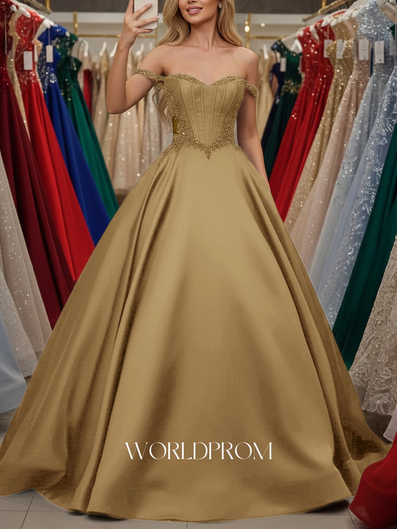 This satin prom gown features sparkly beading with pockets on the illusion bodice. The off shoulder dress has a sweetheart neckline and pleated hem. Worldprom ball gown prom dresses are ideal for party, evening or festivals.