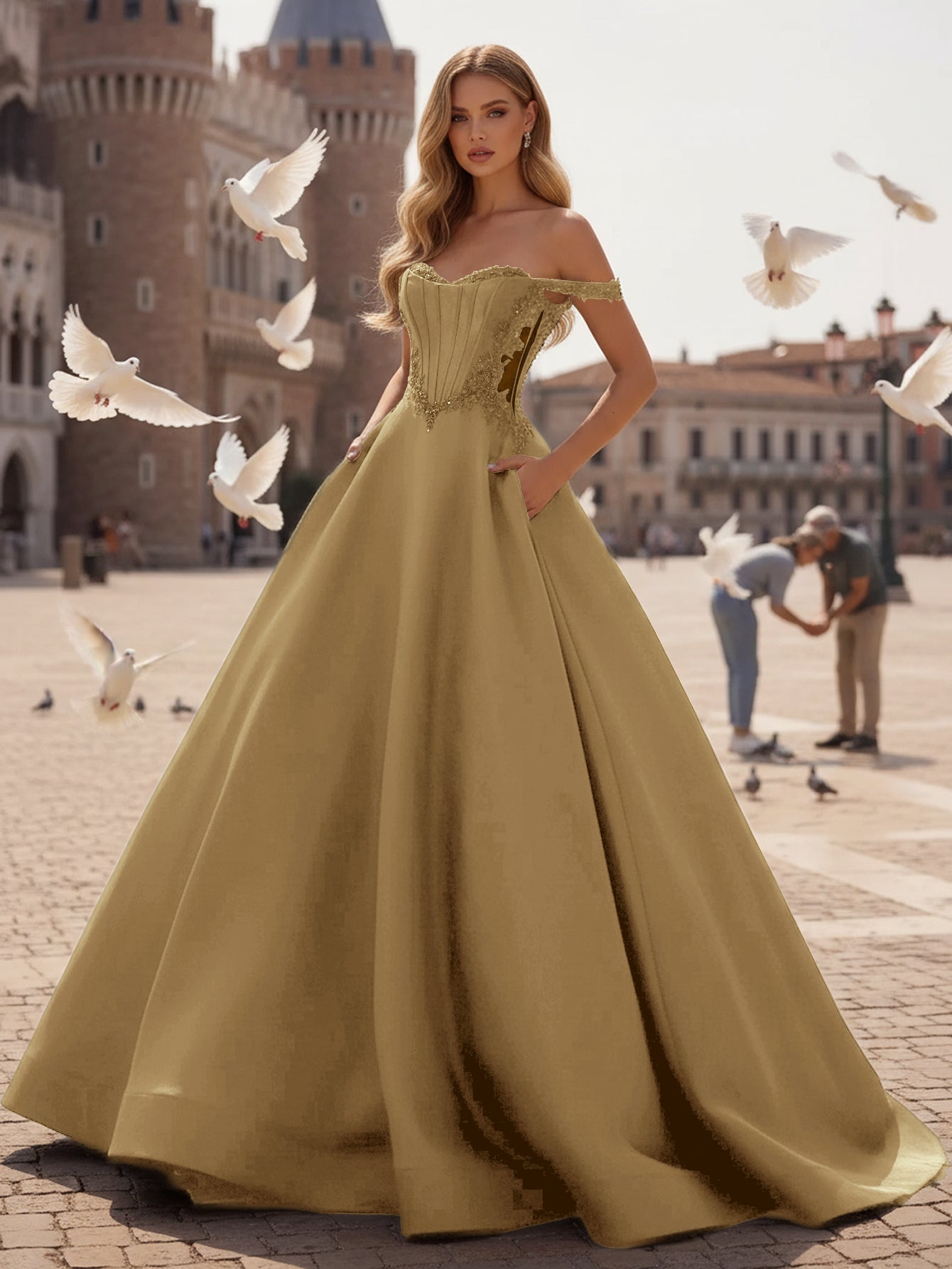 Off Shoulder Sparkly Beading Illusion Long Ball Gown Prom Dress With Pockets - Gold