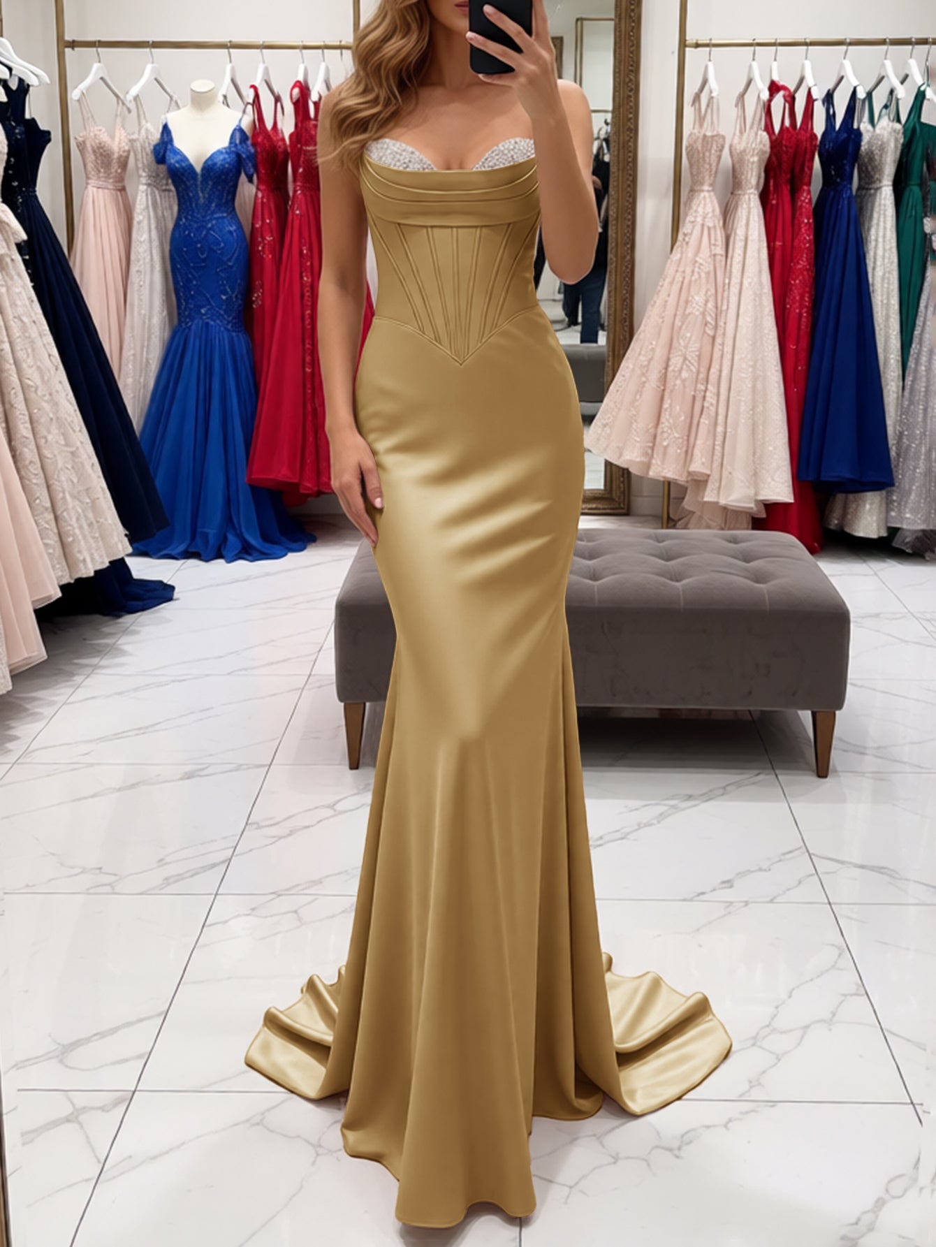 This satin prom gown features sparkly beading ruched bust on the bodice. The spaghetti straps dress has a sweetheart neckline and drop train hem. Worldprom mermaid prom dresses are ideal for party, evening or festivals.