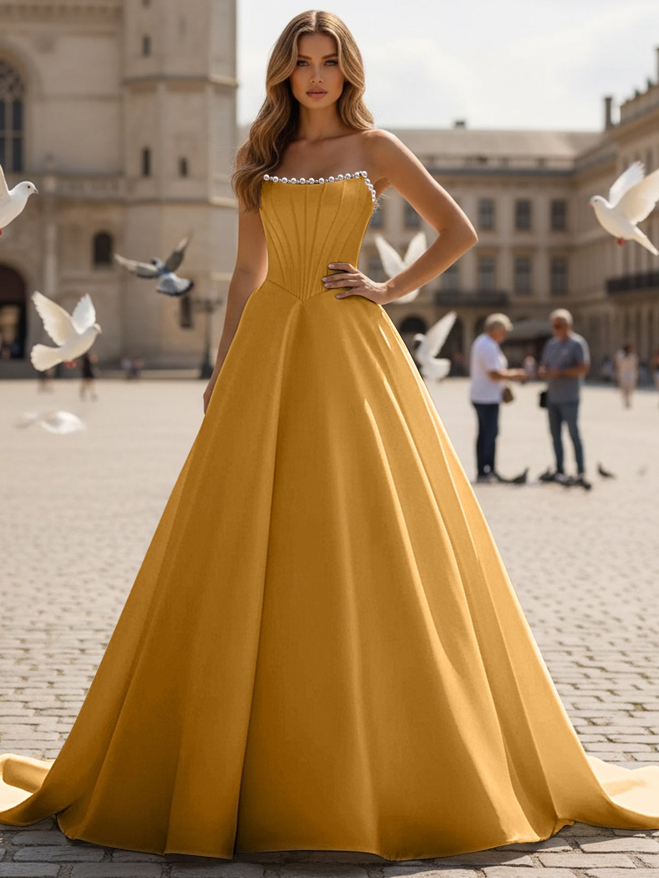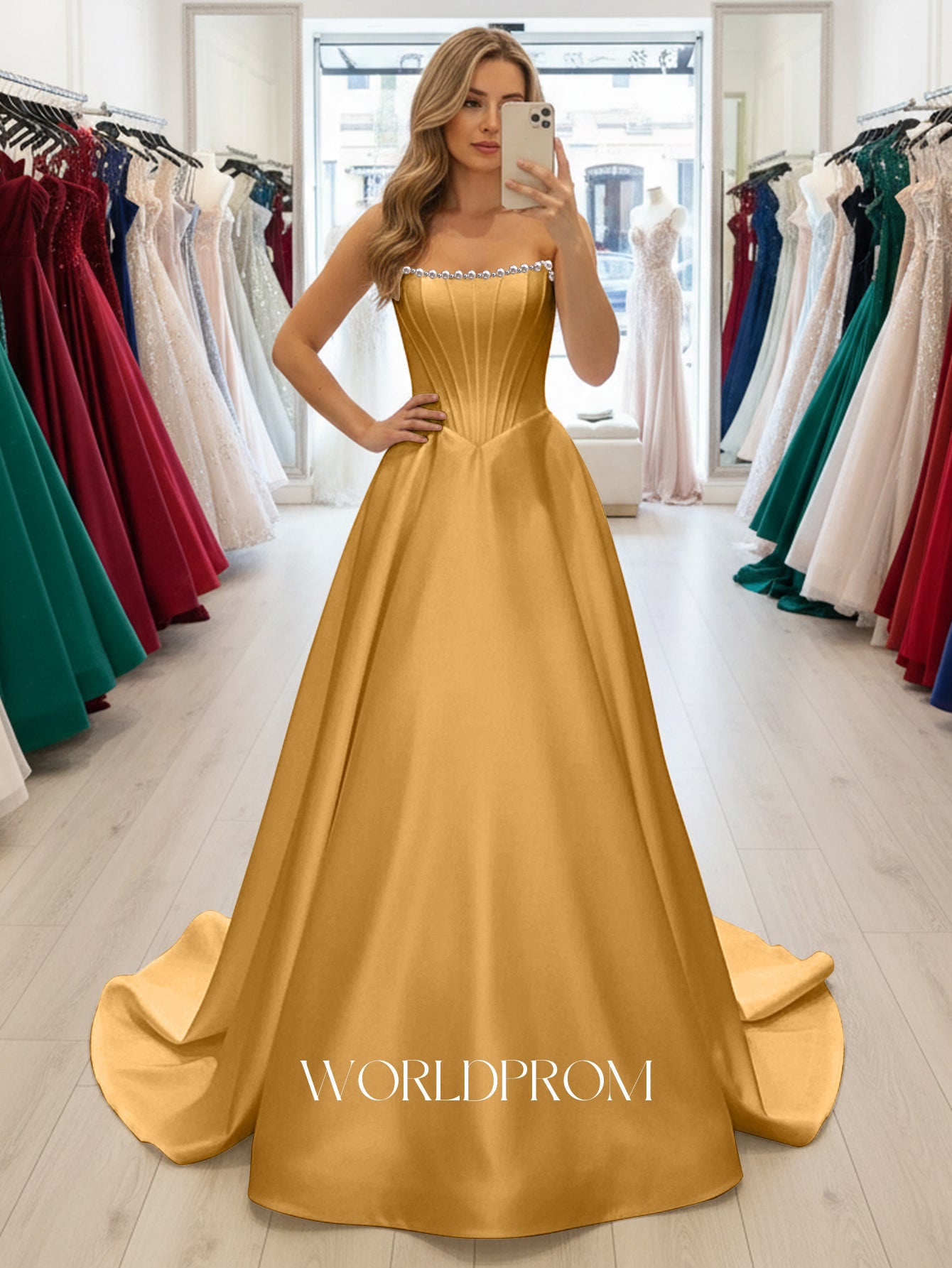 This satin prom gown features sparkly beading on the bodice. The strapless maxi dress has a scoop neckline and pleated hem. Worldprom ball gown prom dresses are ideal for party, evening or festivals.