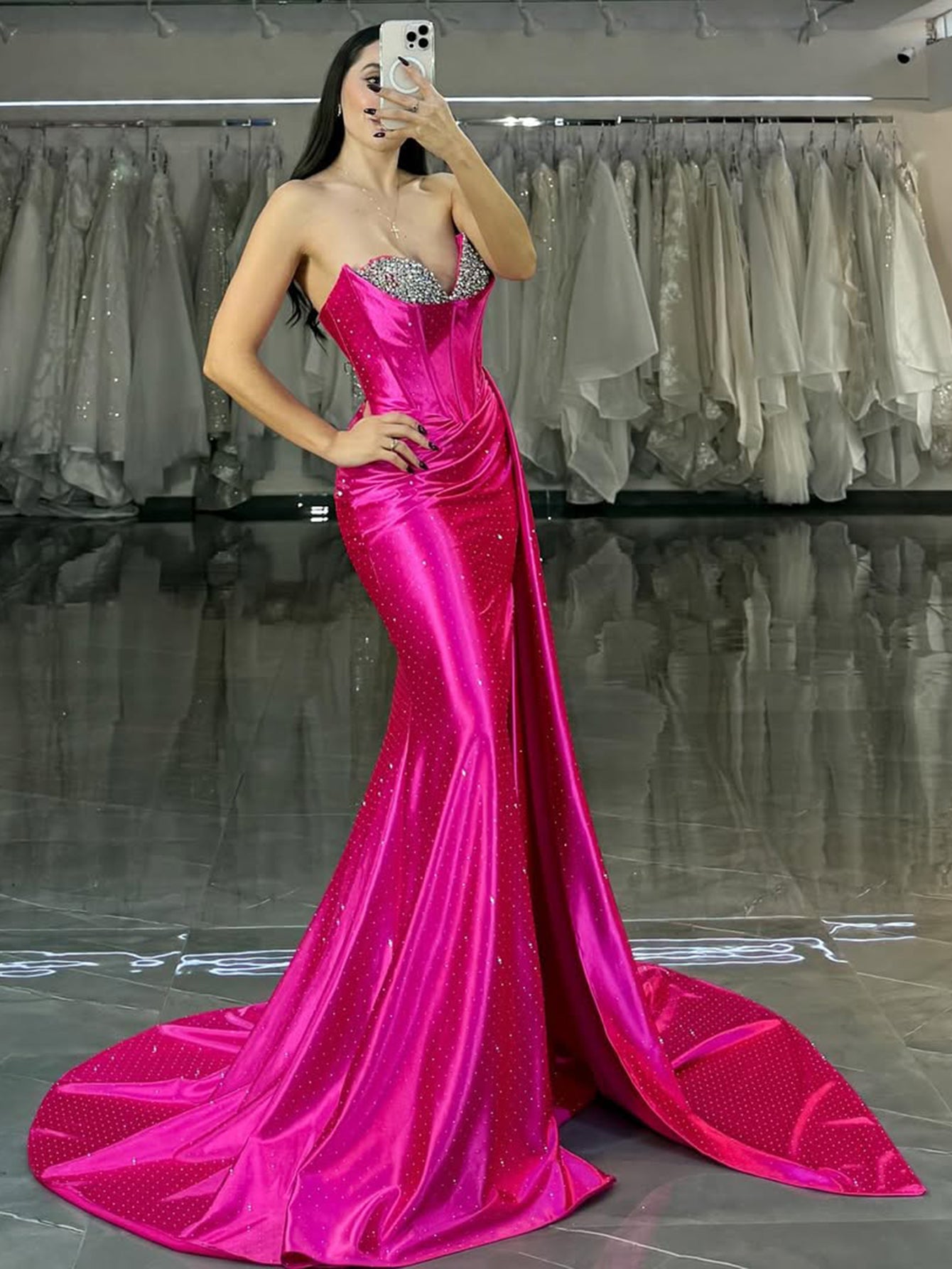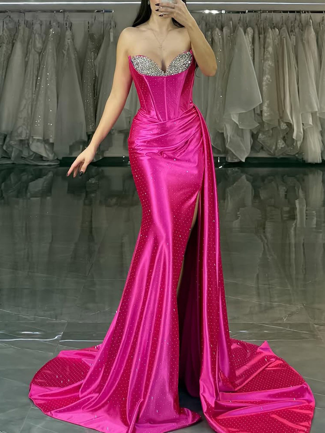 This stretch satin prom gown features crystal bust and drop train on the bodice. The strapless ruched dress has a sweetheart neckline and split hem. Worldprom mermaid prom dresses are ideal for party, evening or festivals.