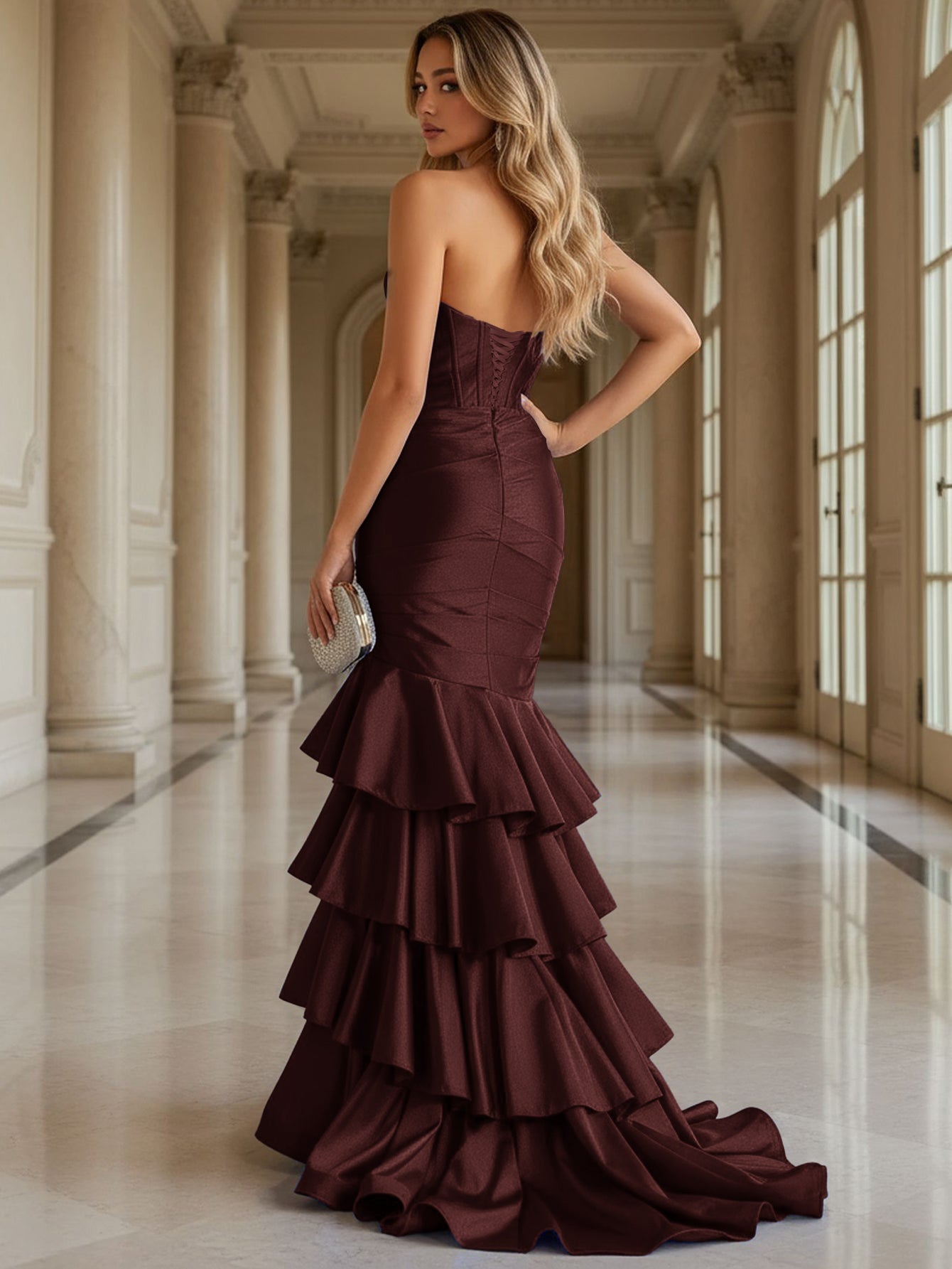 Boned Bodice Strapless Mermaid Prom Dress With Ruffle - Burgundy