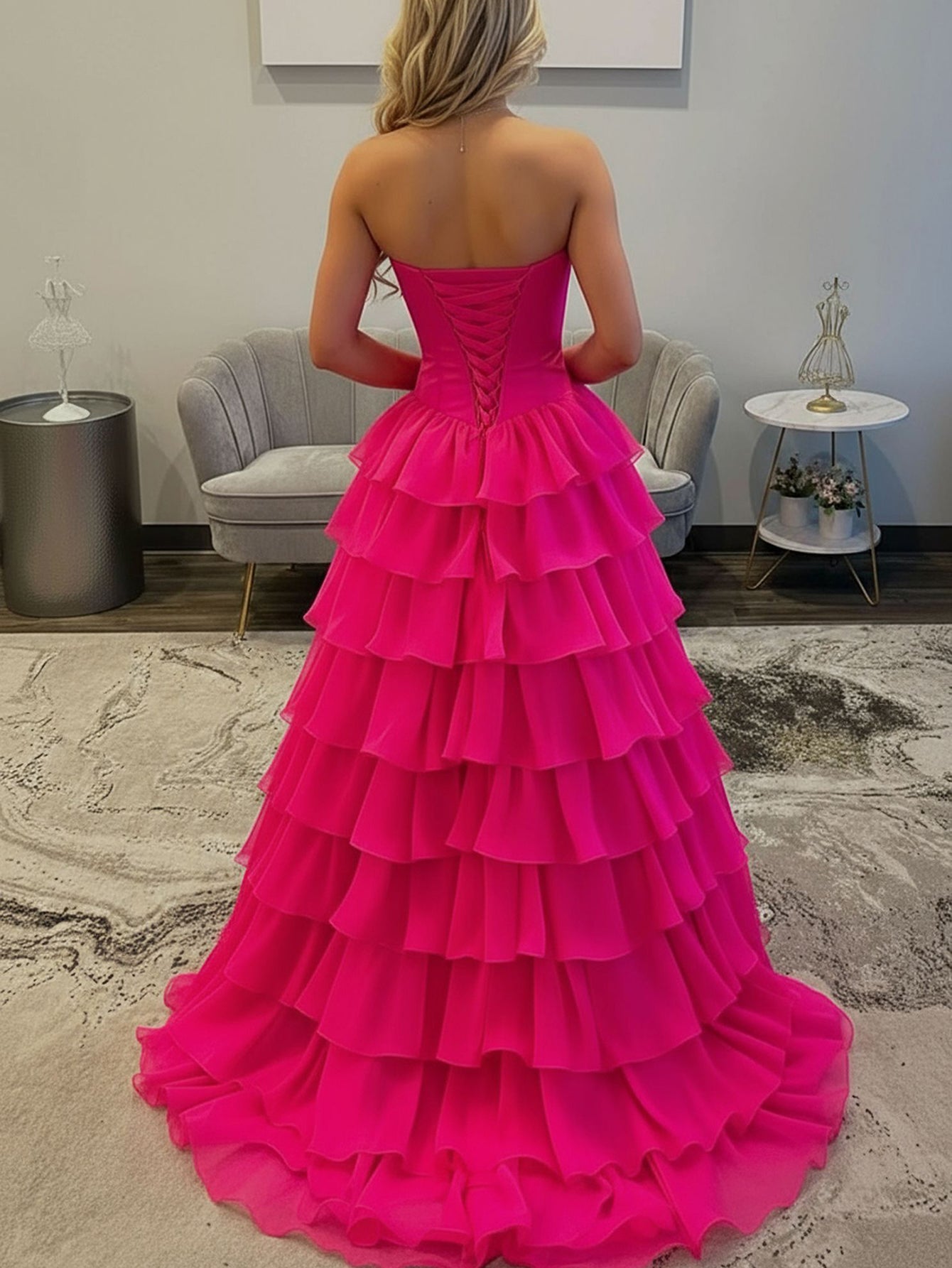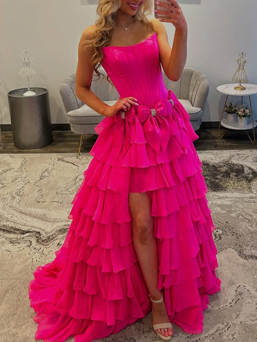 Boned Strapless Tiered Ball Gown Prom Dress Long With Bow - Hot Pink