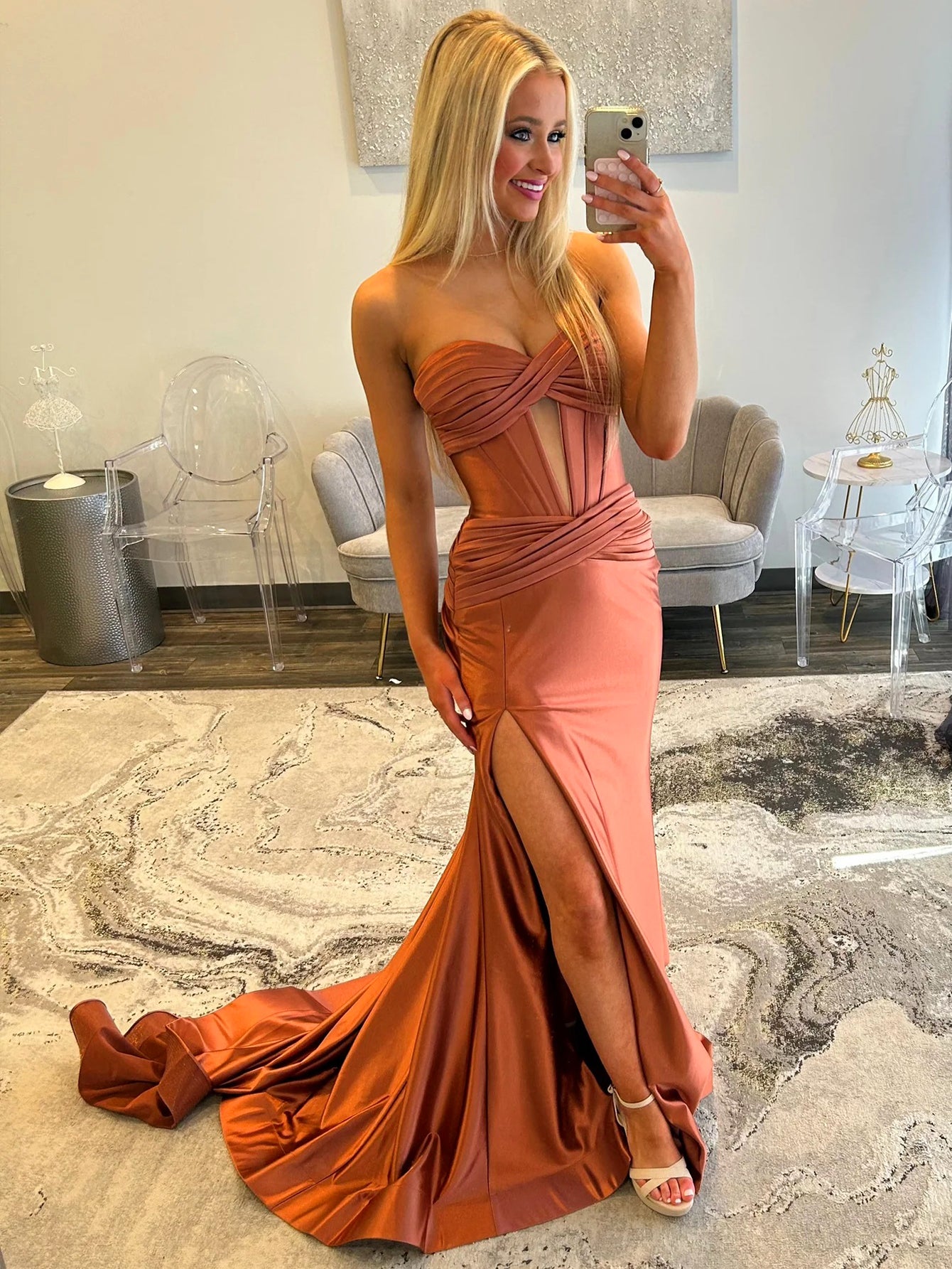 This stretch satin prom gown features cut front on the bodice. The strapless maxi dress has a sweetheart neckline and pleated hem. This mermaid formal dress is ideal for party, evening or festivals.