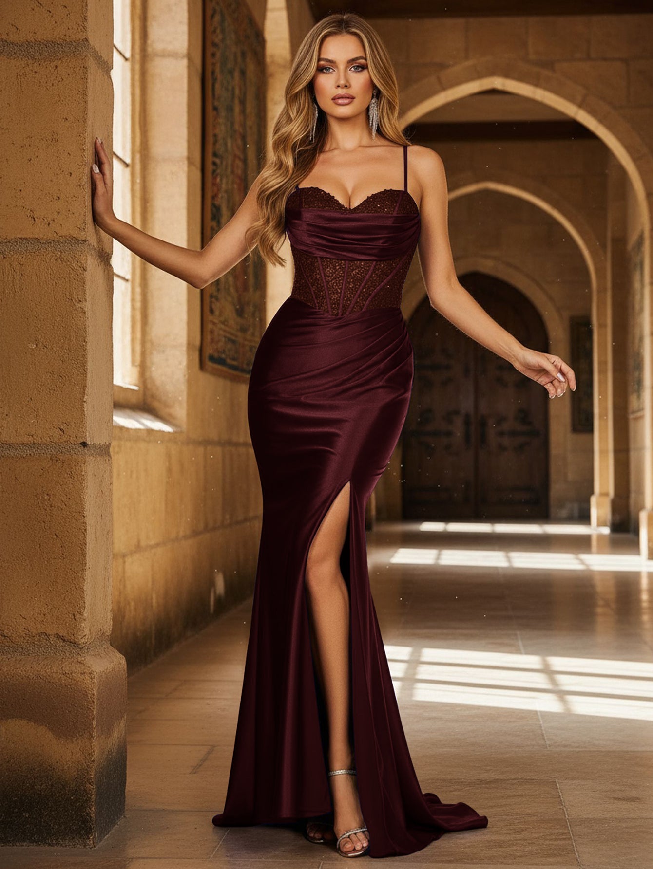 This prom dress features criss cross stretch satin and pleated hem. The bodice has a spaghetti straps sweetheart neckline and illusion back with bandage. This mermaid prom gown is ideal for prom, formal&evening, or homecoming events.