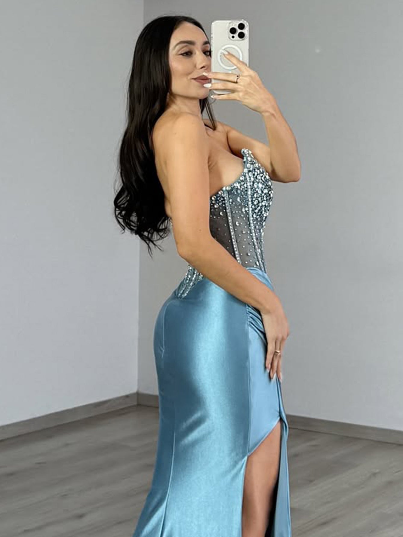 This satin prom dress features hand-beading with crystals on the illusion bodice. The strapless mermaid dress has a V-neckline and split hem. Ruched sparkly dresses are ideal for party, evening or festivals.