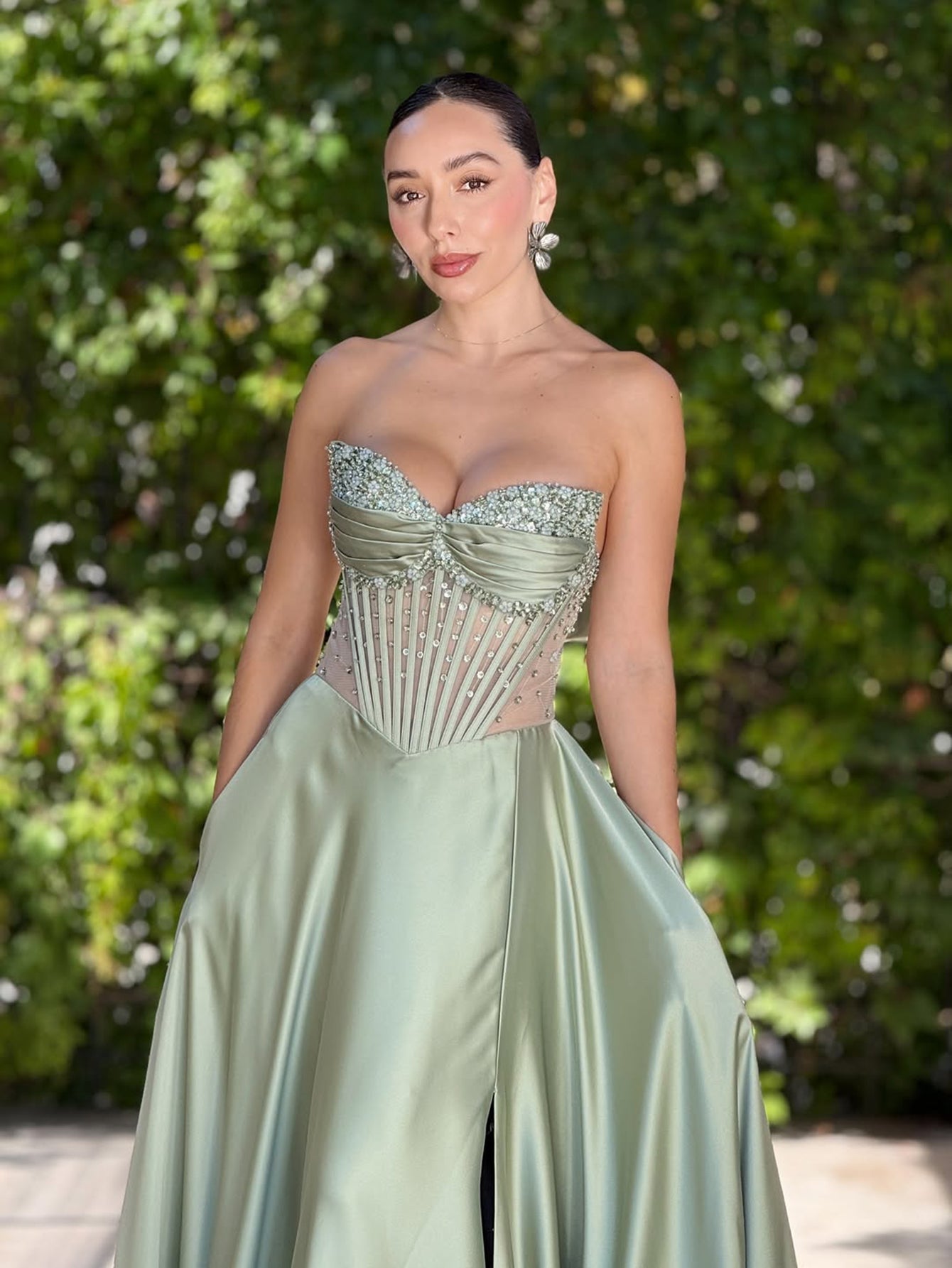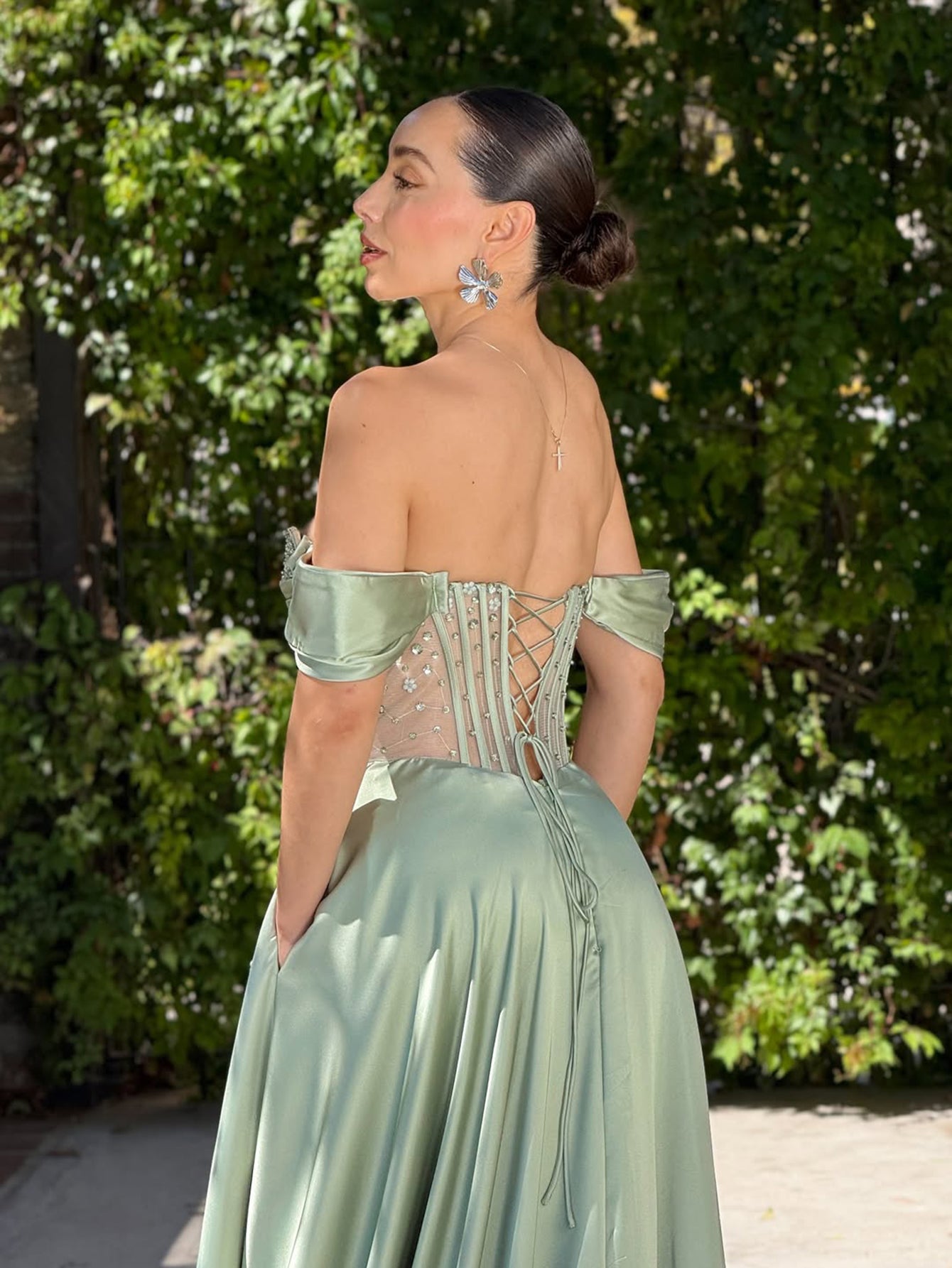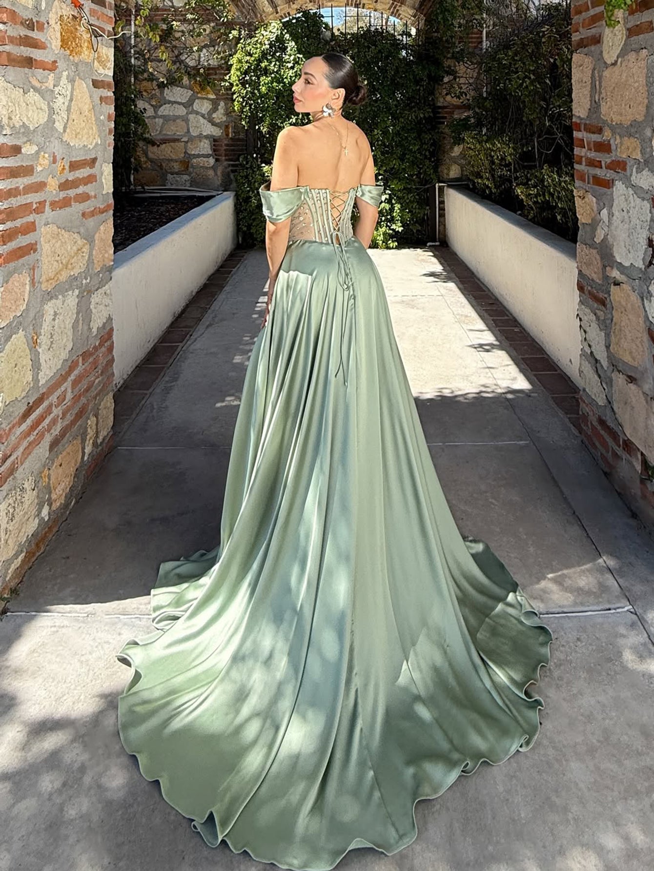 Off Shoulder Crystal Split Long Prom Dress With Pocket - Sage Green