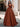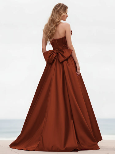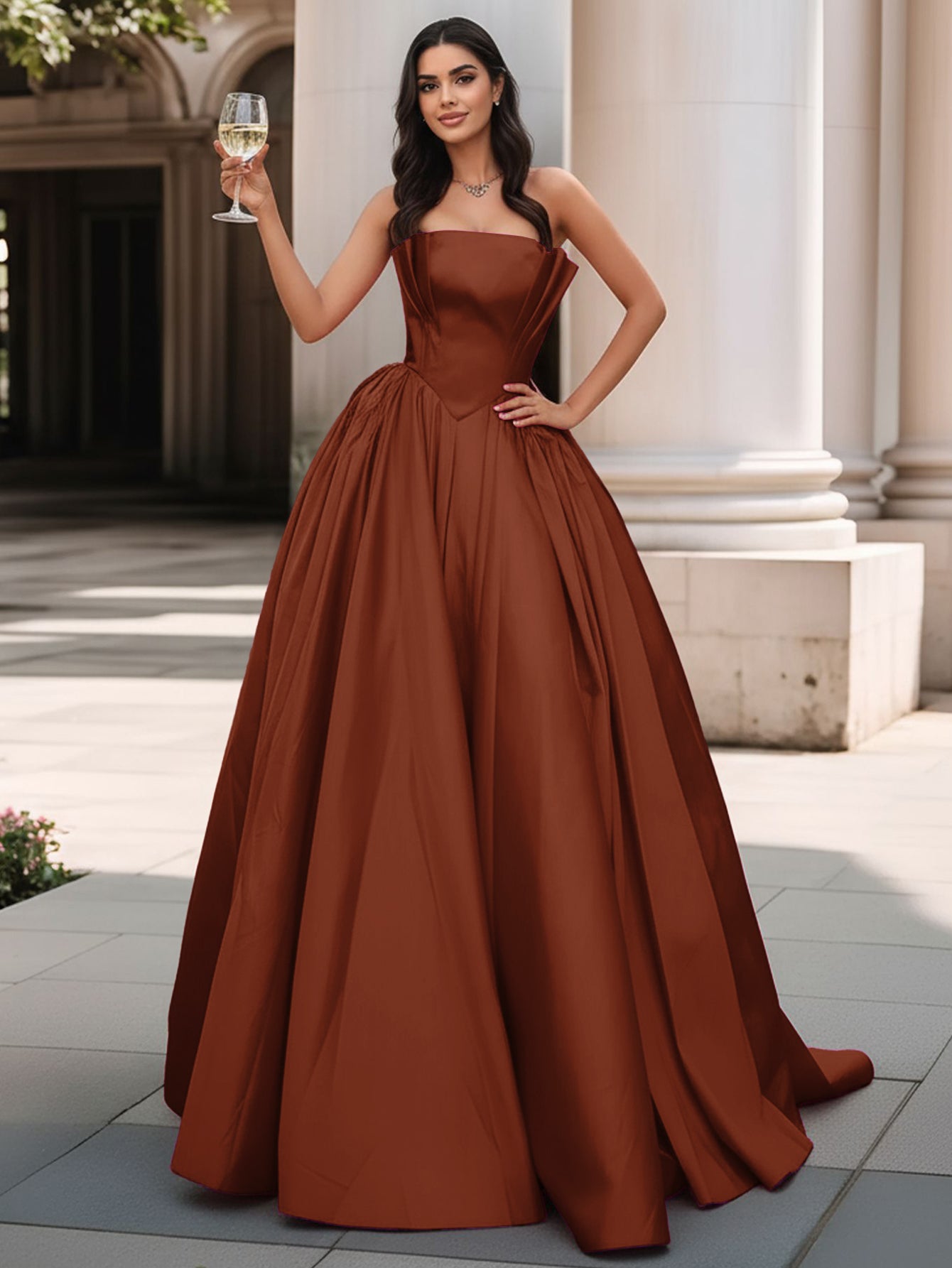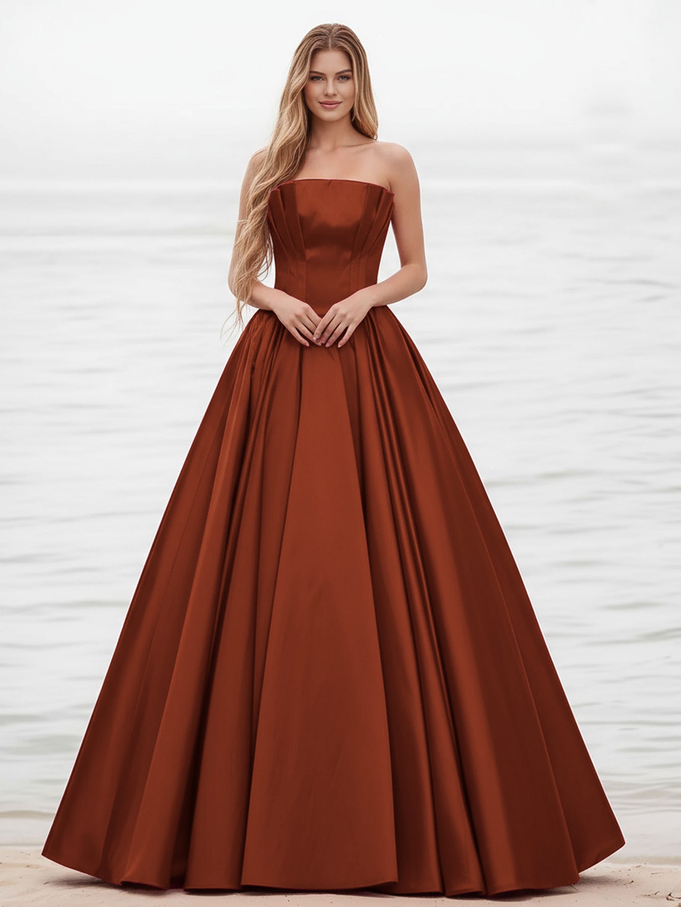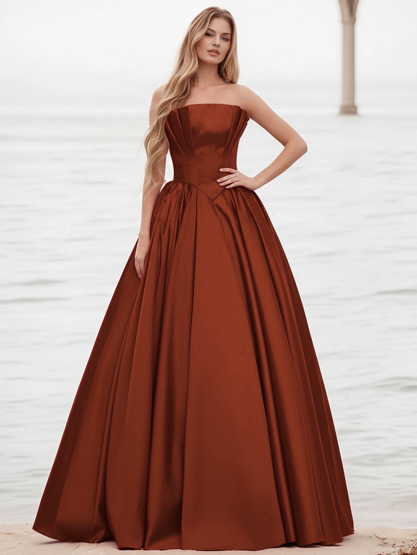 Pleated Bust Ruffle Hem Strapless Satin Prom Ball Gown - Burnt Orange