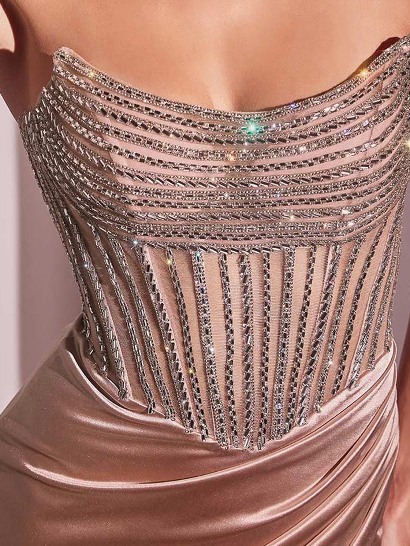 Pleated Luxury Crystal Mermaid Prom Dress - Rose Gold