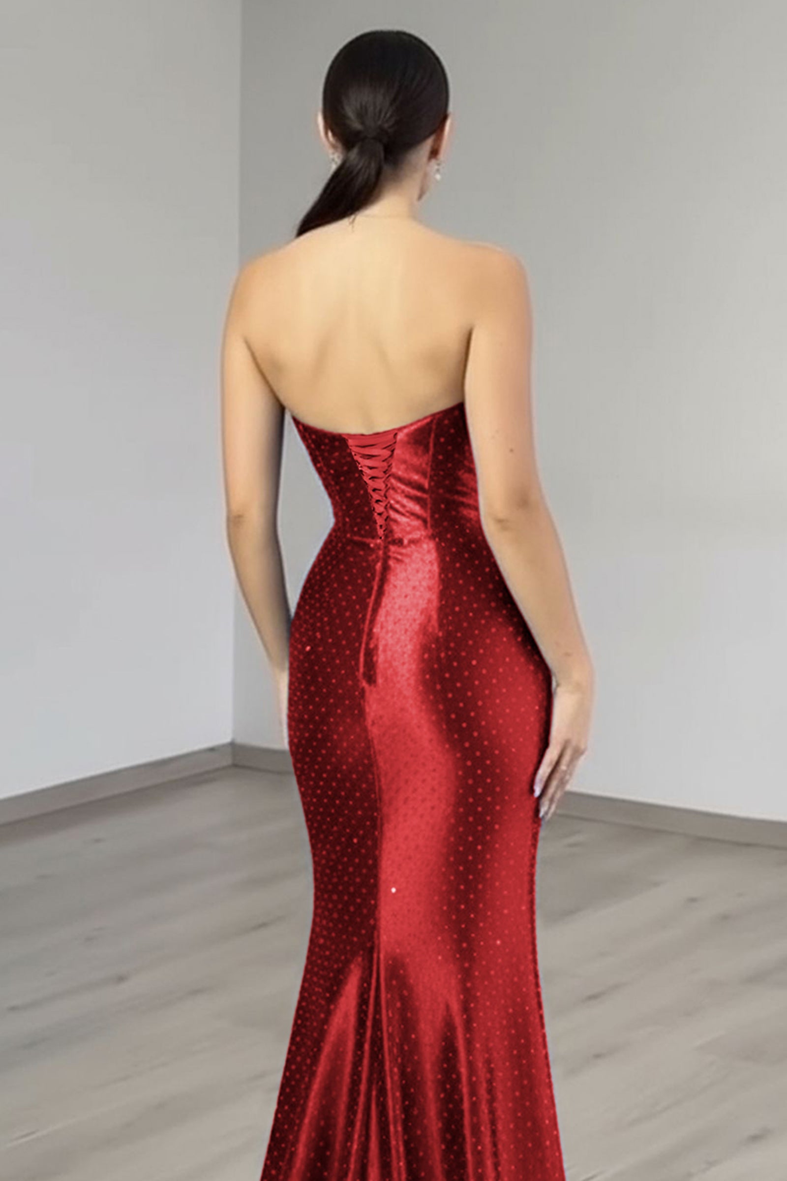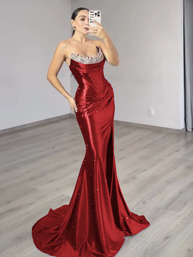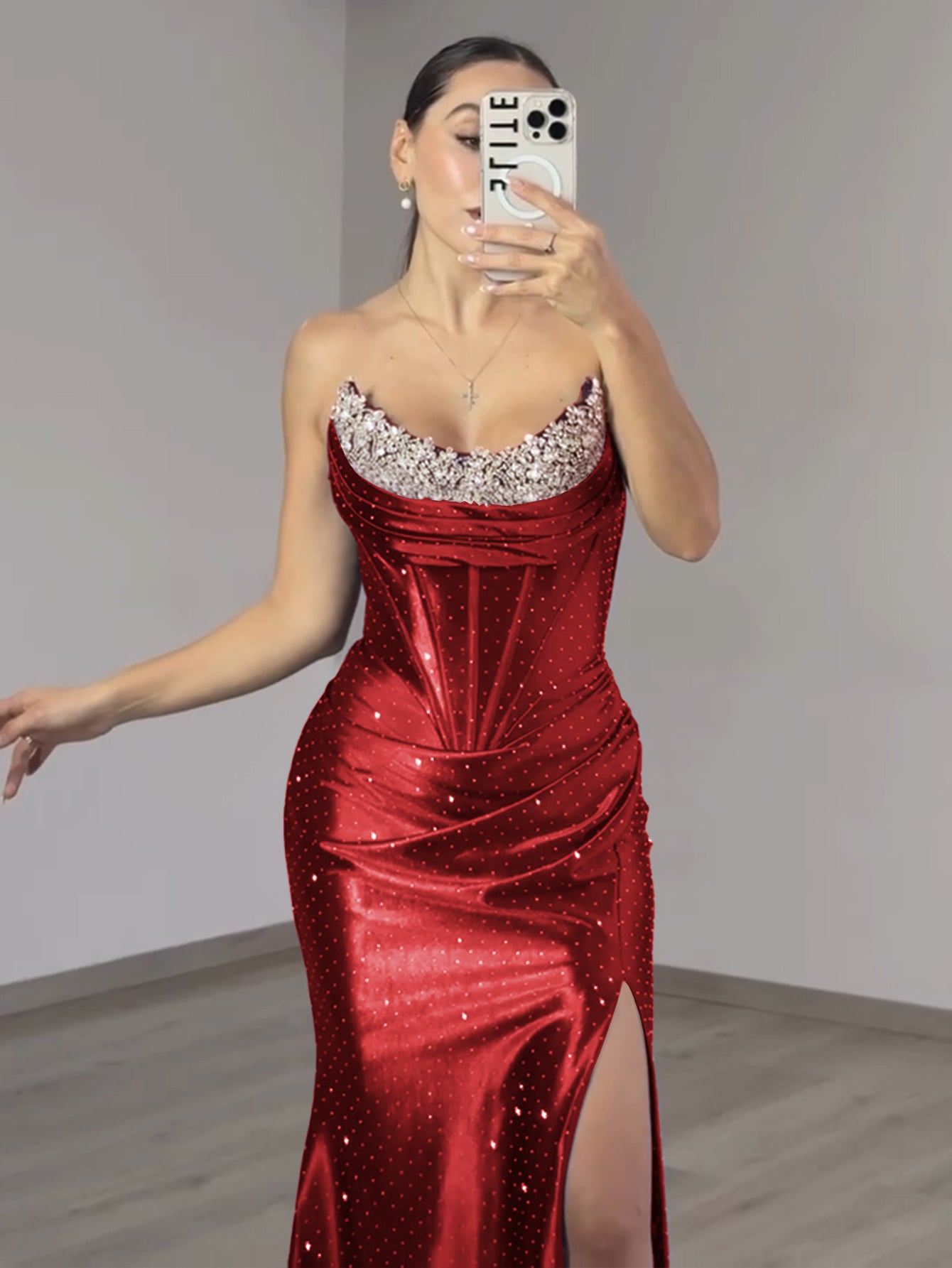 This luxury evening dress features satin with crystal on the bust. The strapless prom dress has a scoop neck and split hem. This dubai sexy evening dress is ideal for party, evening or homecoming events.
