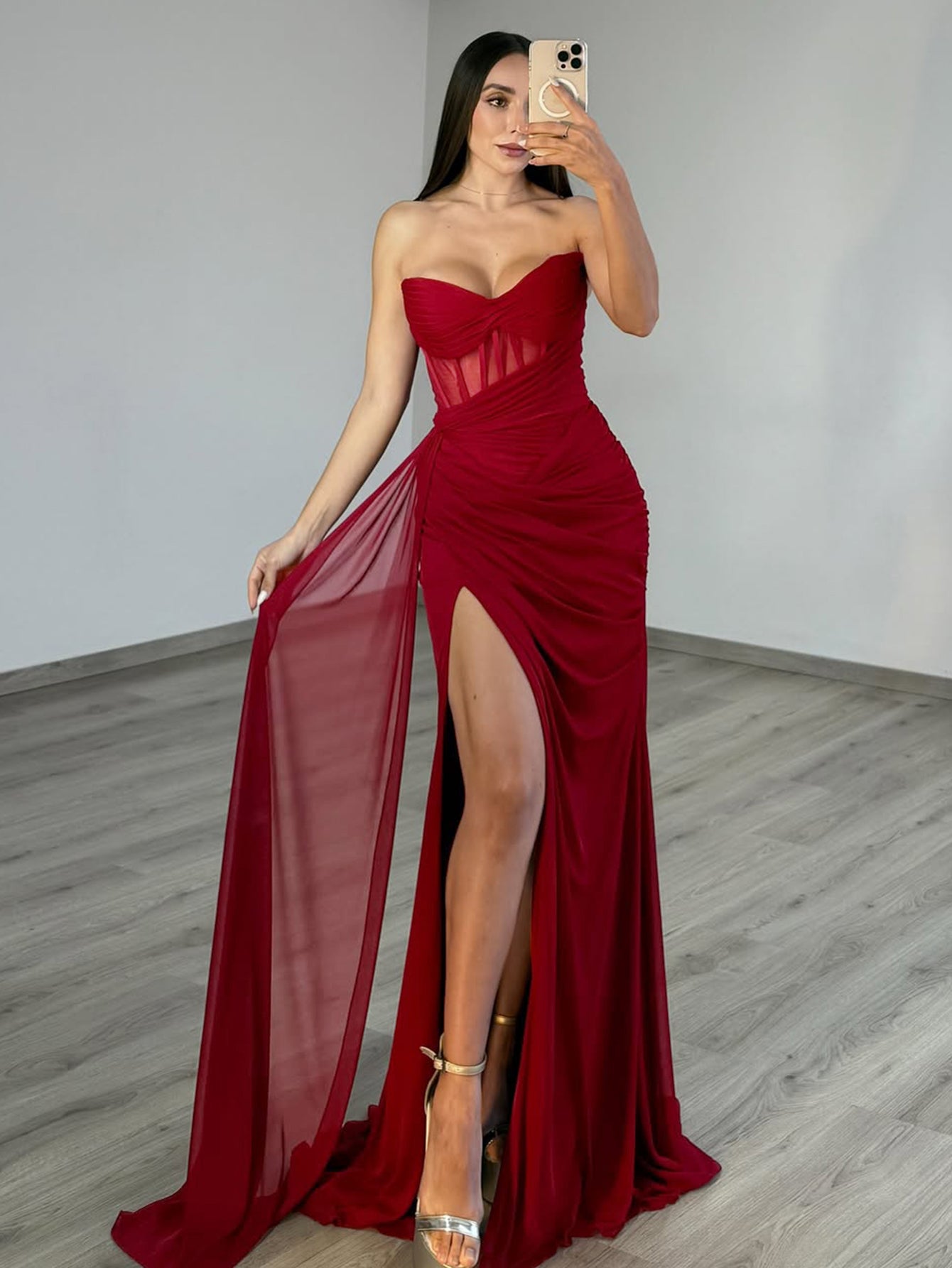 Sheer Bodice Chiffon Drop Waist Strapless Mermaid Prom Dress - Red