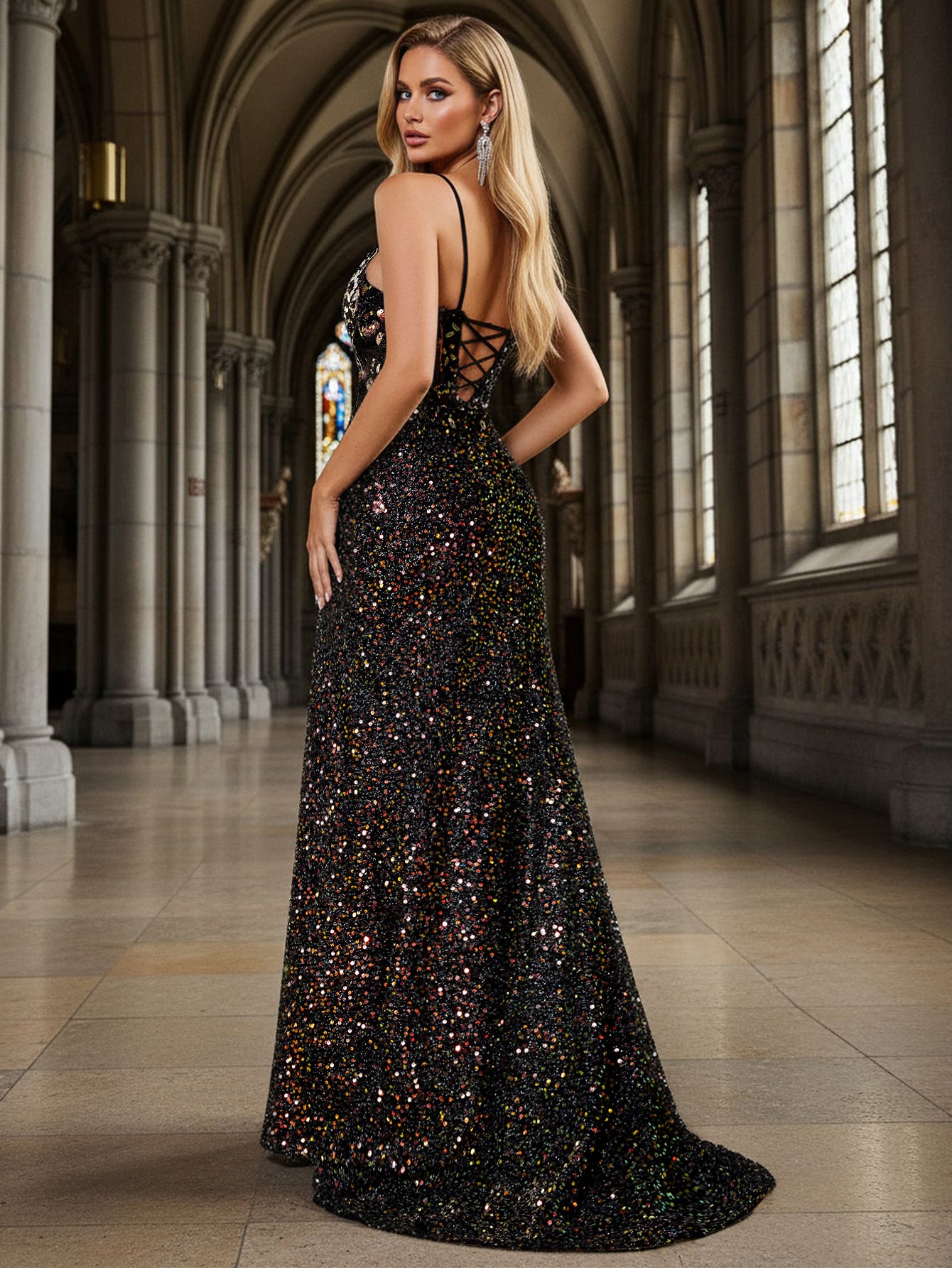 This elegant long evening dress features sequin and embroidery on a sheer net bodice. The bodice has a sweetheart neckline with spaghetti straps and a split skirt. This mermaid prom dress is ideal for prom, formal & evening, or homecoming events.
