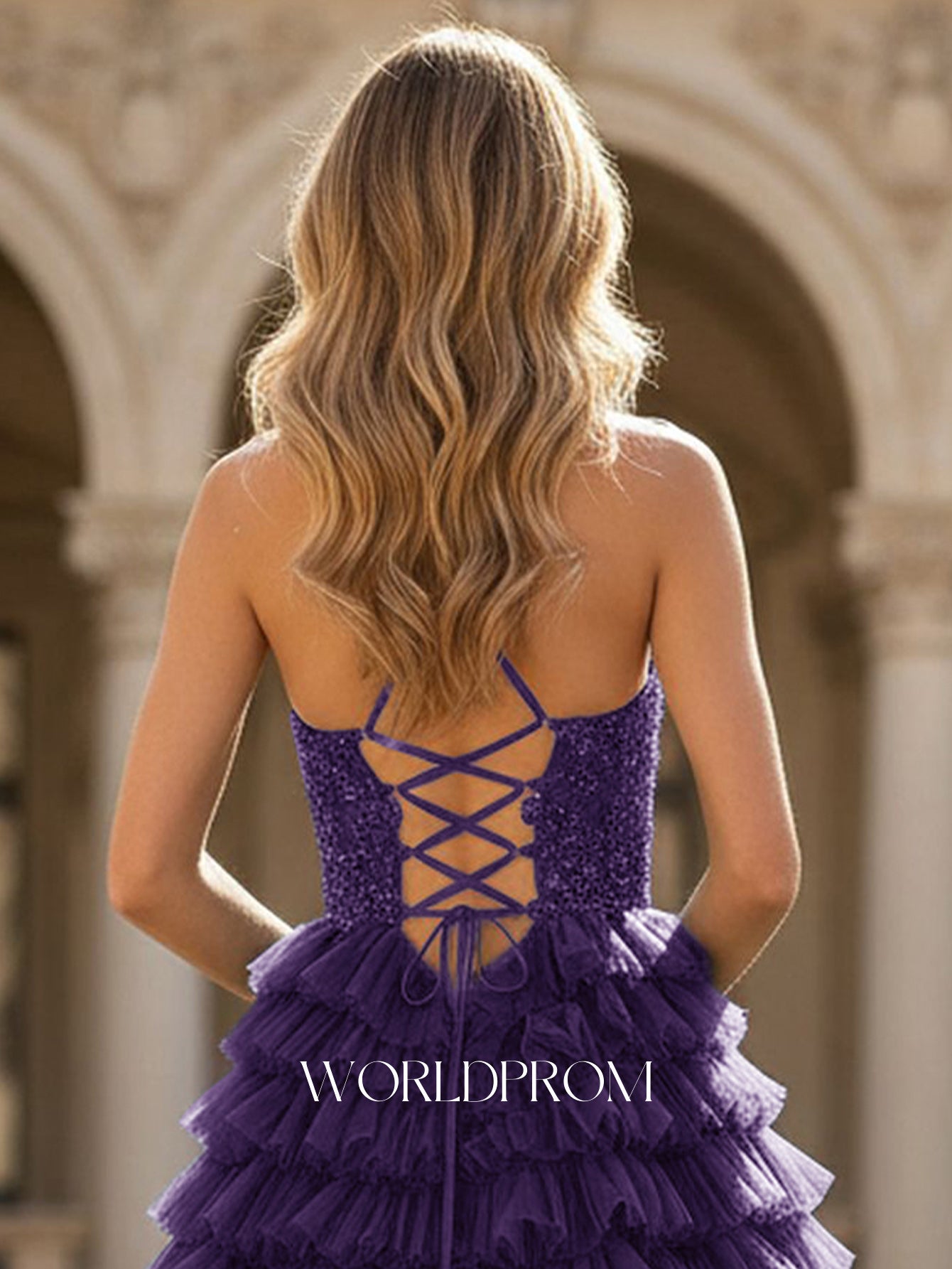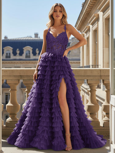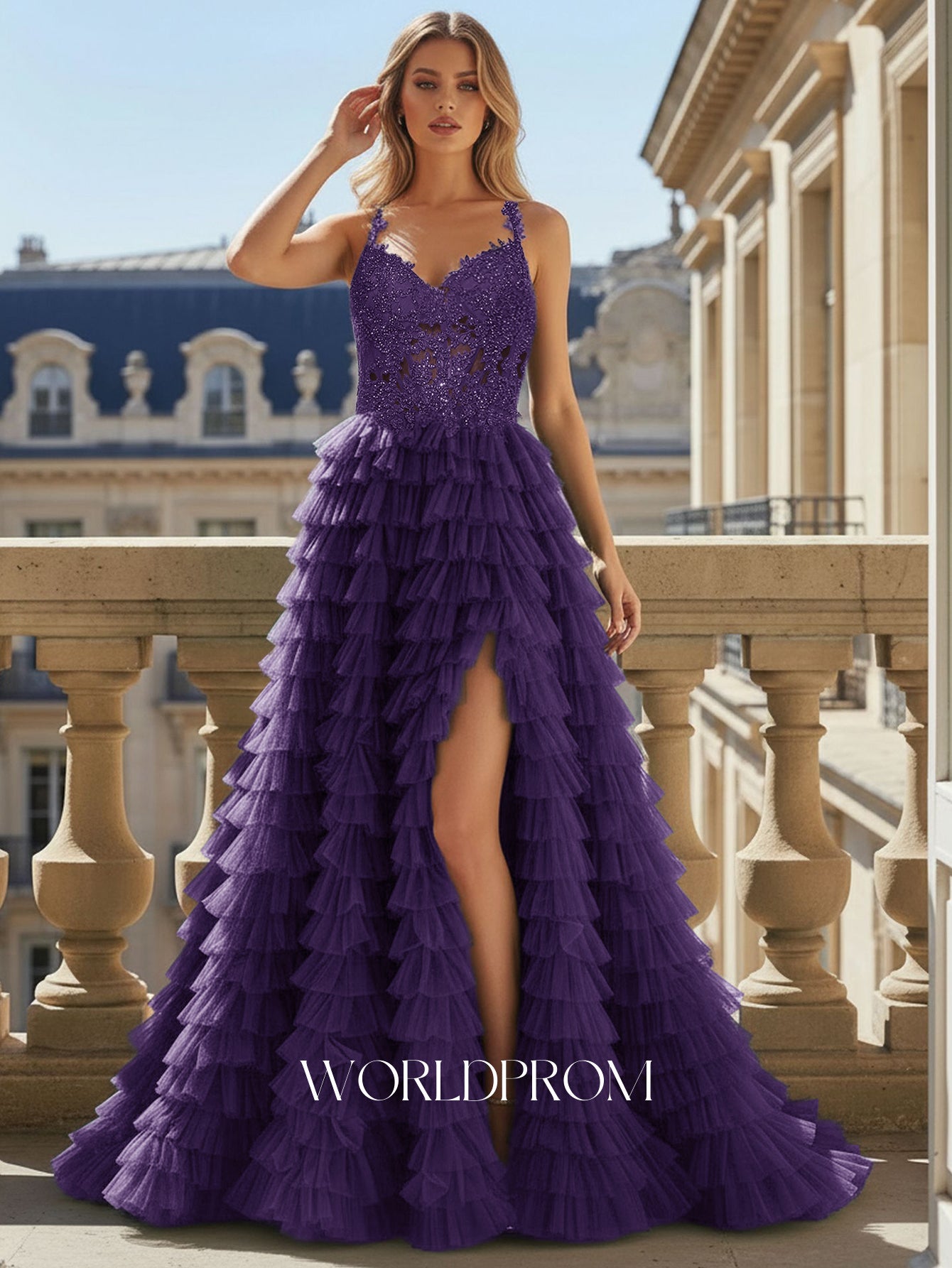Sparkly Bodice Spaghetti Strap Layered Slit Ball Gown Prom Dress - Purple