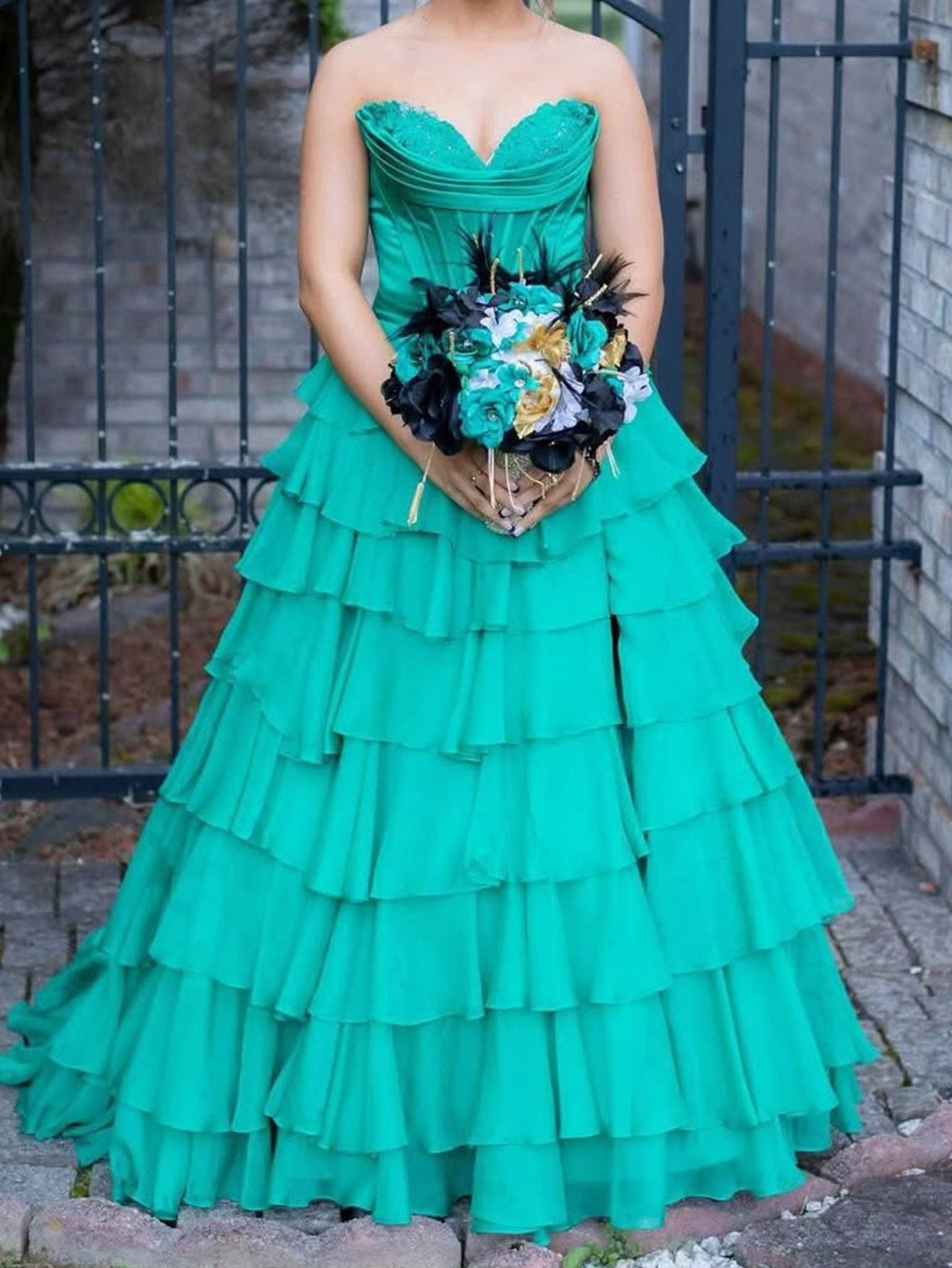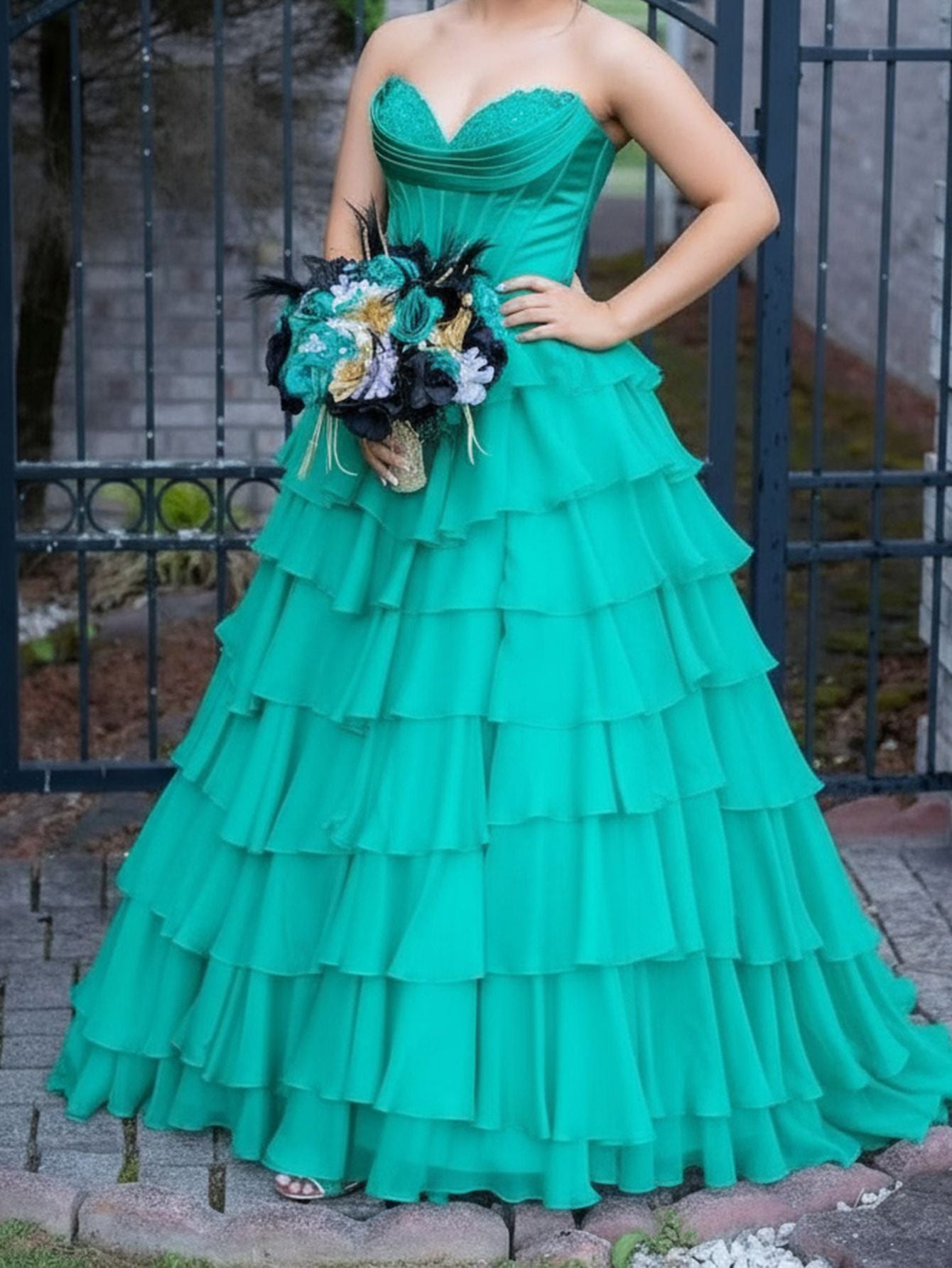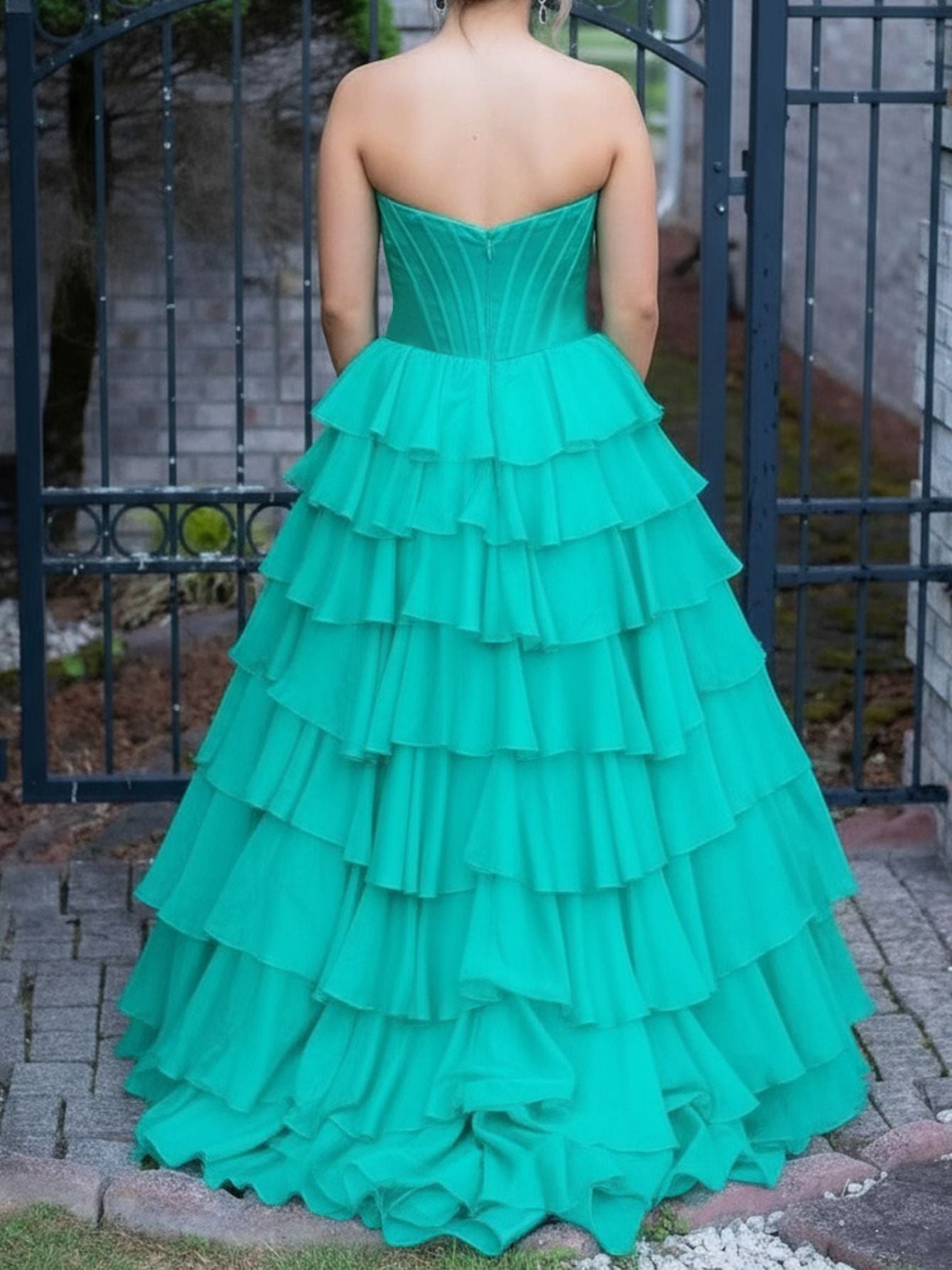 This chiffon prom dress features turquoise chiffon and lace up on the bodice. The strapless dress for prom party has a sweetheart neck and ruffle hem. This fashion ball gown dress for cocktail is ideal for party, evening or festivals.