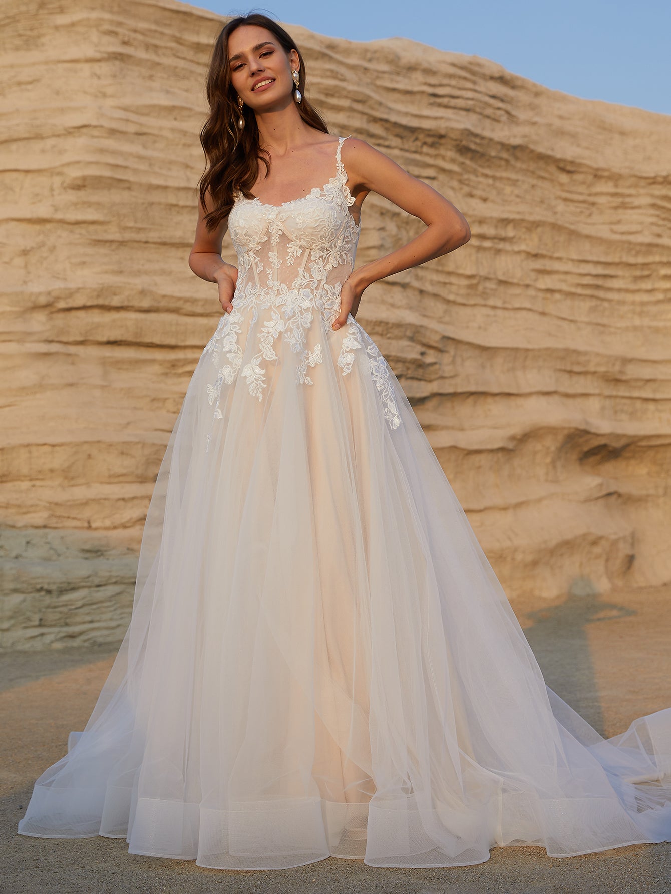 Lace Sheer Embroidery Floral Ball Gown Garden Wedding Dress - Ivory