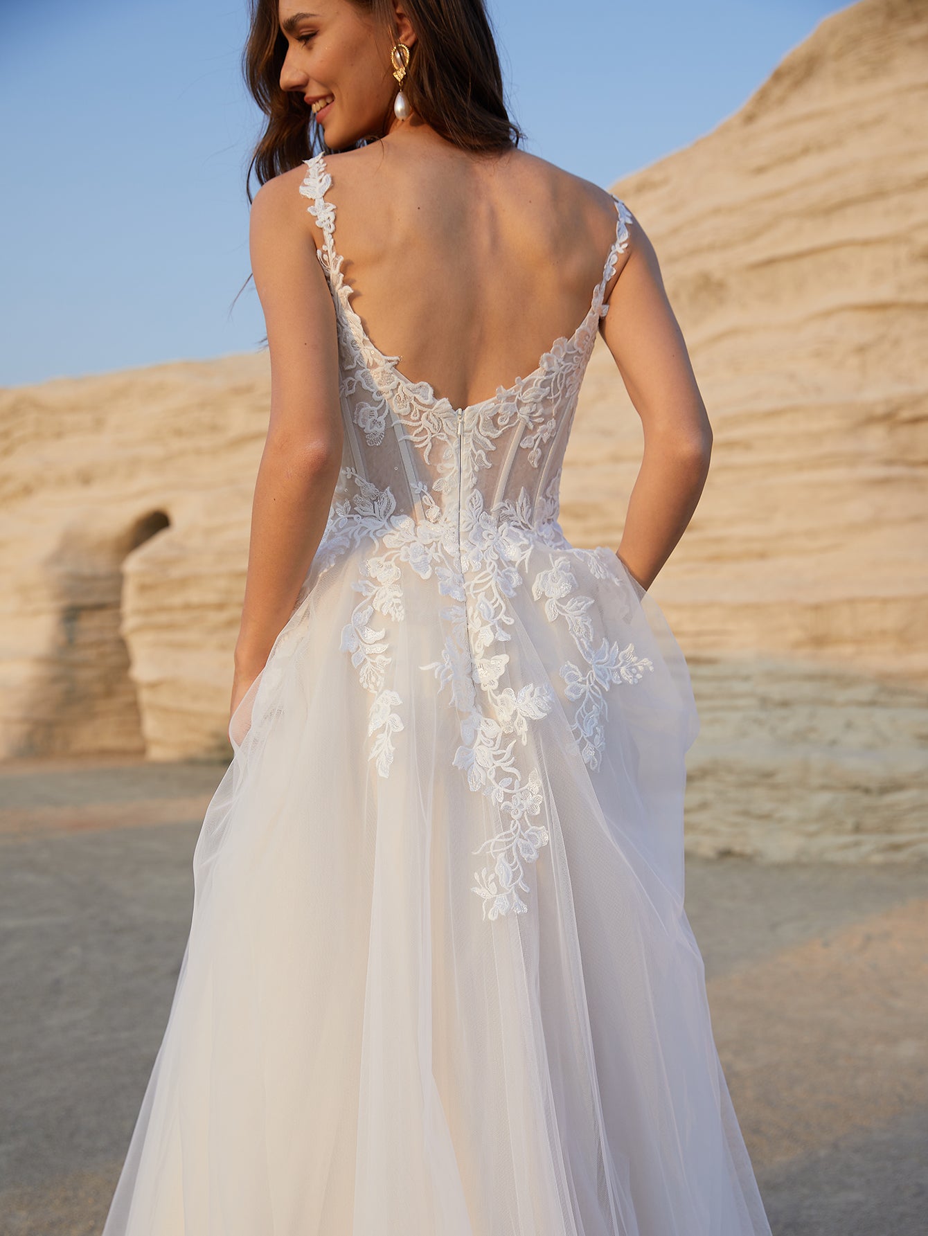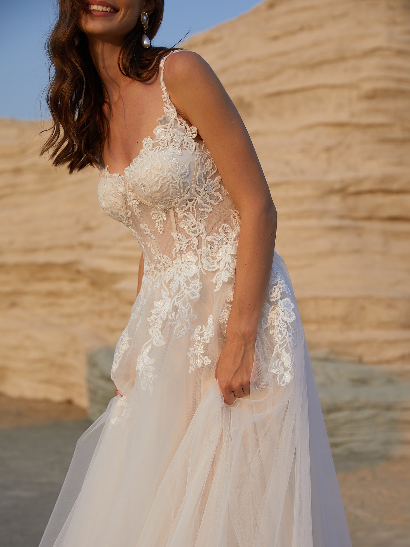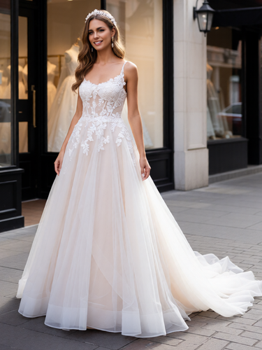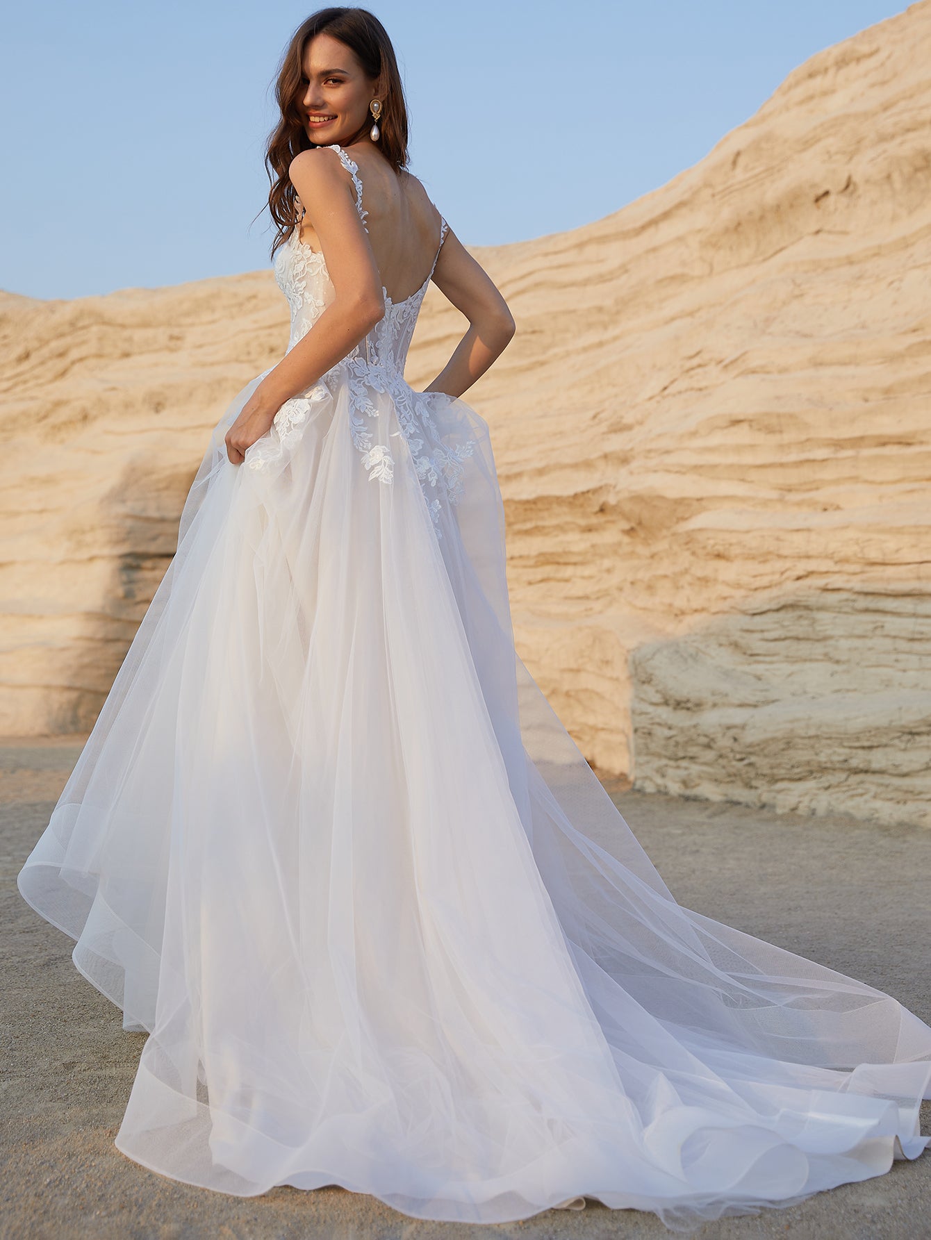 This floral bridal dress features lace embroidery with sheer net on the bodice. The spaghetti straps wedding shower dress has a sweetheart neck and tulle hem. The backless wedding gown is ideal for beach, wedding or wedding guest party.