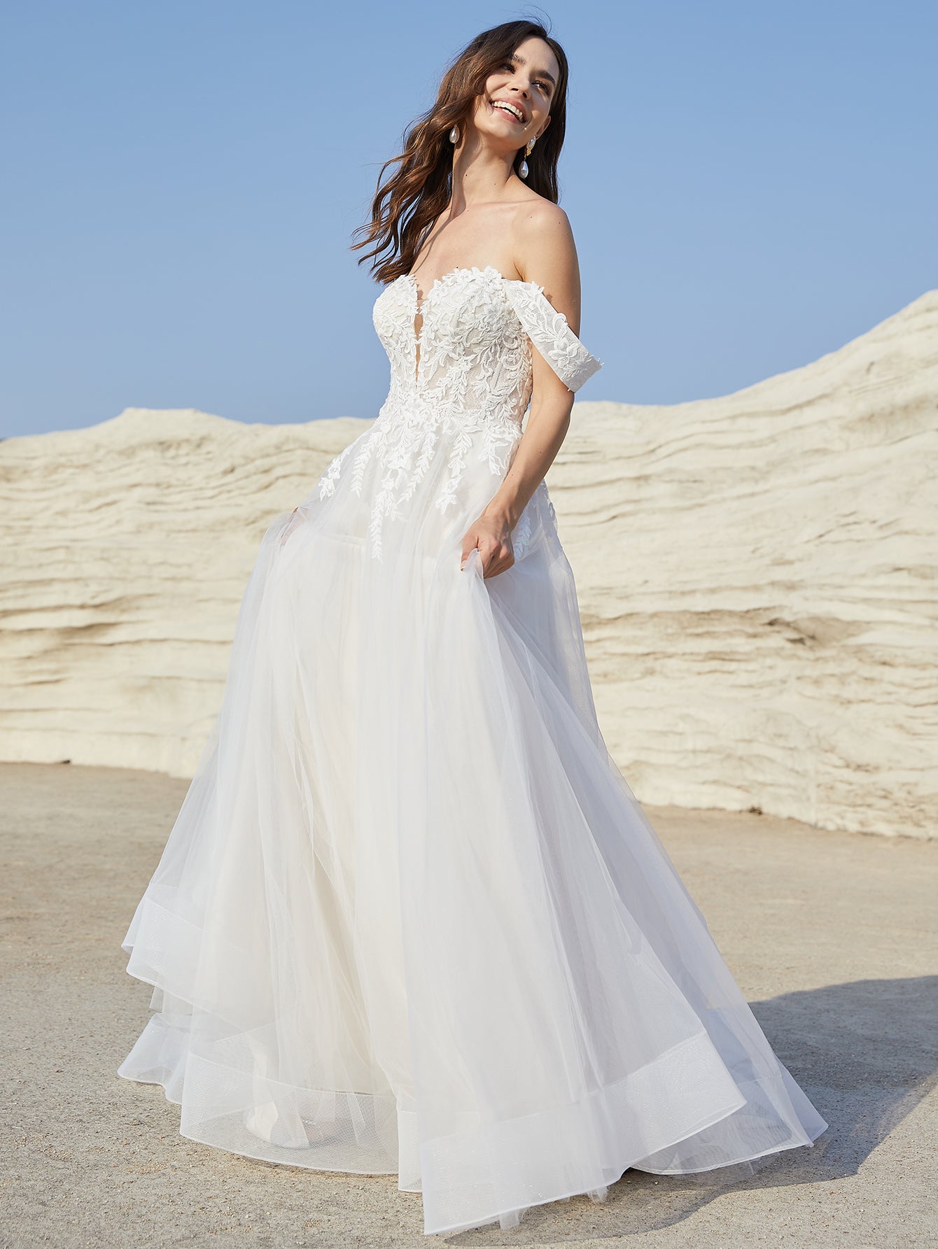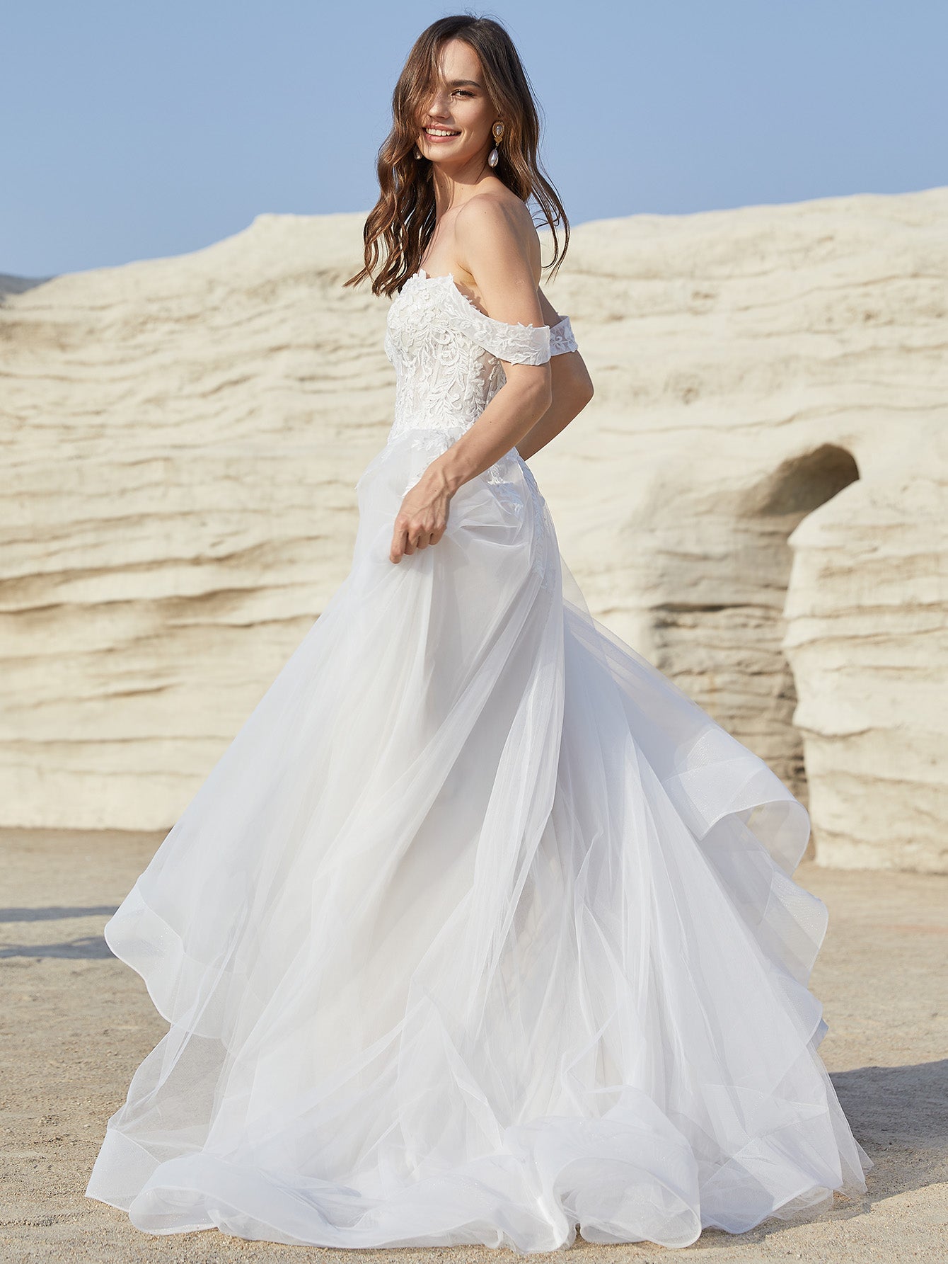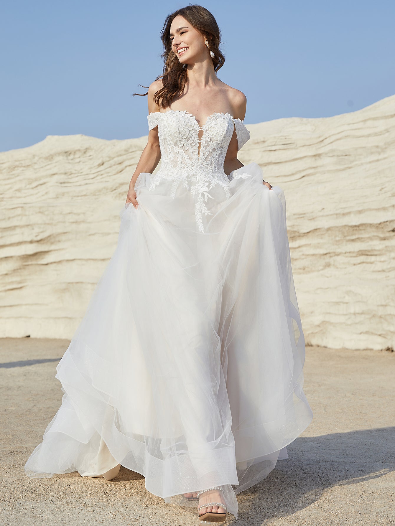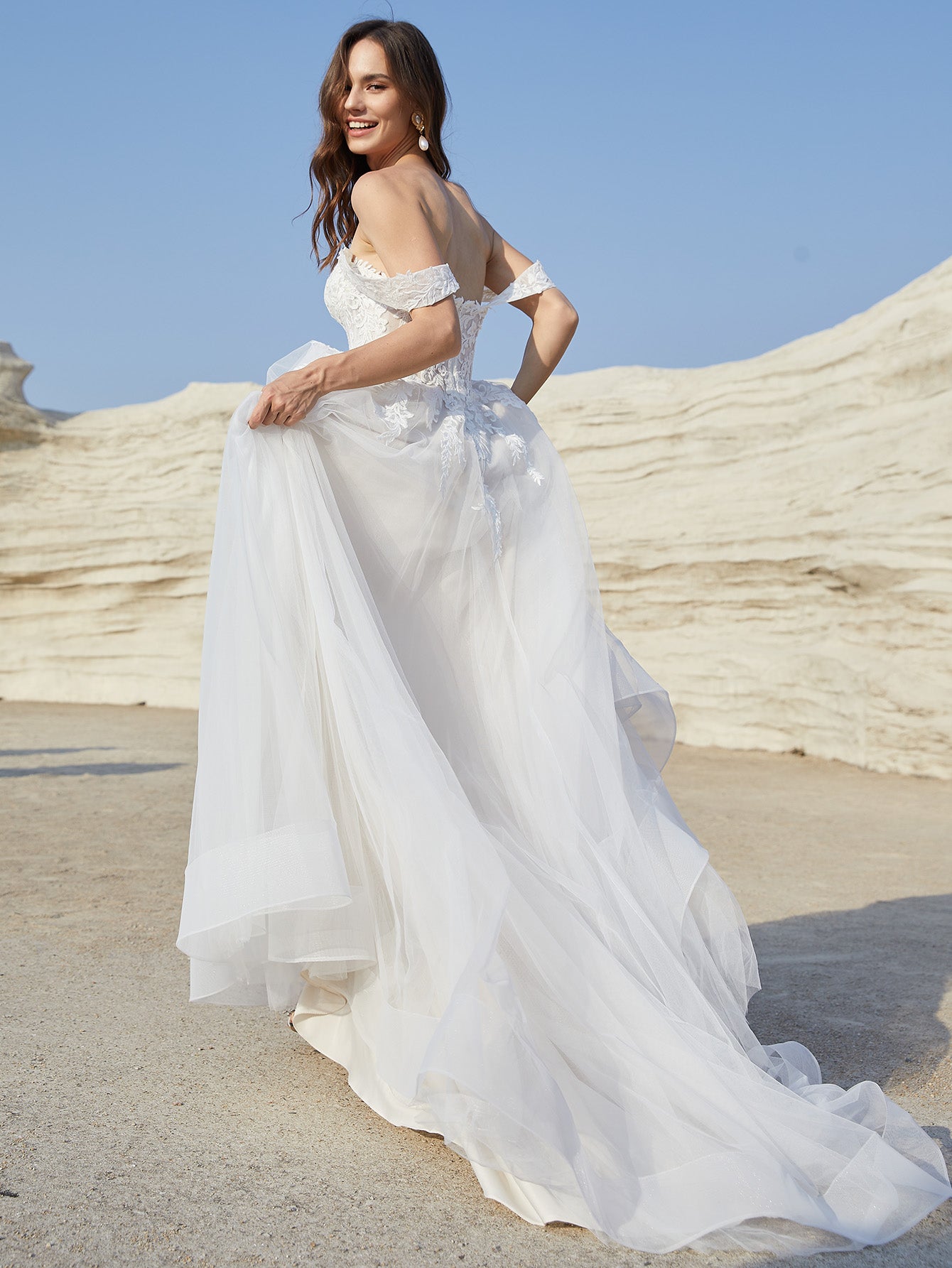 This backless bridal dress features lace embroidery and sheer net on the bodice. The off shoulder bridal gown has a deep v-neck and ball gown hem. This romantic wedding dress is ideal for beach, wedding or wedding guest party.