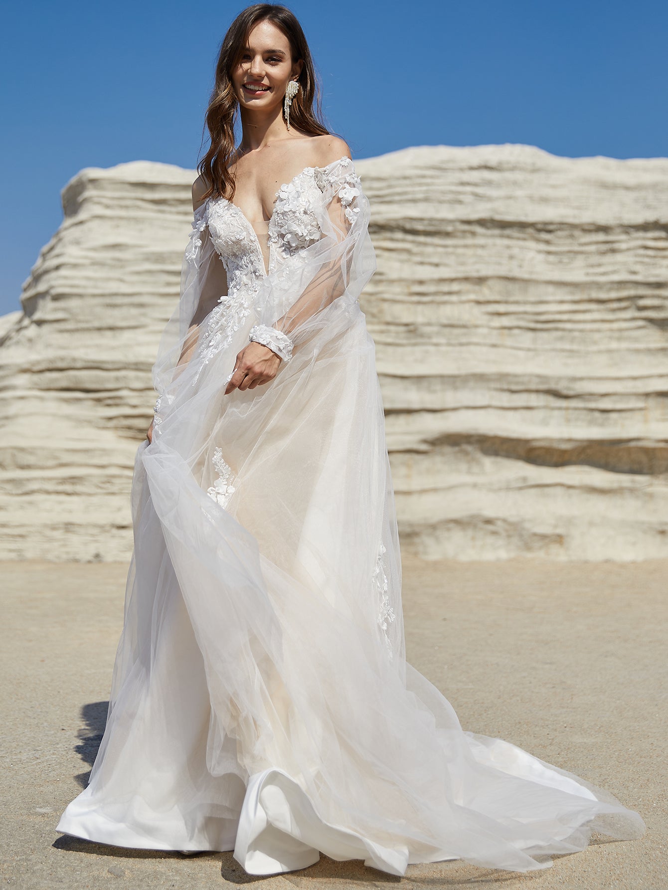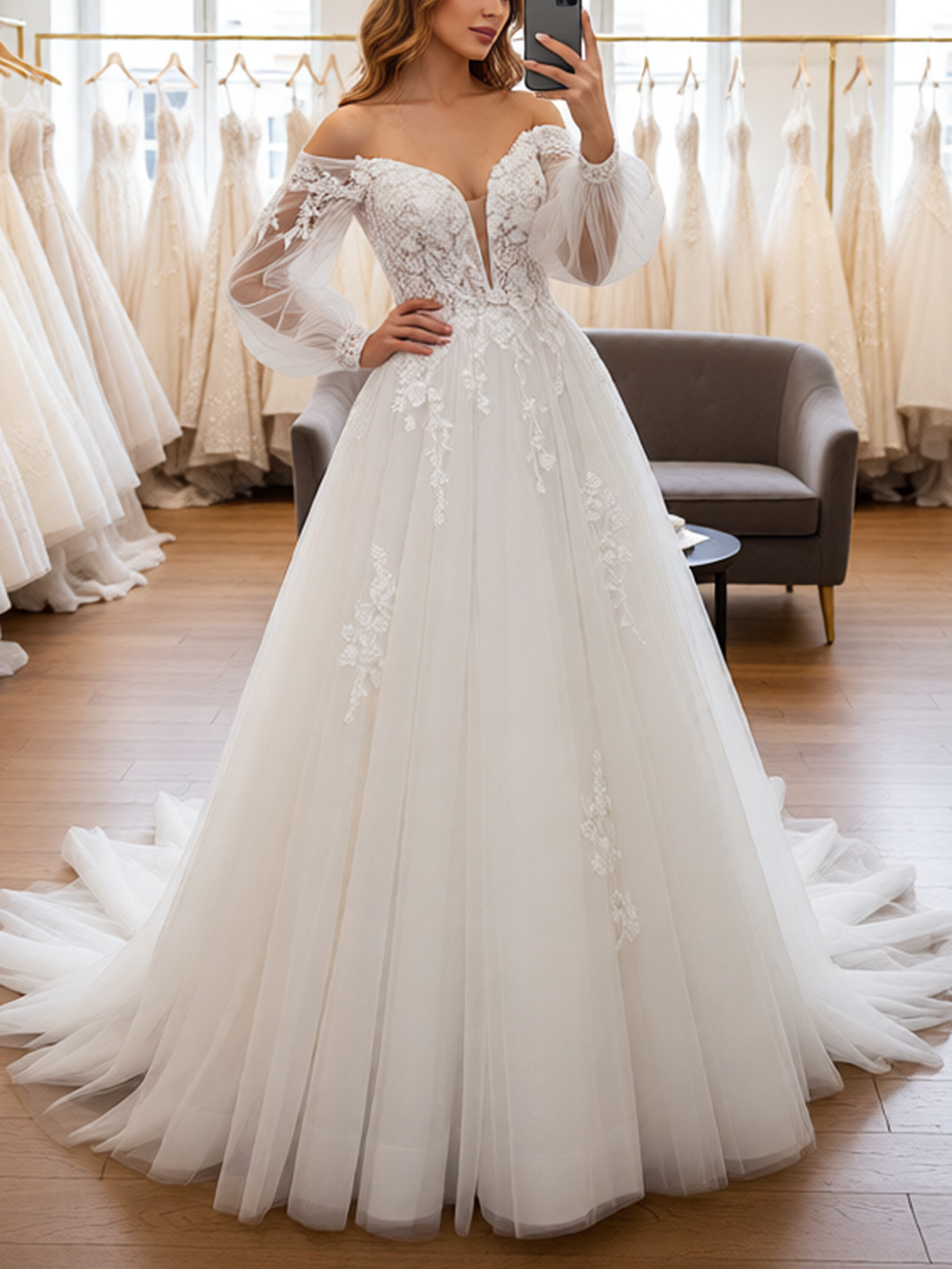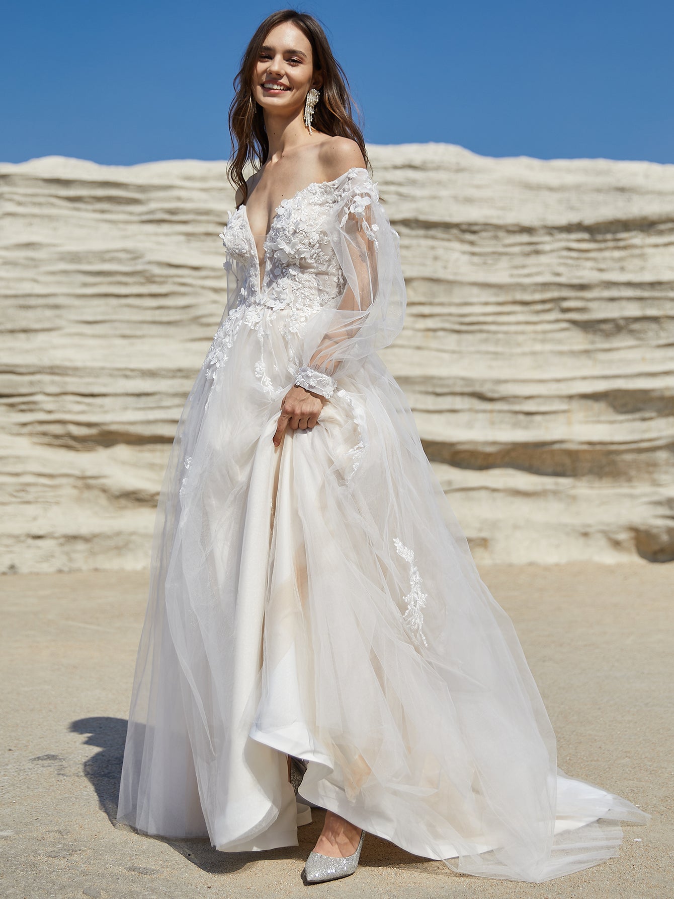 This boho bridal dress features lace floral embroidery with illusion sheer and puff sleeves. The off shoulder bridal gown has a deep v-neck and chapel train. This outdoor wedding dress is ideal for beach, wedding or wedding guest party.