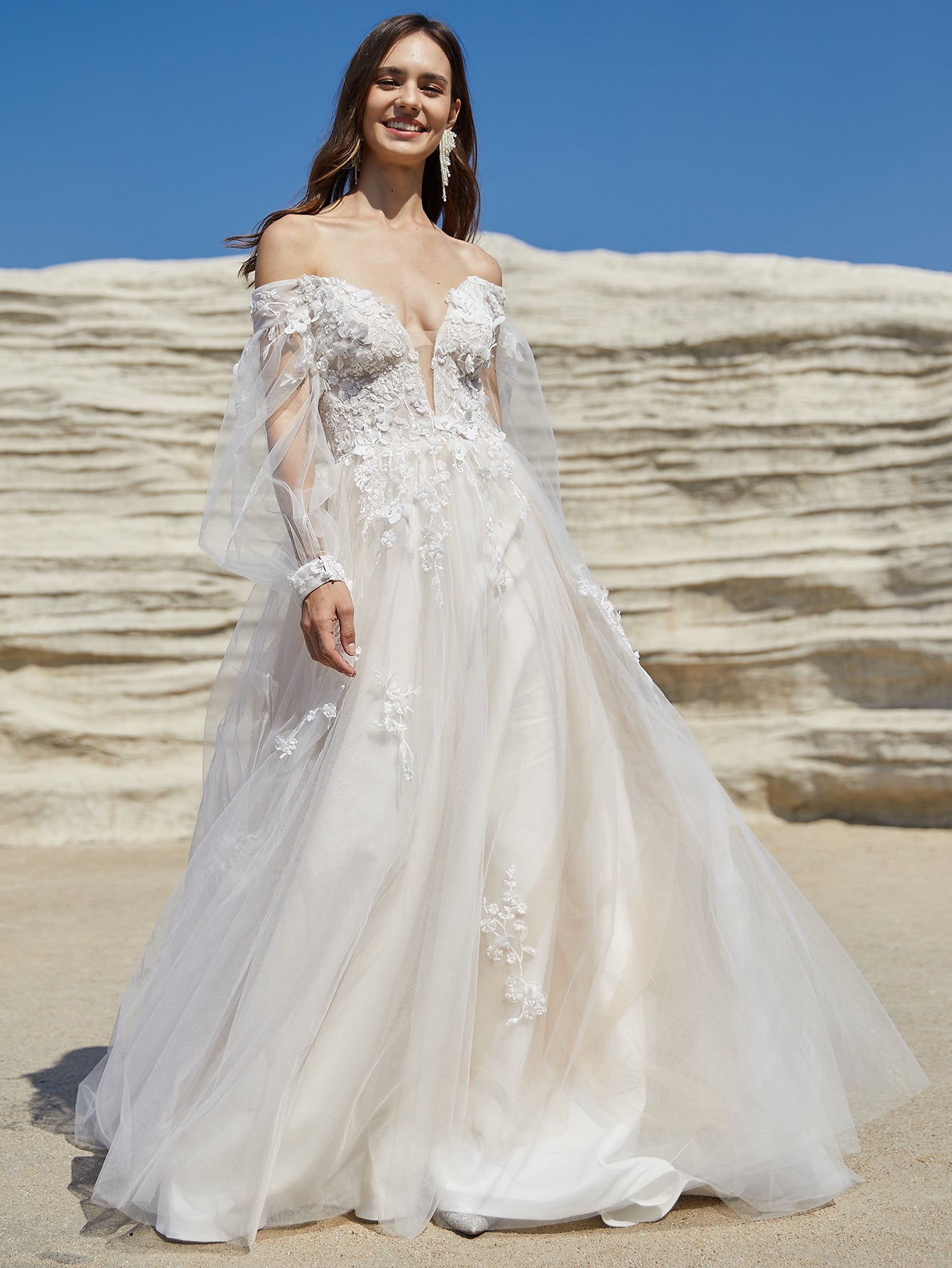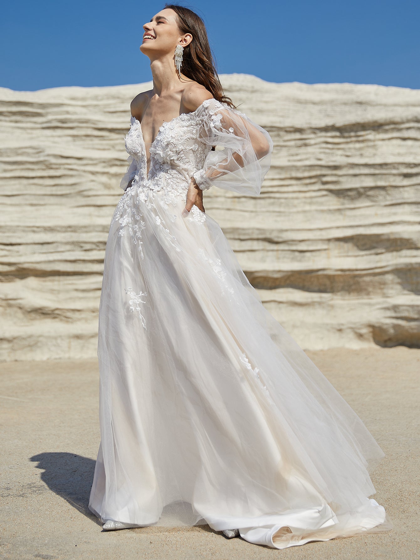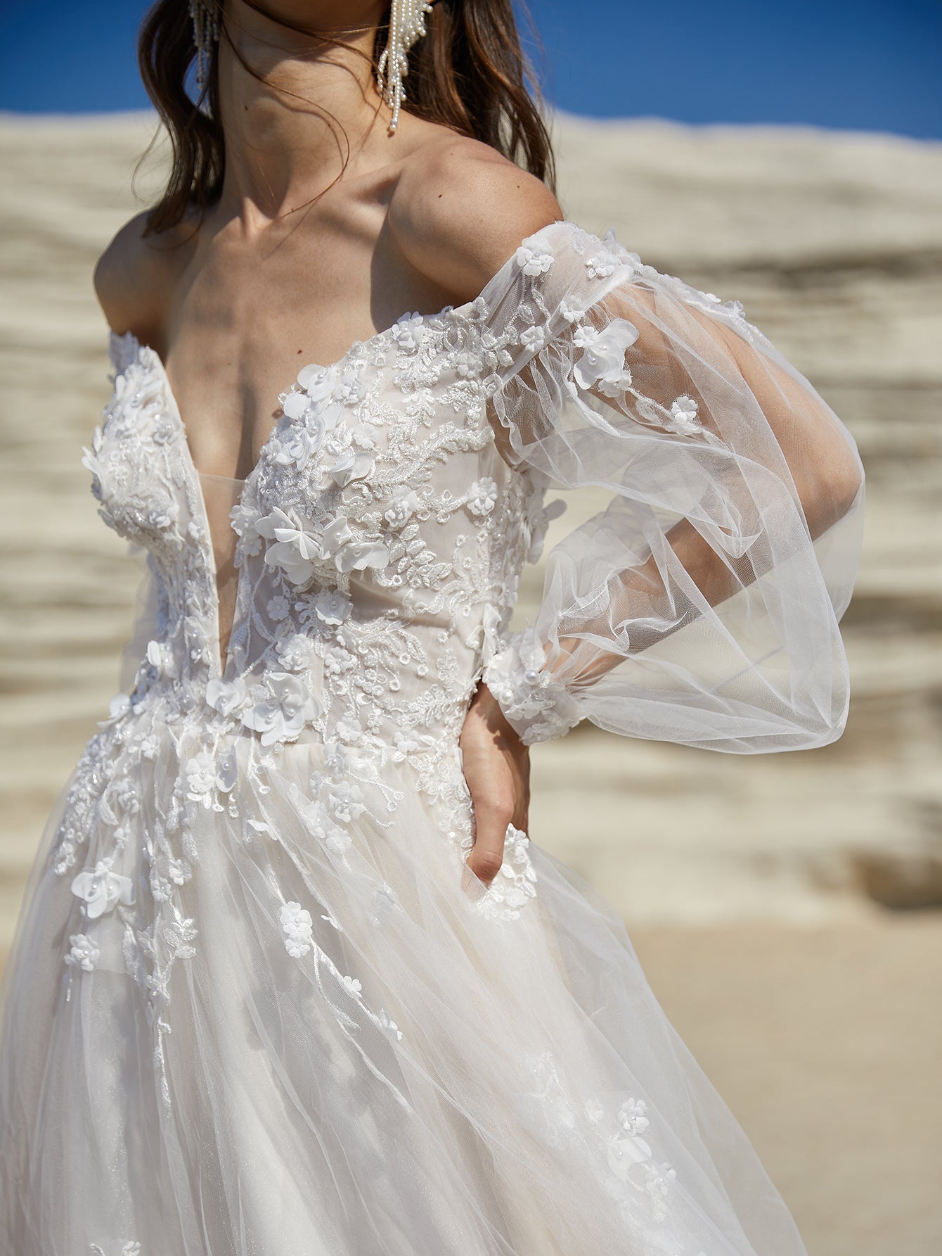 This boho bridal dress features lace floral embroidery with illusion sheer and puff sleeves. The off shoulder bridal gown has a deep v-neck and chapel train. This outdoor wedding dress is ideal for beach, wedding or wedding guest party.