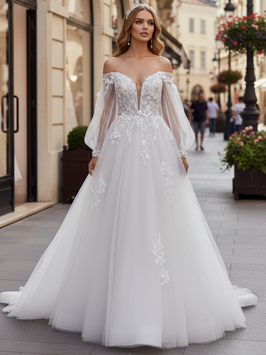Off Shoulder Puff Sleeve Ball Gown Outdoor Wedding Dress - Ivory