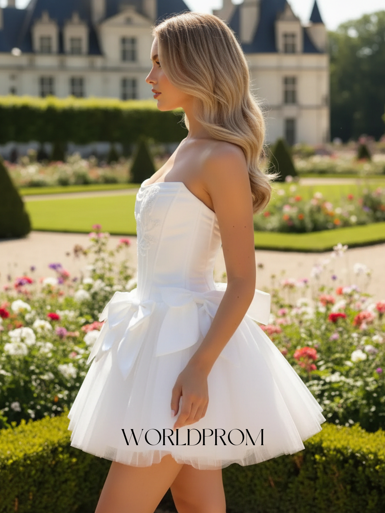 This satin short prom dress features hand beading with waist bow on the bodice. The strapless mini dress has a boat neck and ball gown hem. The little white hoco dress is ideal for graduation party, homecoming or prom party.