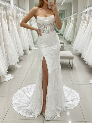 This lace prom gown features ruched embroidery on the illusion bodice. The strapless dress has a scoop neckline and split hem. Worldprom mermaid prom dresses are ideal for party, evening or festivals.