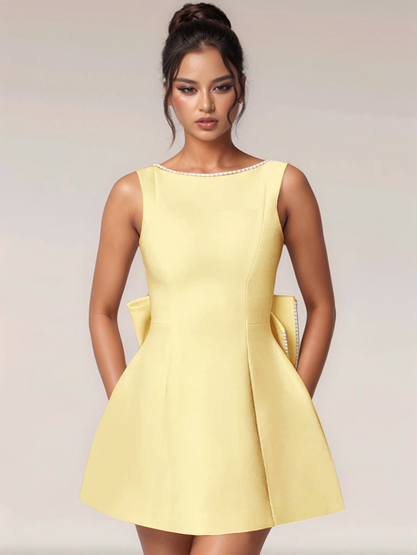 Hand Beading Backless Bow Ball Gown Prom Bridal Mini Dress - Yellow