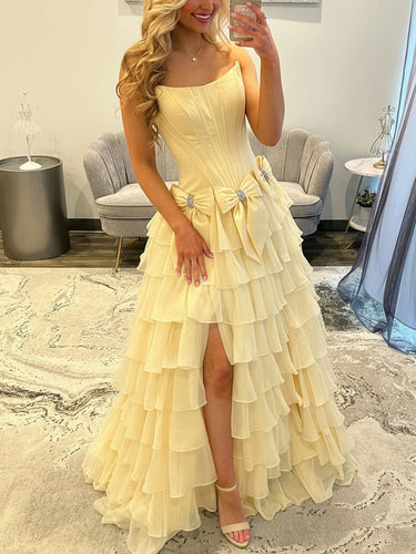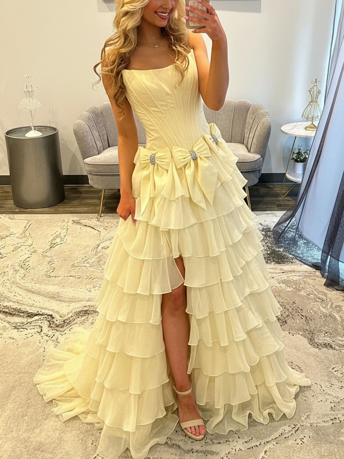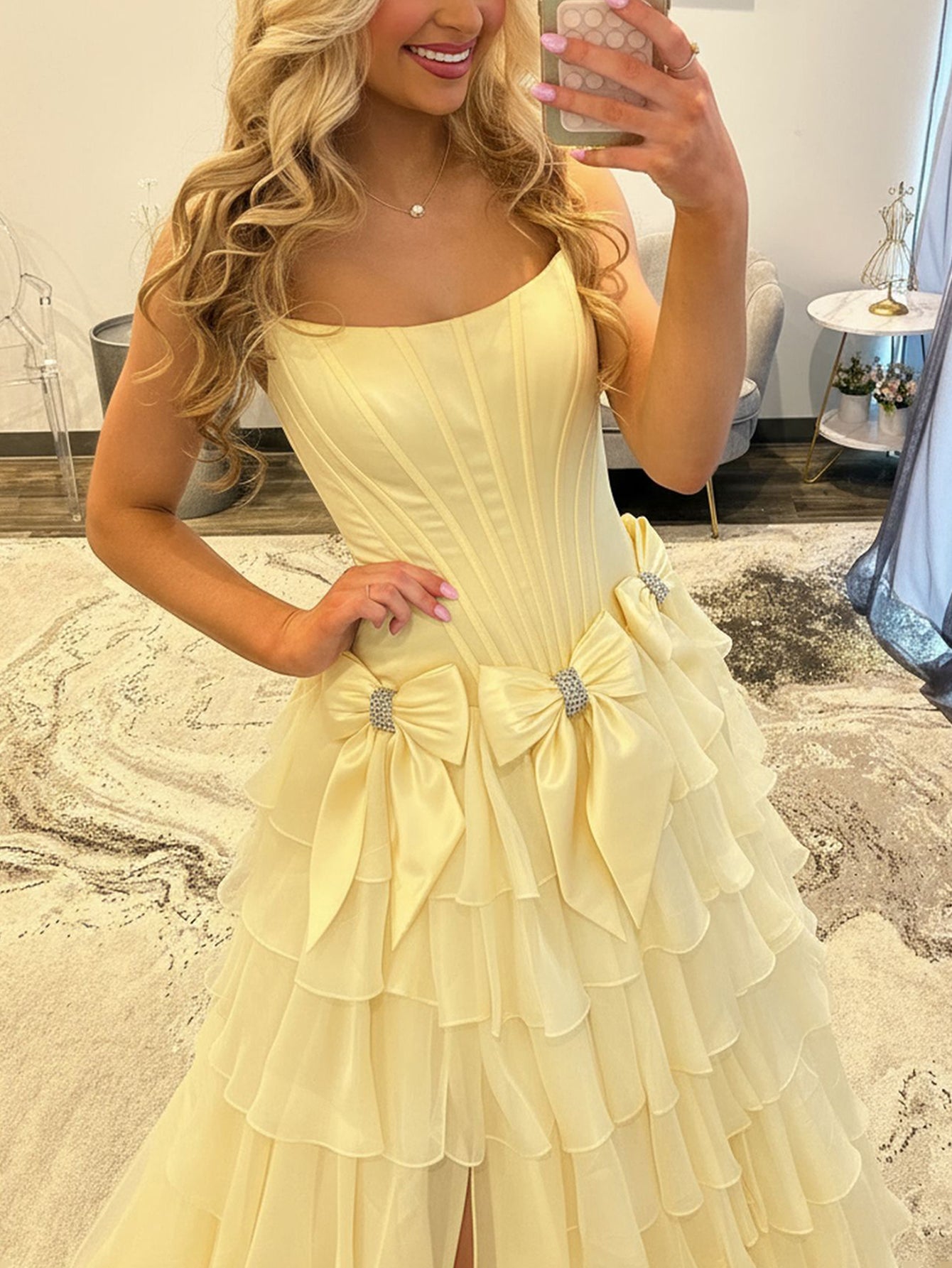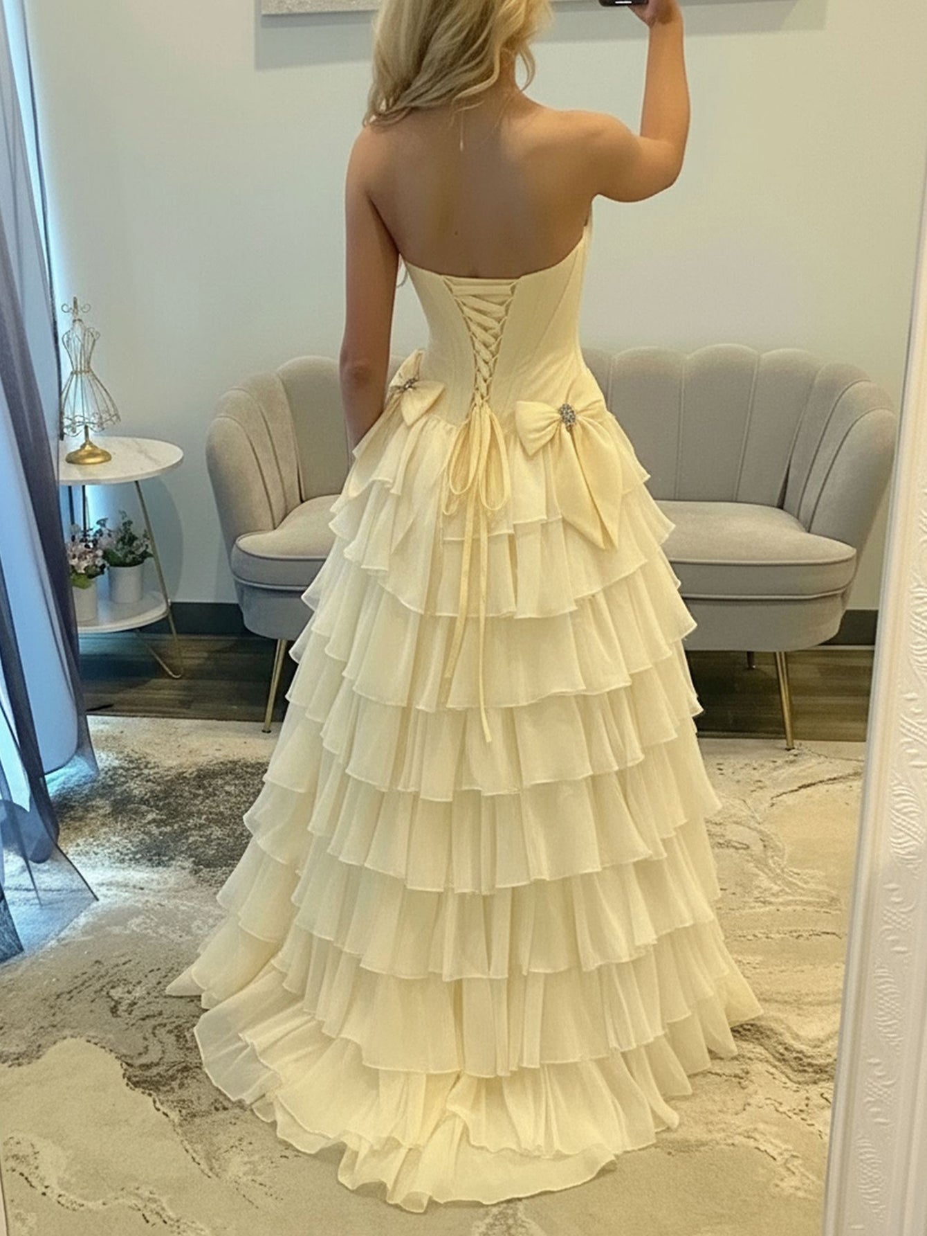 Boned Strapless Tiered Ball Gown Prom Dress Long With Bow - Yellow