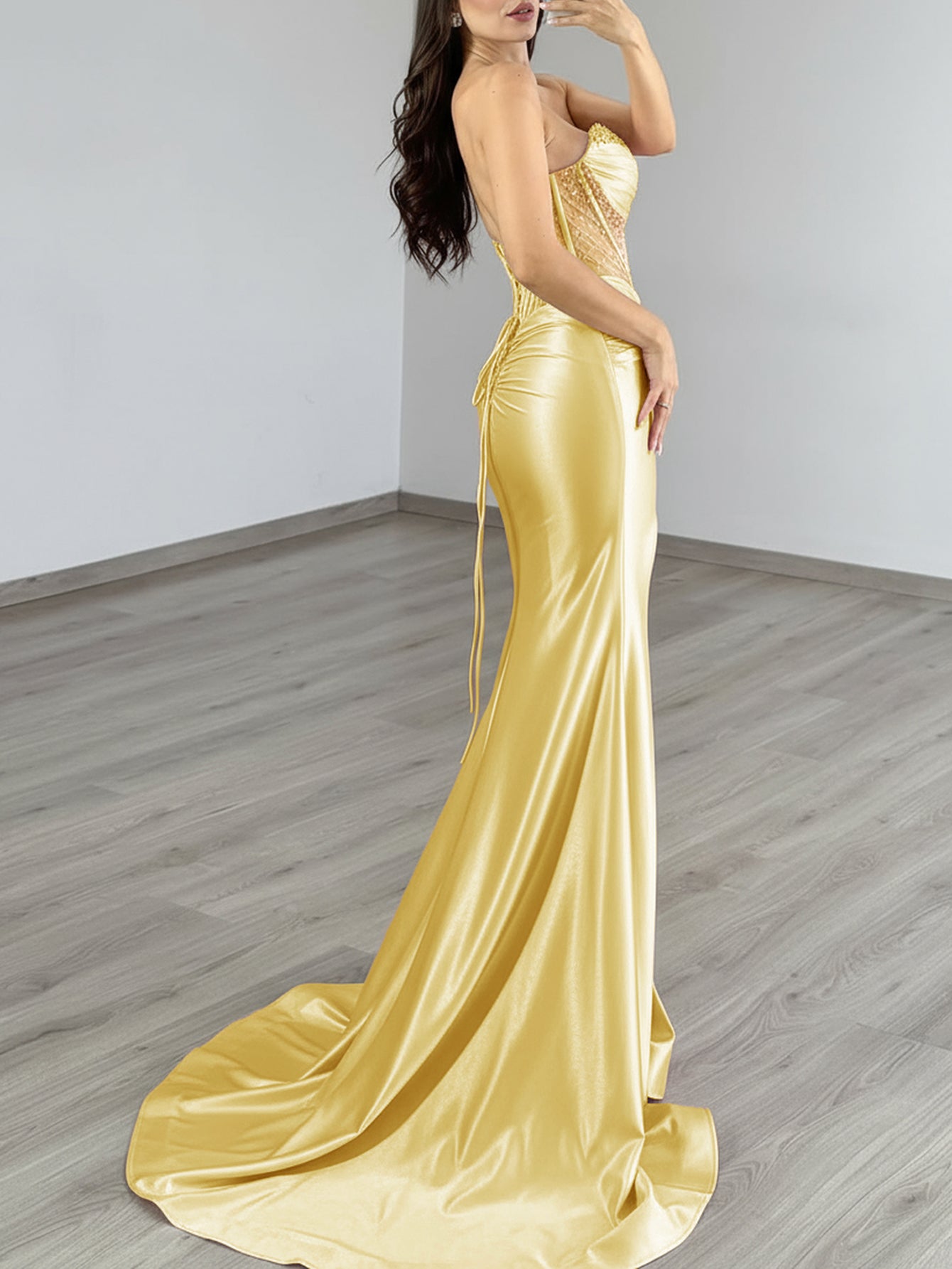 This stretch satin prom gown features hand-beading and cutout crystals on the illusion bodice. The strapless maxi sheer dress has a sweetheart neckline and pleated hem. This mermaid split dress is ideal for party, evening or festivals.