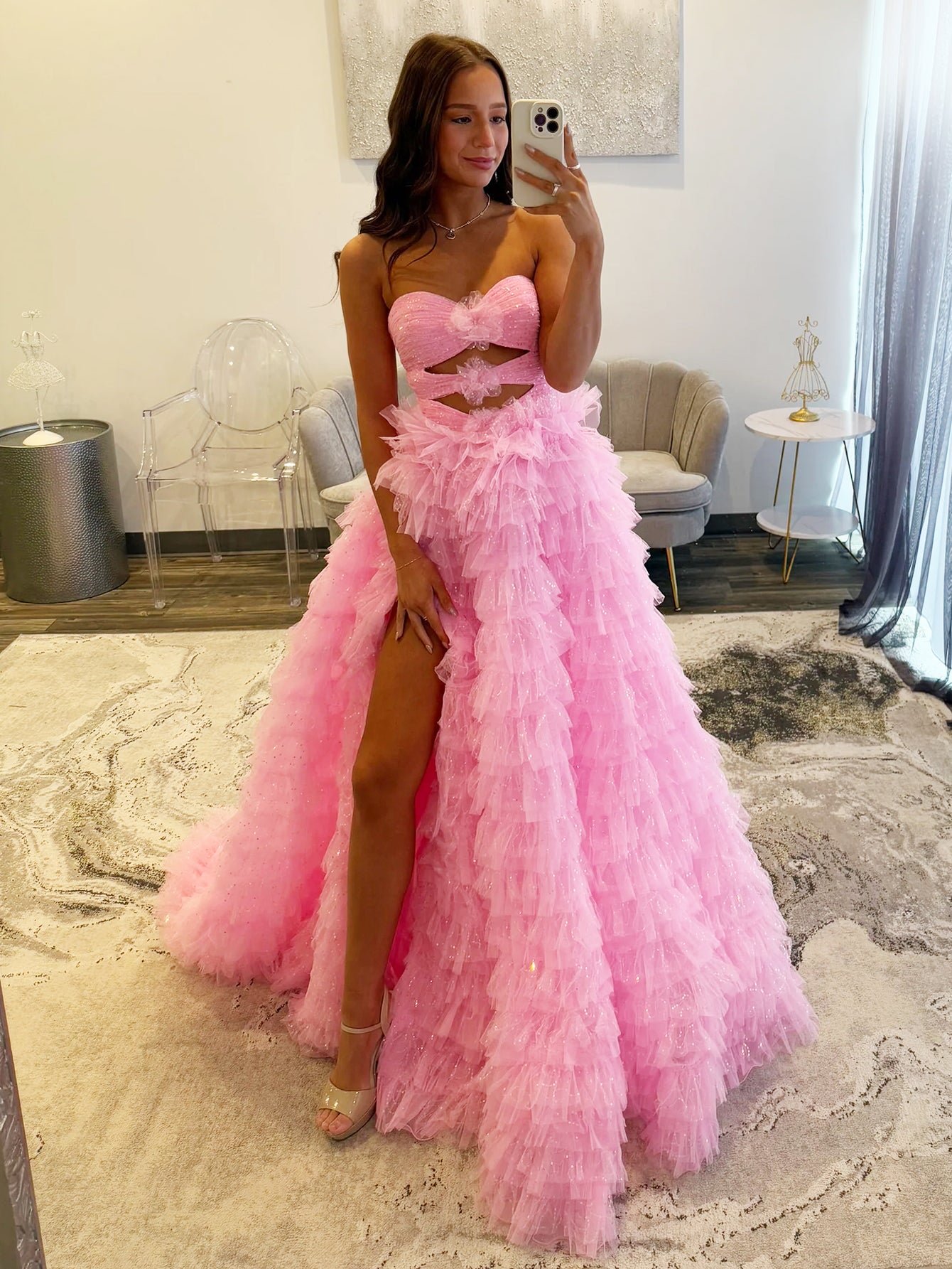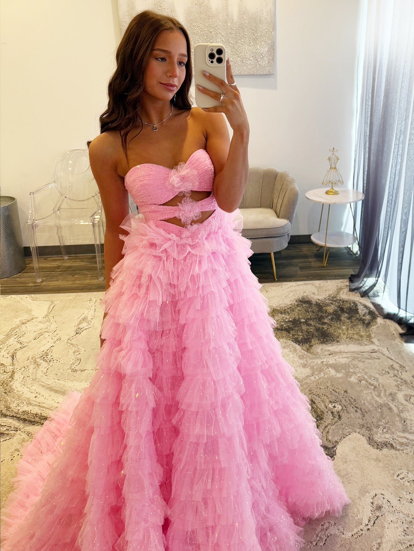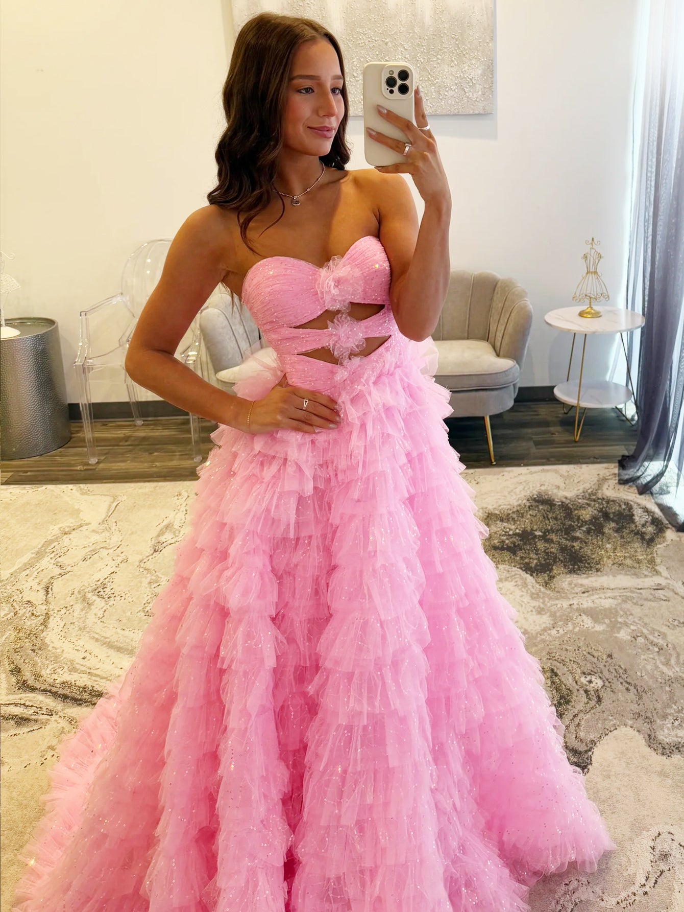 3D Flower Cut Out Sparkly Tiered Ball Gown Prom Dress - Pink