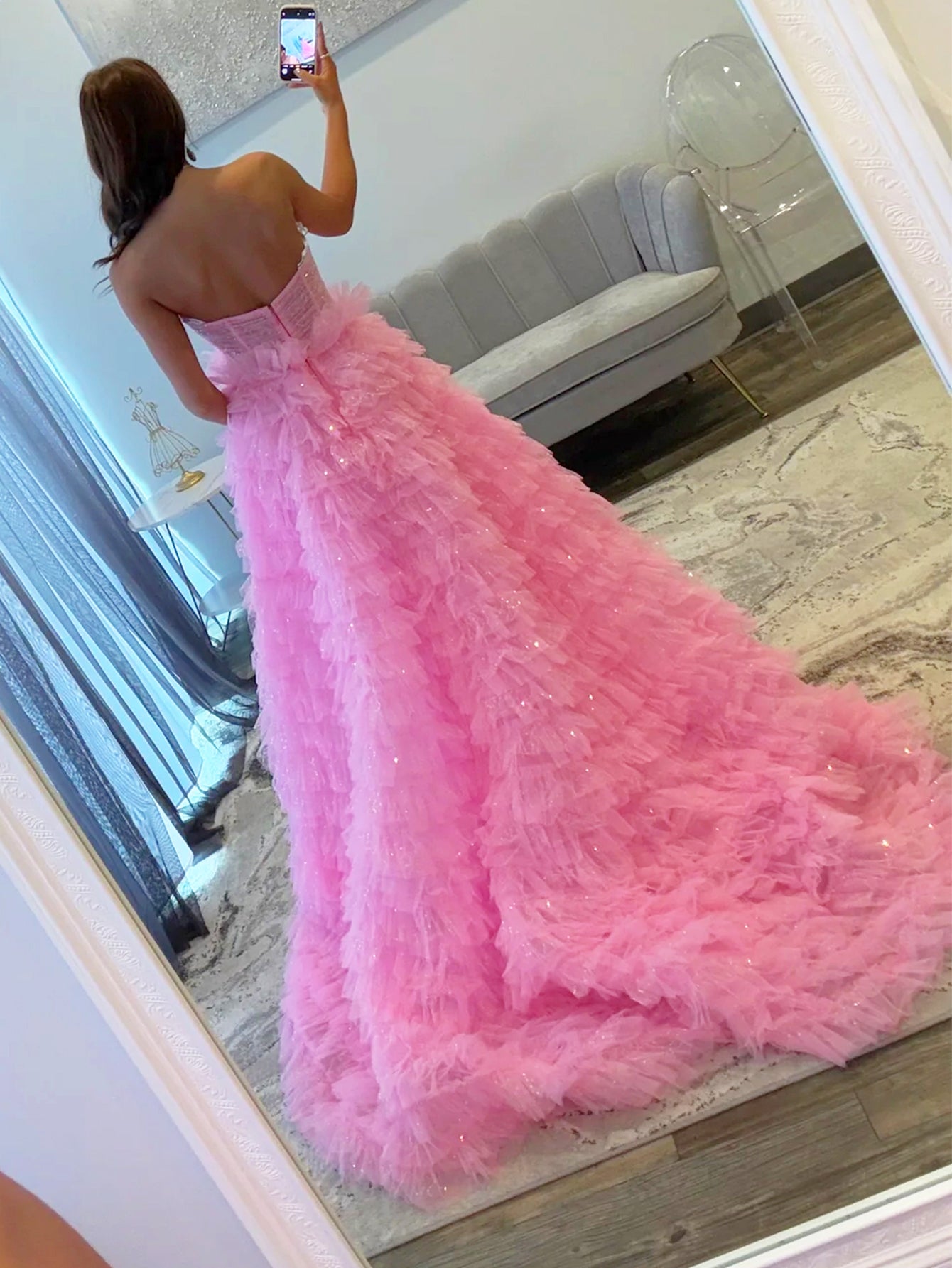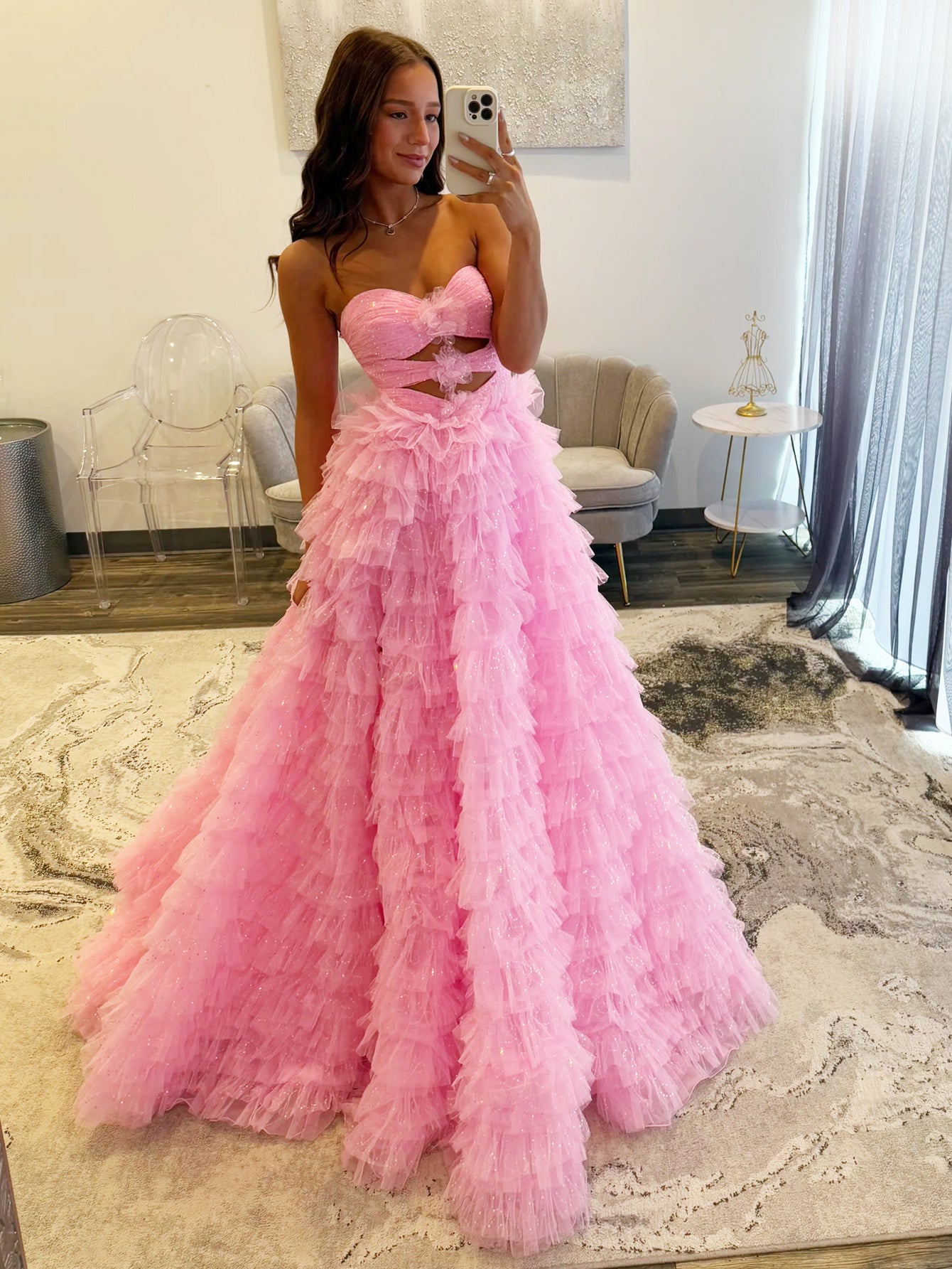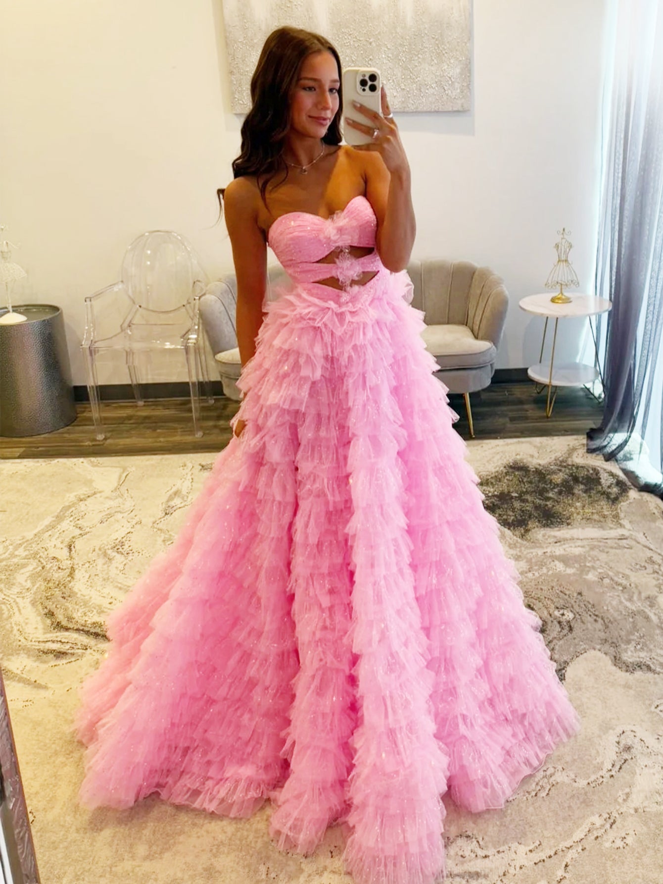 3D Flower Cut Out Sparkly Tiered Ball Gown Prom Dress - Pink