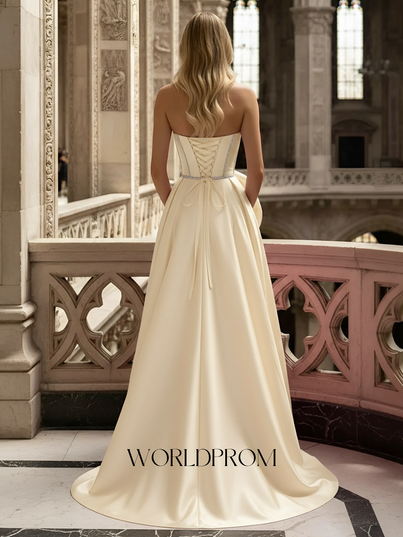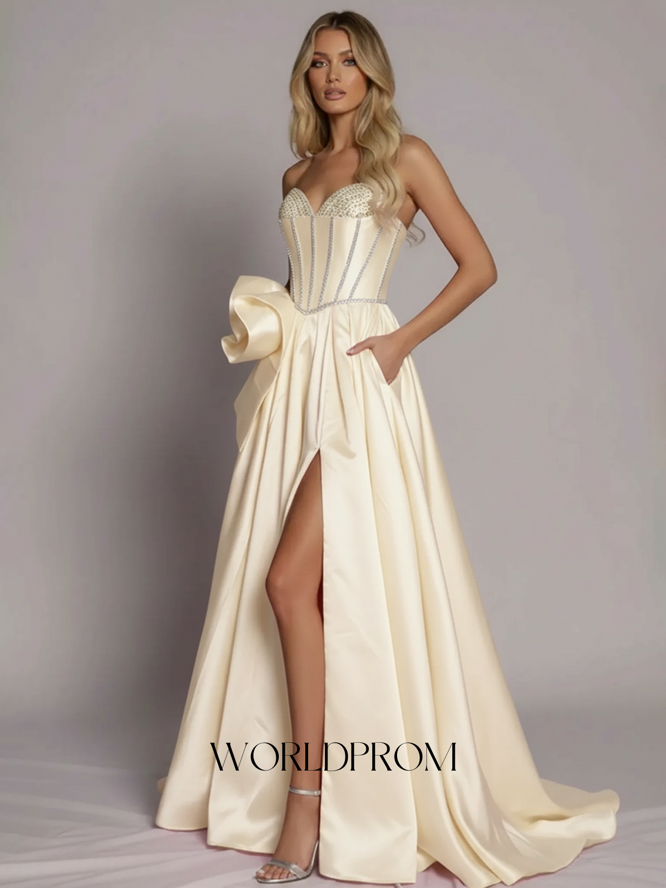 This satin prom gown features crystal bust with 3d flower on the bodice. The strapless dress has a sweetheart neckline and pleated hem with slit. Worldprom a-line prom dresses are ideal for party, evening or festivals.