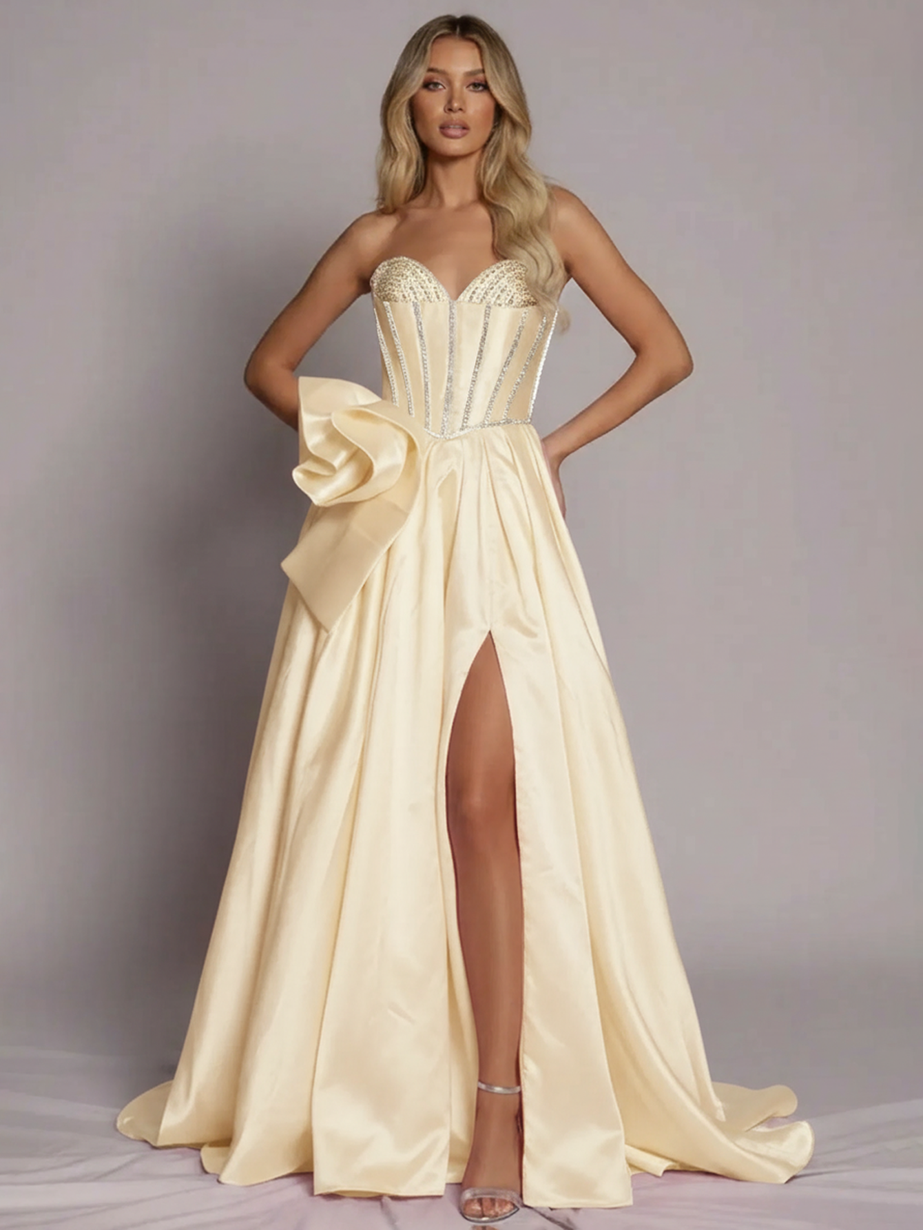 3D Flower Hot Fix Crystal Pleated Corset Long A-Line Prom Dress With Slit - Champagne