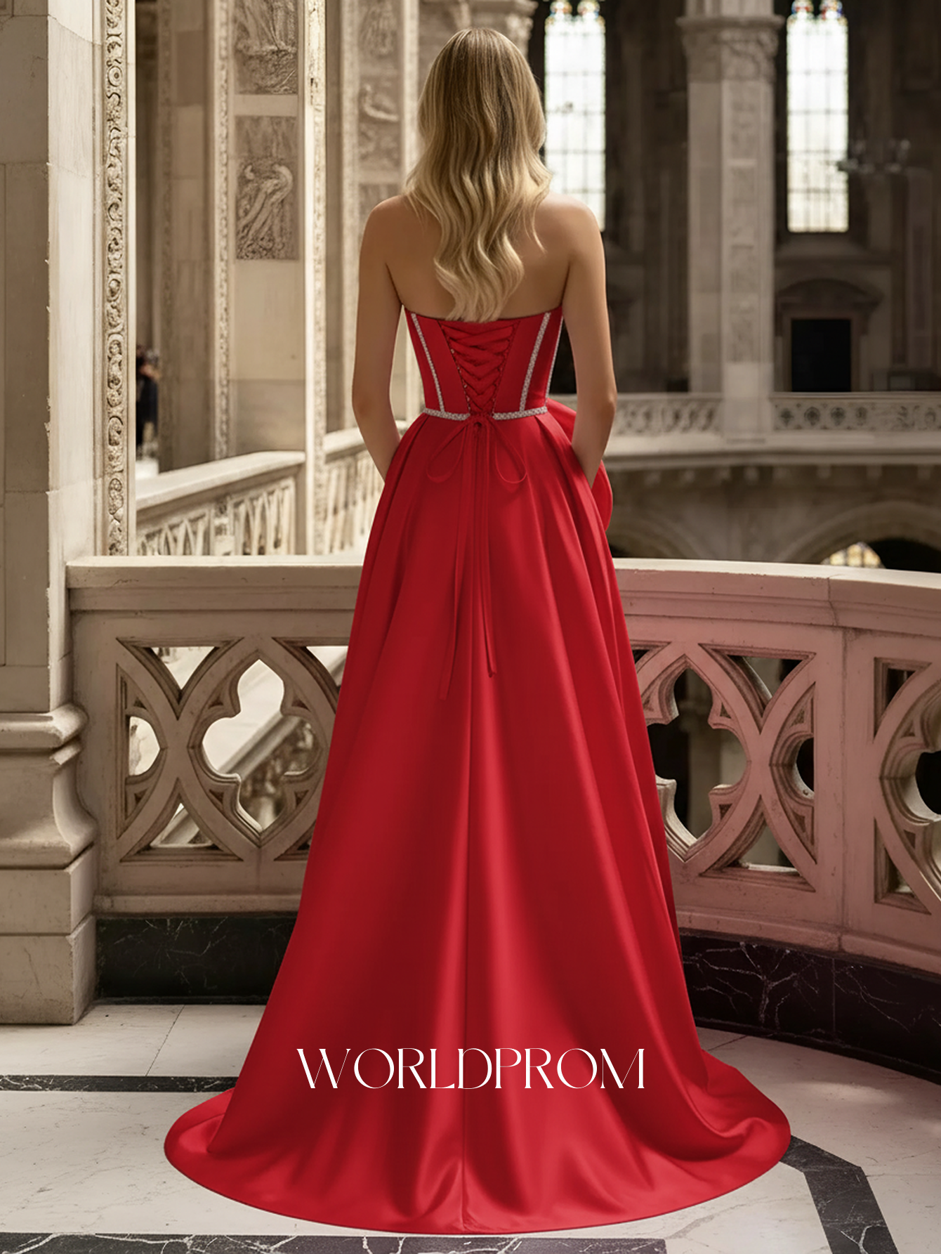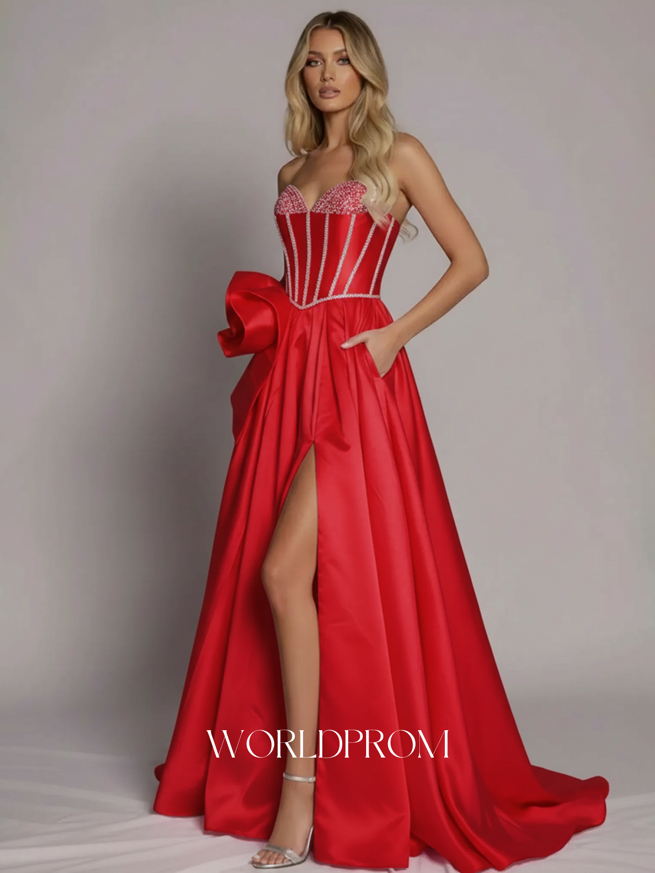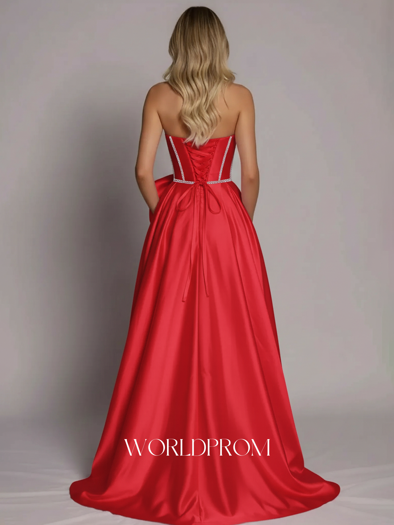 This satin prom gown features crystal bust with 3d flower on the bodice. The strapless dress has a sweetheart neckline and pleated hem with slit. Worldprom a-line prom dresses are ideal for party, evening or festivals.