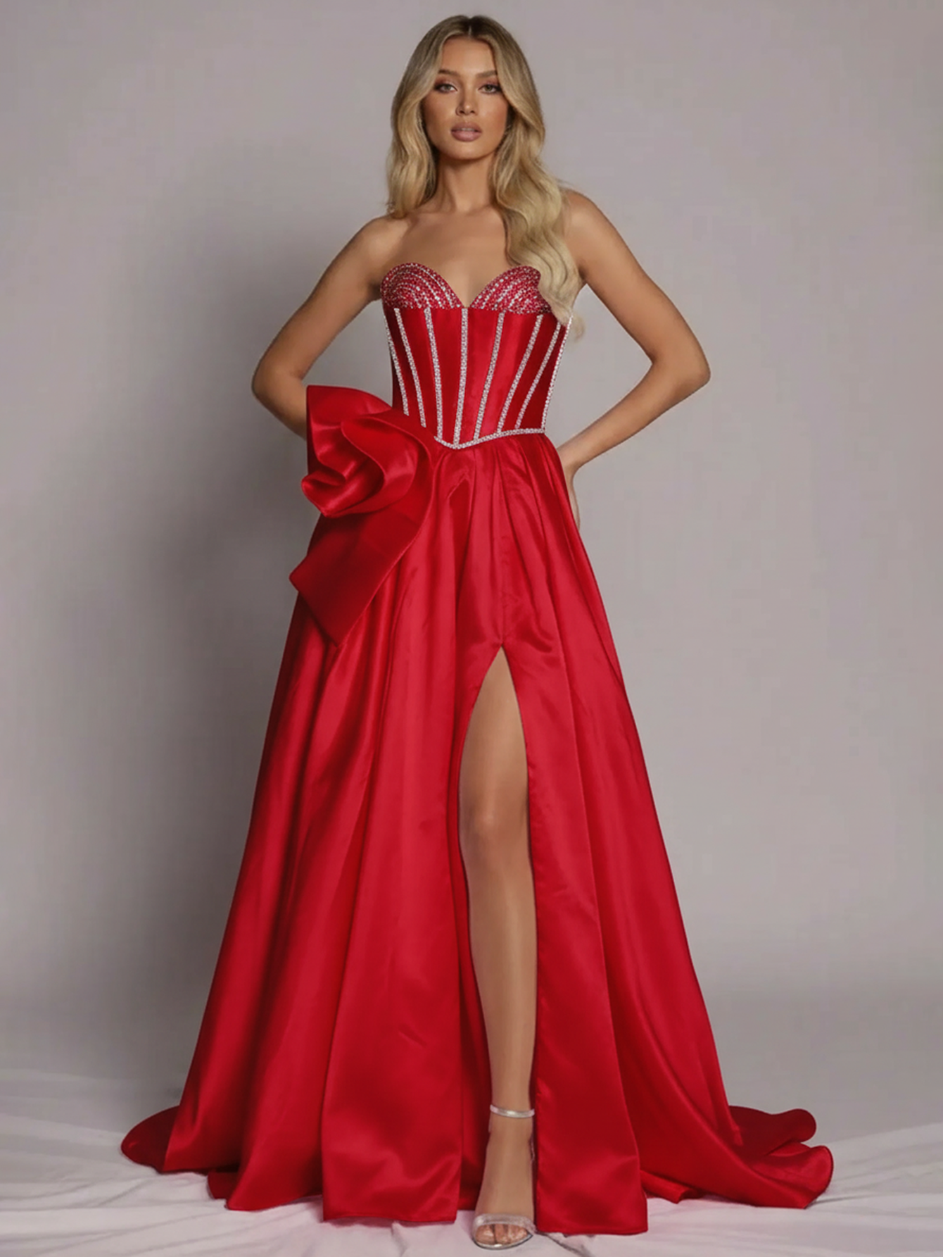 3D Flower Hot Fix Crystal Pleated Corset Long A-Line Prom Dress With Slit - Red