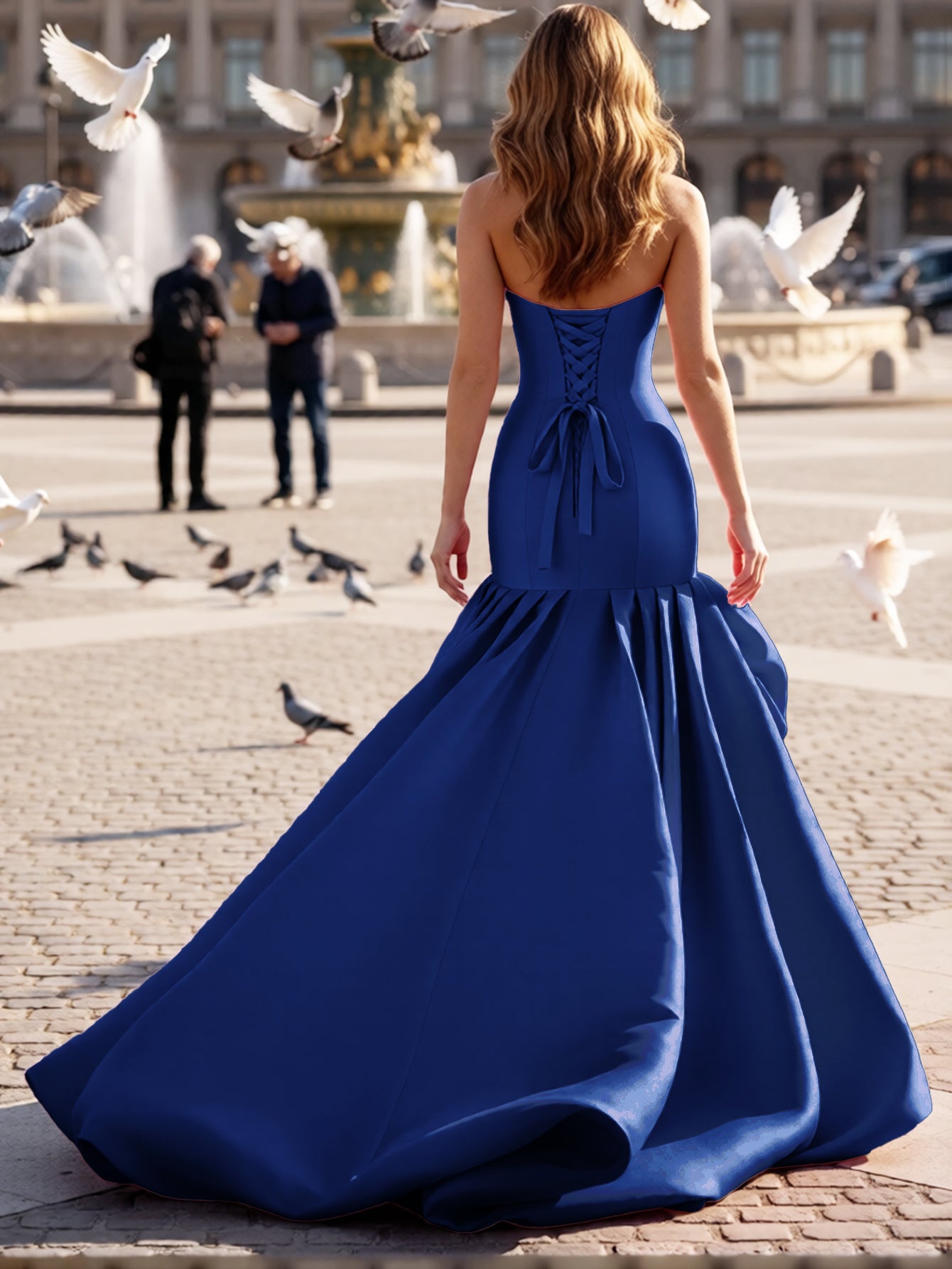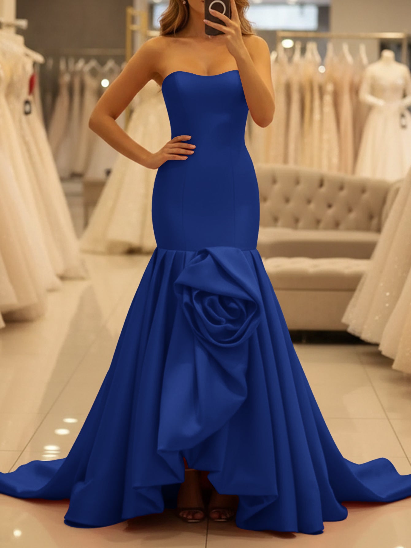 3D Flower Strapless Satin Corset Pleated Lace up Long Mermaid Prom Dress With Slit - Royal Blue