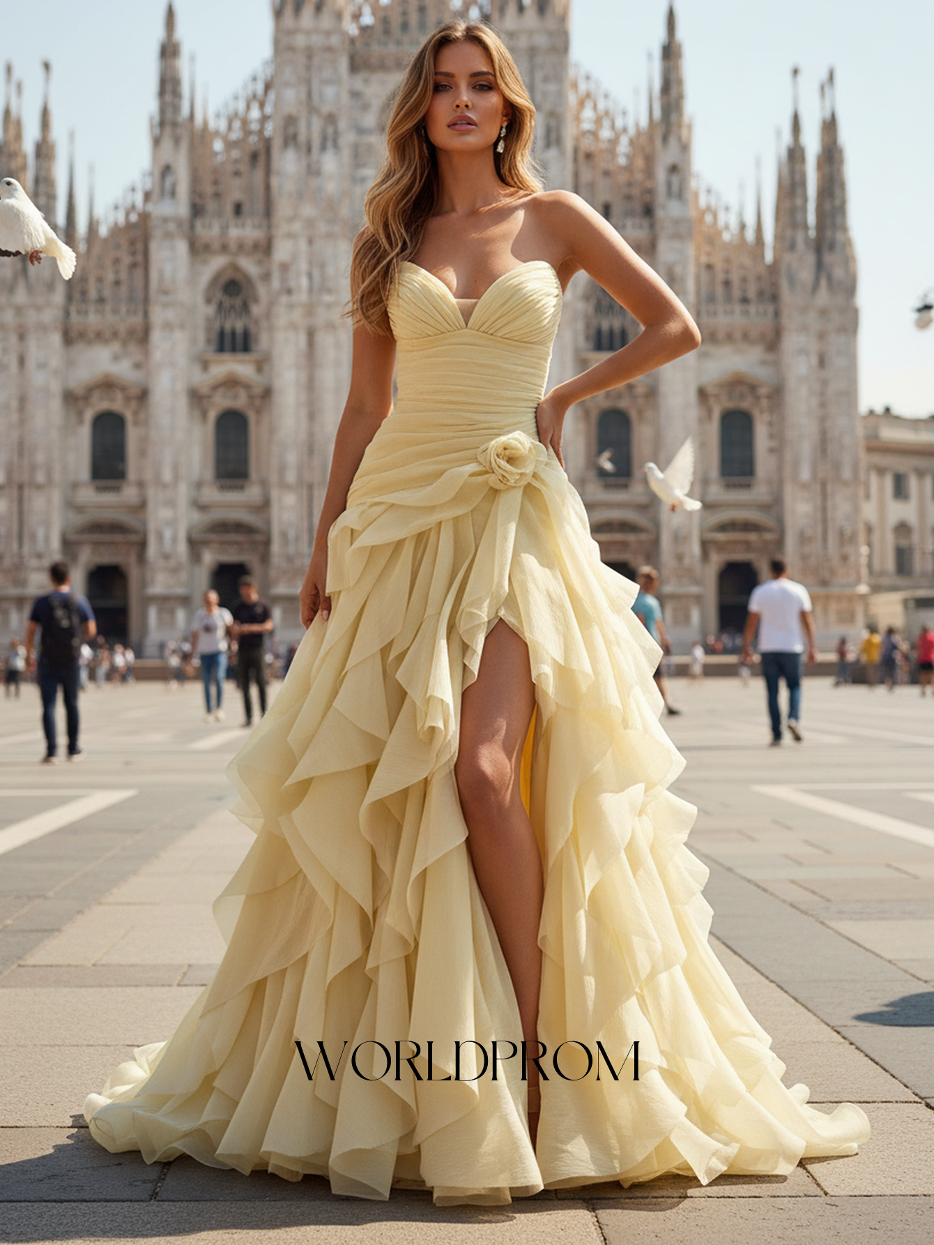 3D Flowers Pleated Long Layered Ruffle Hem Long Mermaid Prom Dress With Slit - Goose Yellow