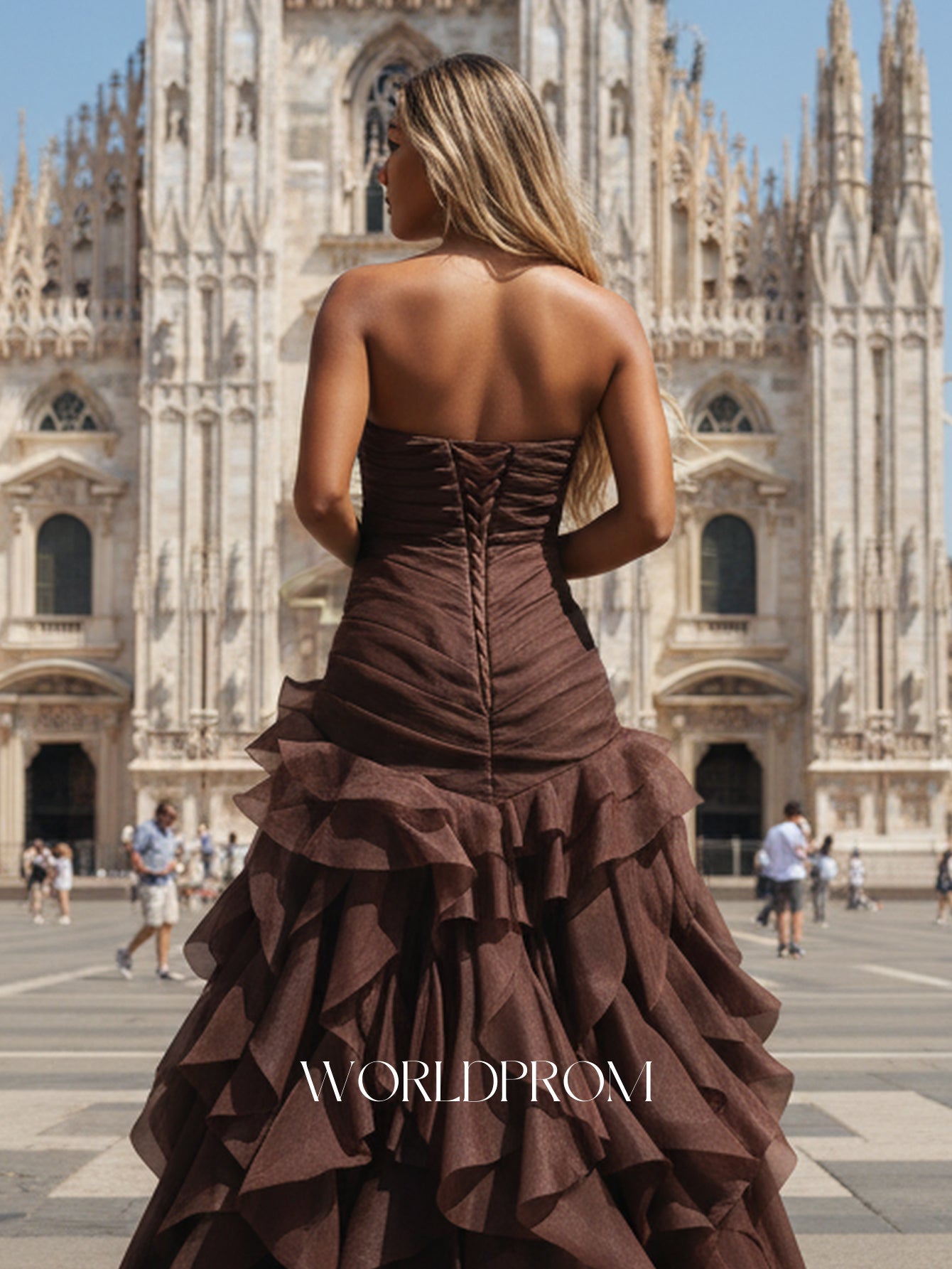 3D Flowers Pleated Long Layered Ruffle Hem Long Mermaid Prom Dress With Slit - Brown