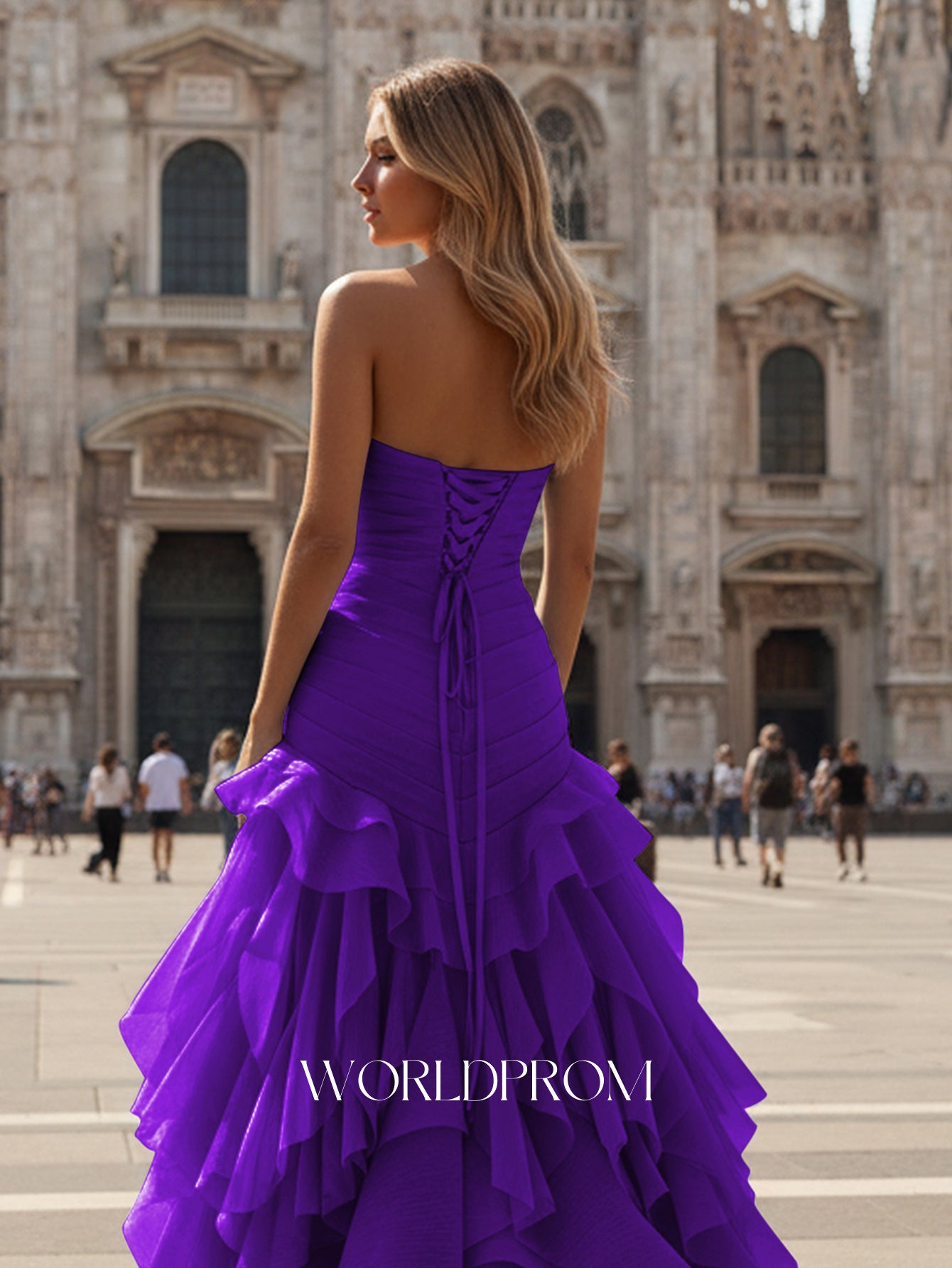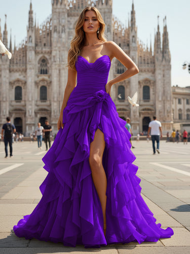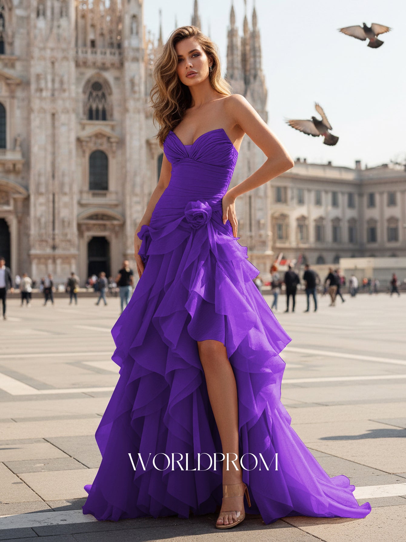 3D Flowers Pleated Long Layered Ruffle Hem Long Mermaid Prom Dress With Slit - Purple