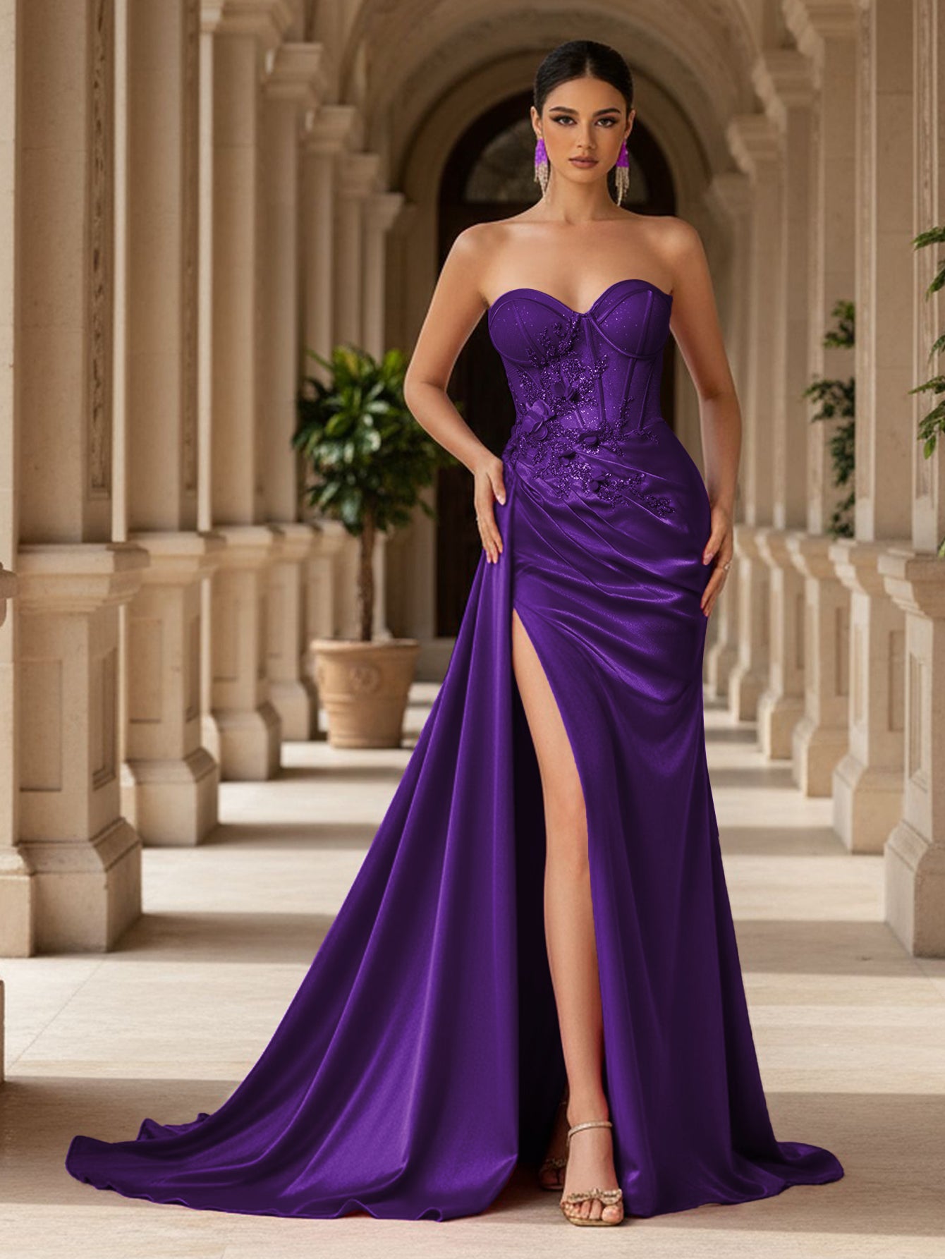 This satin prom gown features 3d rose on the illusion bodice. The strapless sexy evening dress has a sweetheart neckline and waist drop hem. This mermaid formal dress is ideal for party, evening or festivals.
