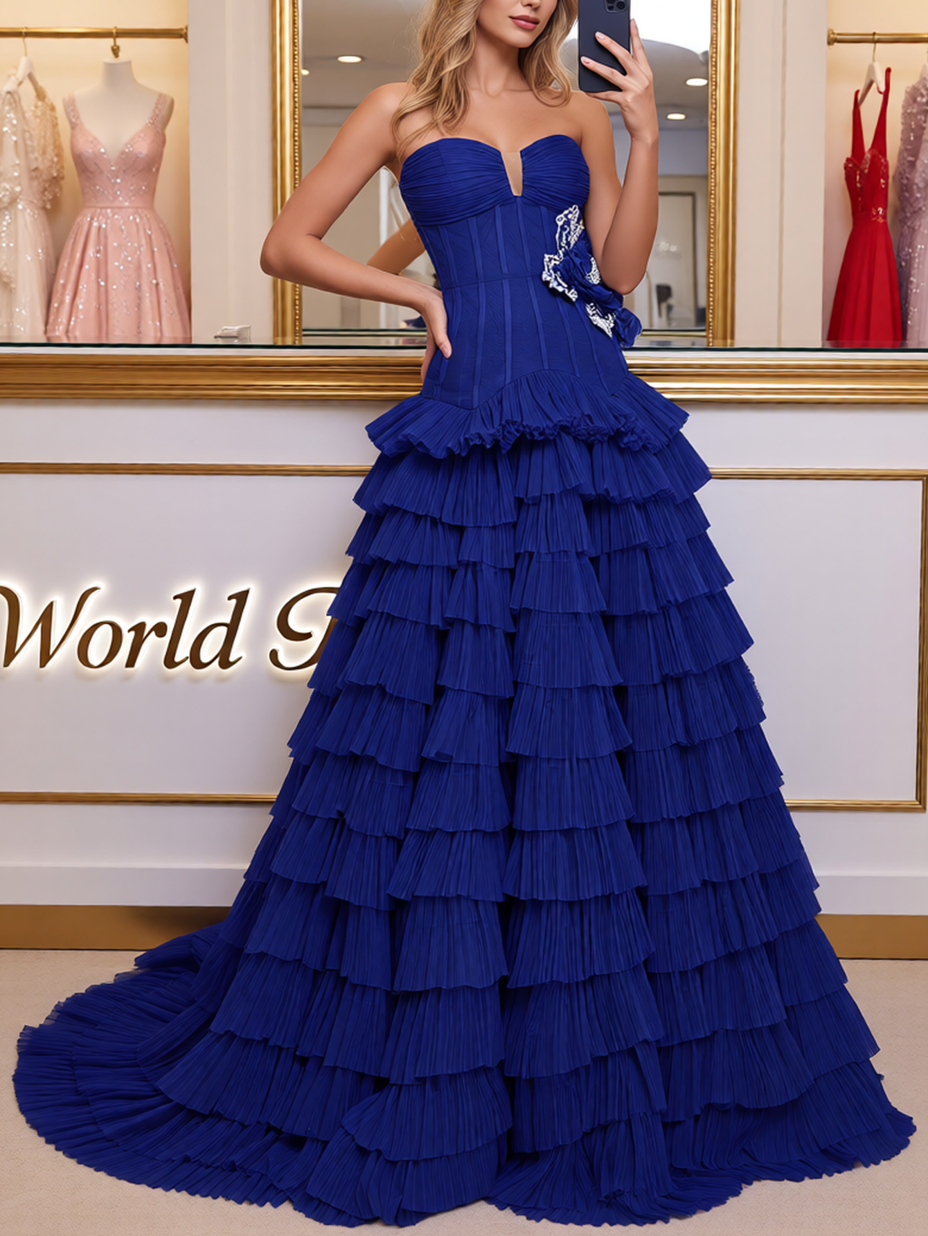 This royal blue evening ball gown features tulle with 3d rose on the bodice. The strapless prom gown has a sweetheart neck and layered ruffle hem. This luxury dubai evening gown is ideal for party, evening or homecoming events.